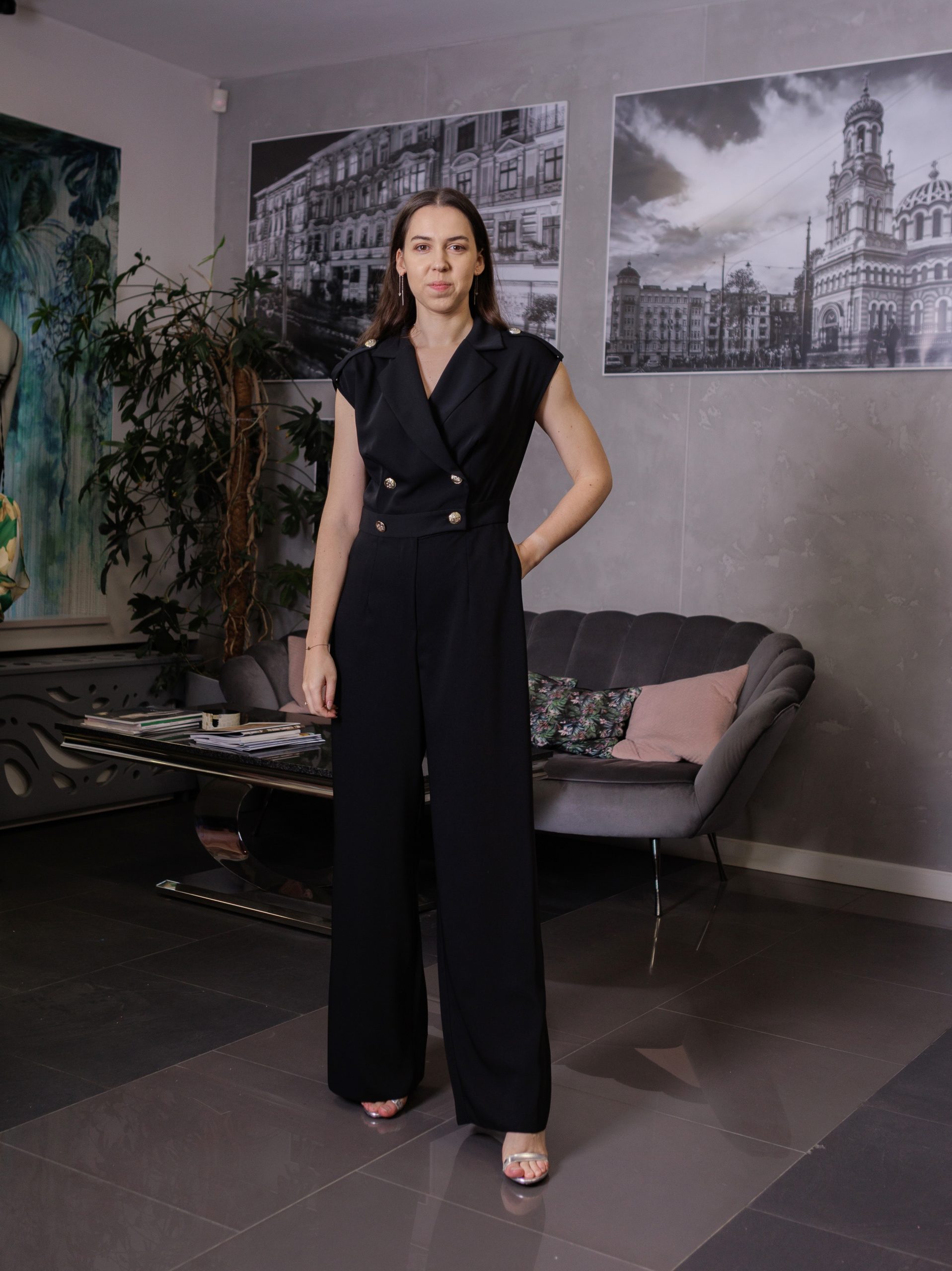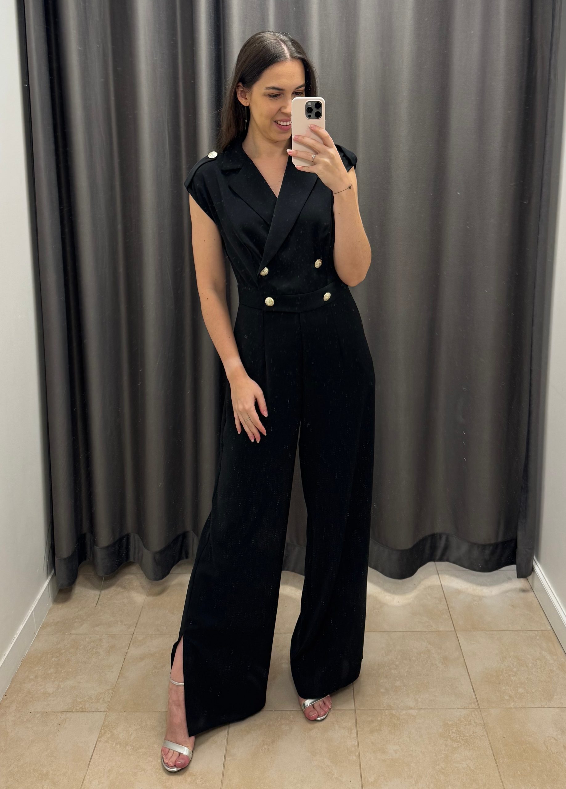 Elegancki kombinezon luźną, rozszerzaną nogawką. Góra kombinezonu na zakładkę, z klapami i z dekoltem w literkę V. Jest zapinana na dwa, ozdobne, złote guziki. Krótki rękaw osłaniający ramiona z ozdobnymi guziczkami. Plecy zasłonięte. Spodnie luźne, zwiewne, rozszerzane, z zapięciem na zamek z przodu. Subtelne rozcięcie z boku łydki – pięknie układają się w ruchu. Dodatkowo kombinezon posiada praktyczne kieszenie.