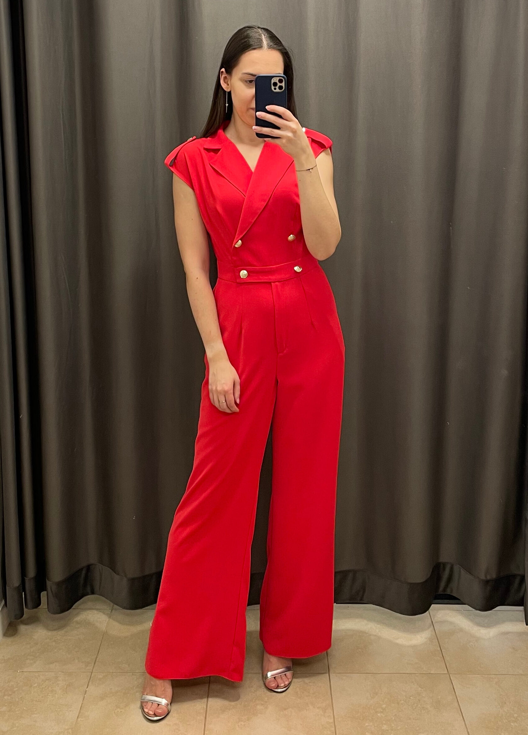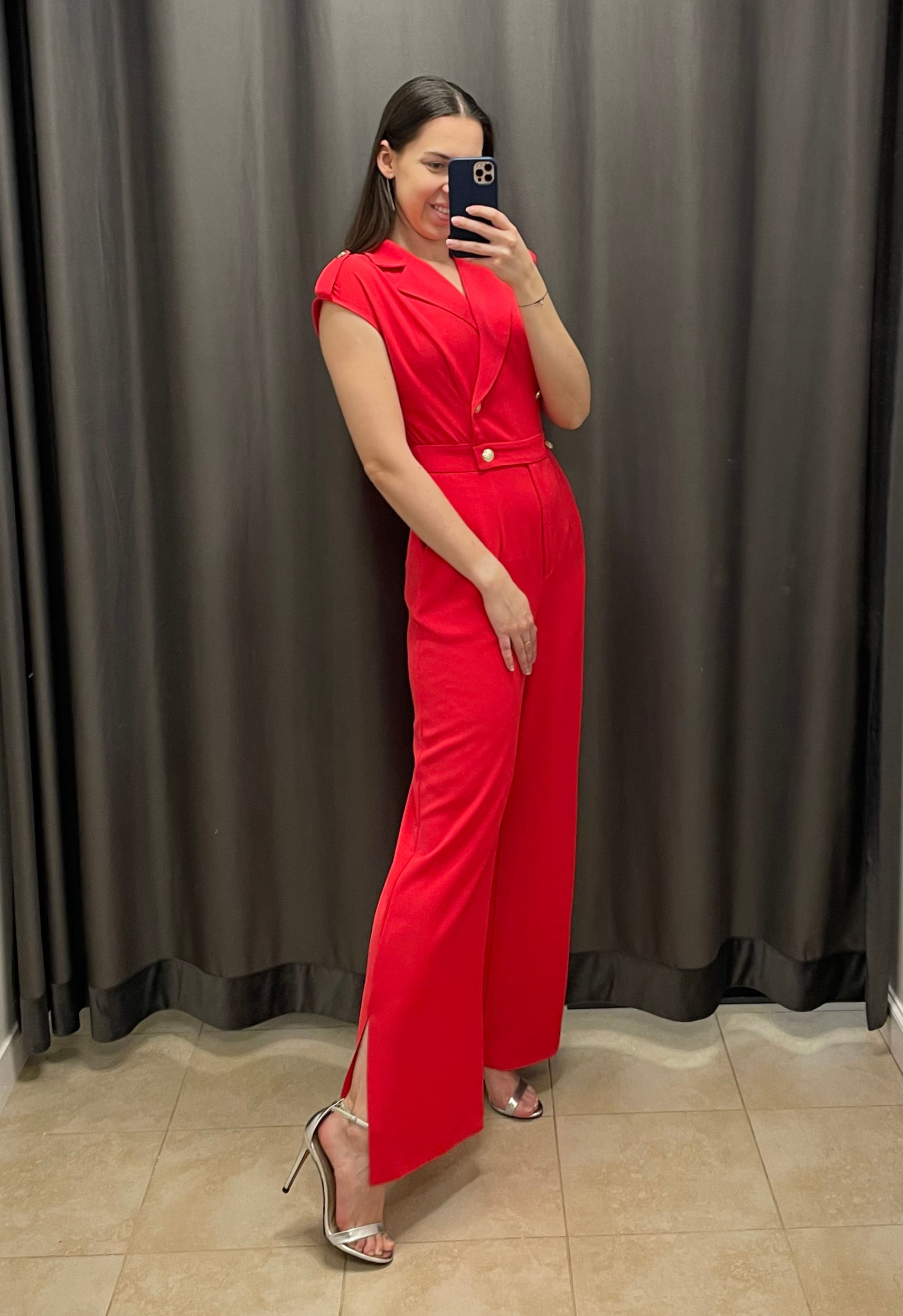 Elegancki kombinezon luźną, rozszerzaną nogawką. Góra kombinezonu na zakładkę, z klapami i z dekoltem w literkę V. Jest zapinana na dwa, ozdobne, złote guziki. Krótki rękaw osłaniający ramiona z ozdobnymi guziczkami. Plecy zasłonięte. Spodnie luźne, zwiewne, rozszerzane, z zapięciem na zamek z przodu. Subtelne rozcięcie z boku łydki – pięknie układają się w ruchu. Dodatkowo kombinezon posiada praktyczne kieszenie.