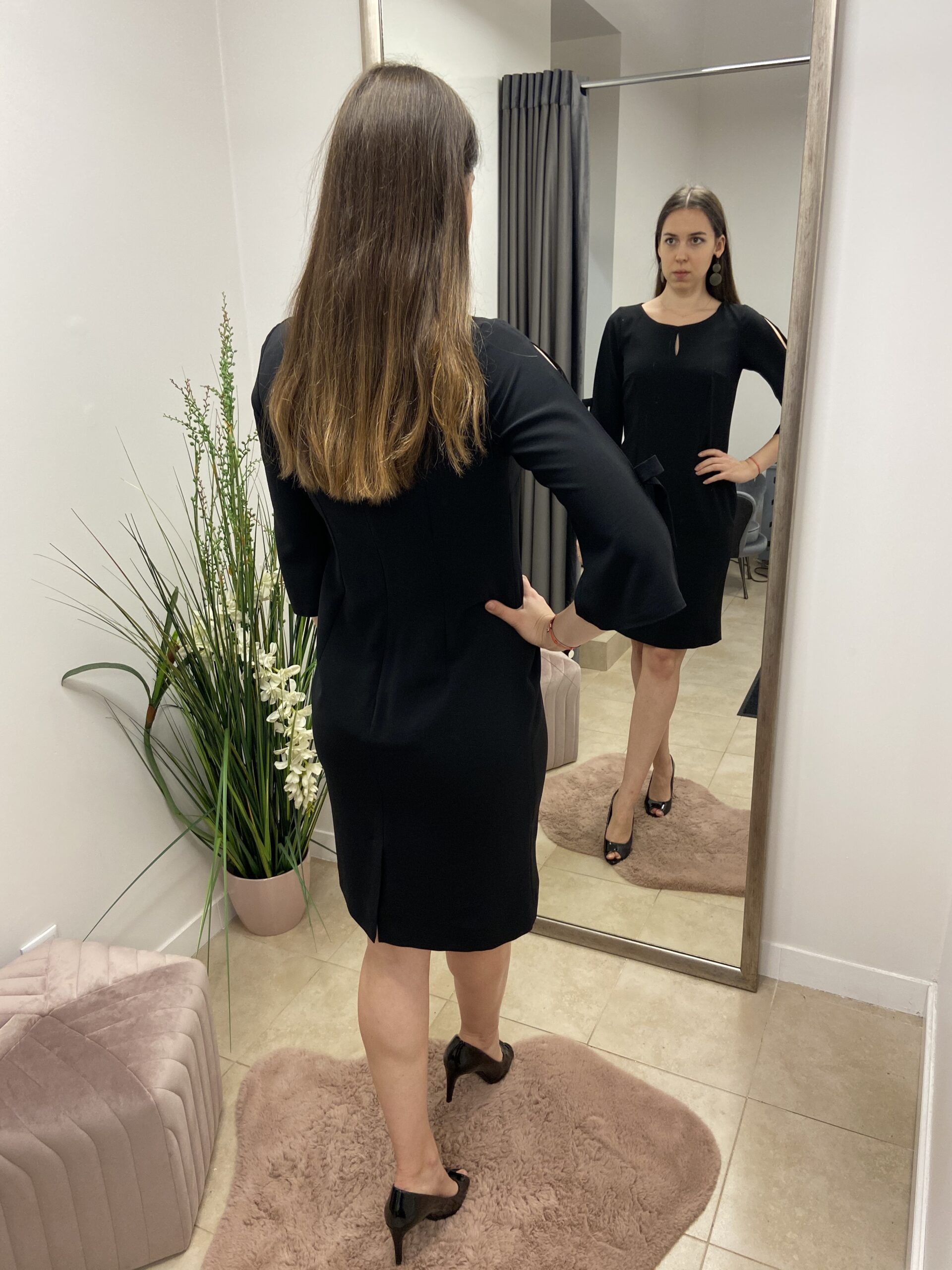 Sukienka ołówkowa z rękawem 3/4 z rozcięciami i zdobieniami w formie kokardek.