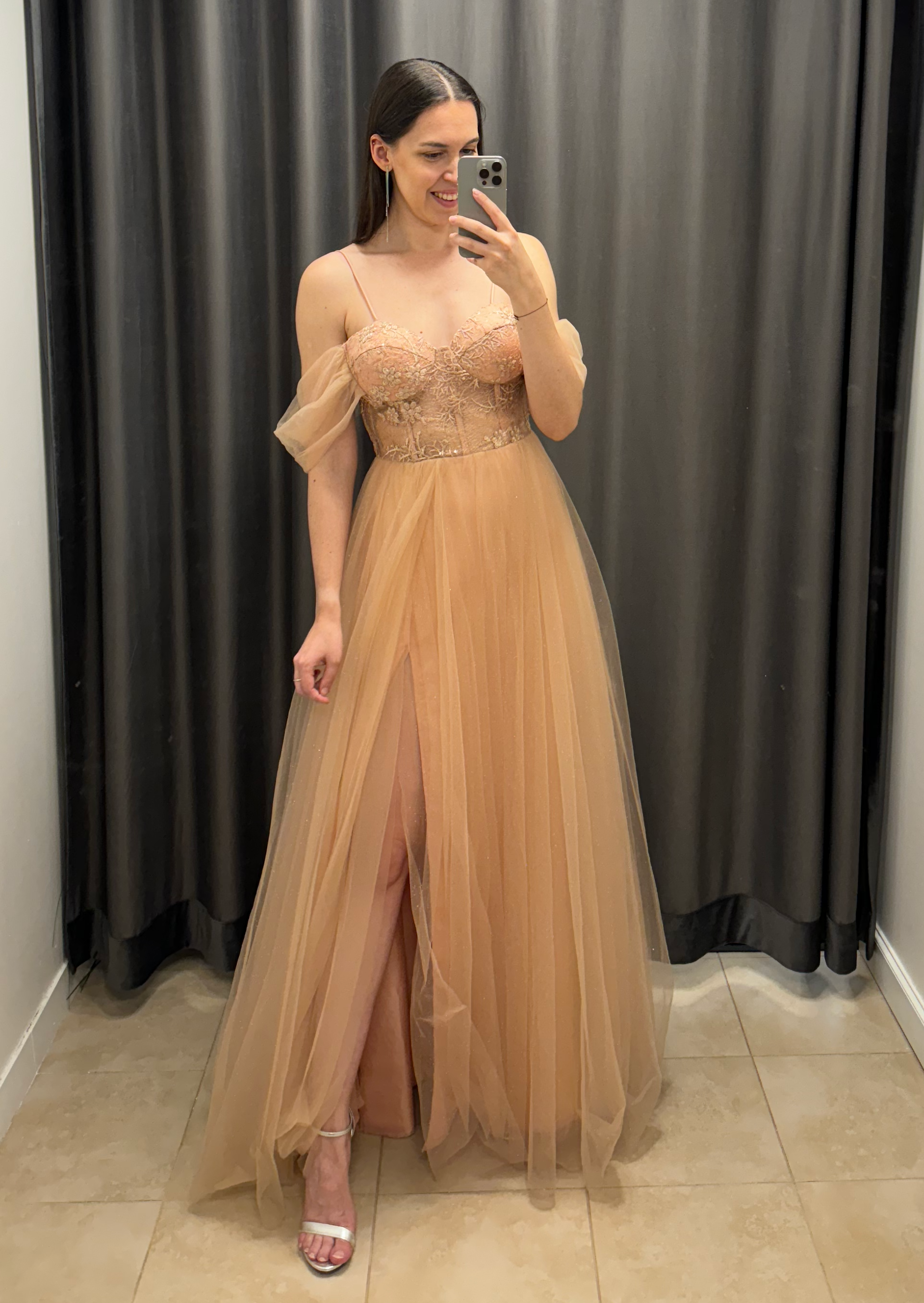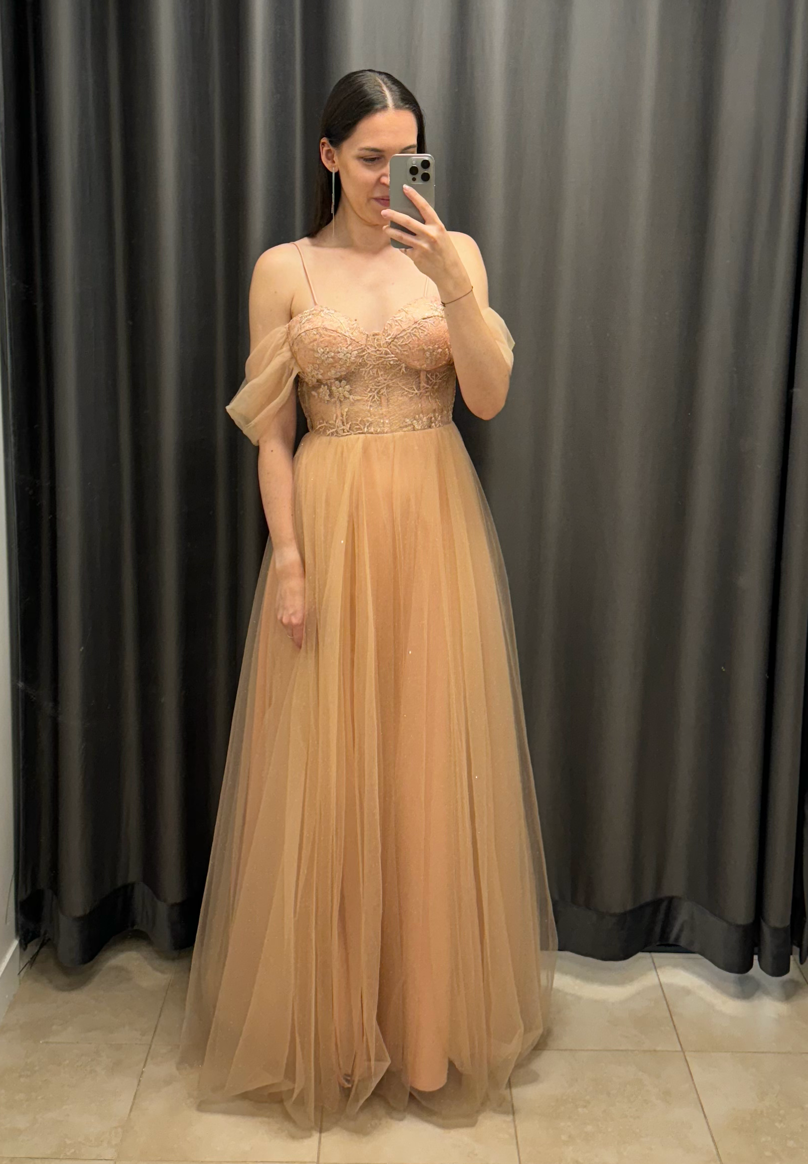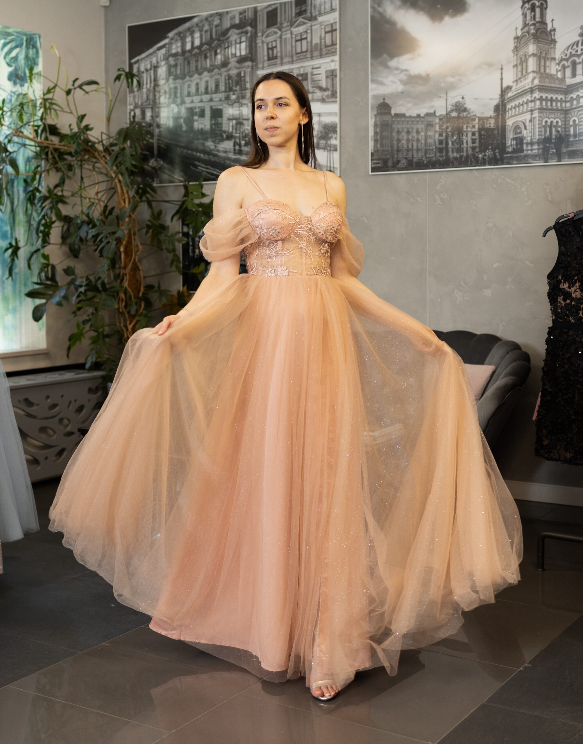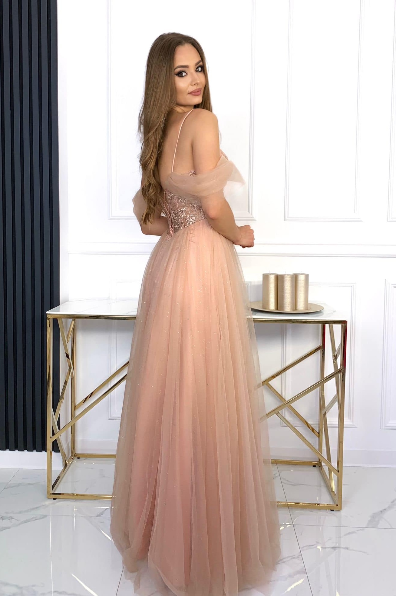 Efektowna gorsetowa, tiulowa sukienka maxi. Sukienka posiada dopasowaną, zdobioną, lekko transparentną górę wzmacnianą fiszbinami. Tył sznurowany, pięknie eksponuje plecy. Cienkie ramiączka oraz dodatkowe, delikatne, opadające, tiulowe szerokie ramiączka, które lekko przysłaniają ramiona. Od talii sukienka jest mocno rozkloszowana dając efekt księżniczki. Dół wykonany z lekkiego, miękkiego tiulu z subtelnym brokatem. Sukienka posiada również efektowne, głębokie rozcięcie na nogę.