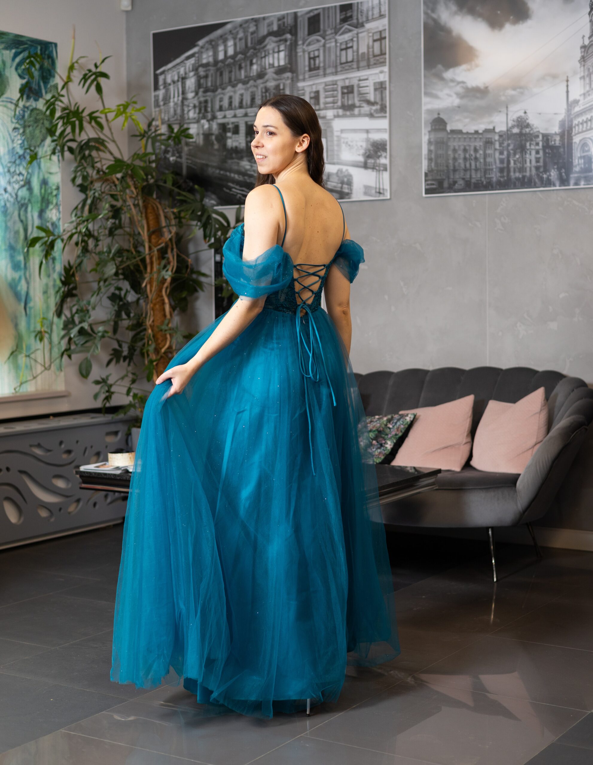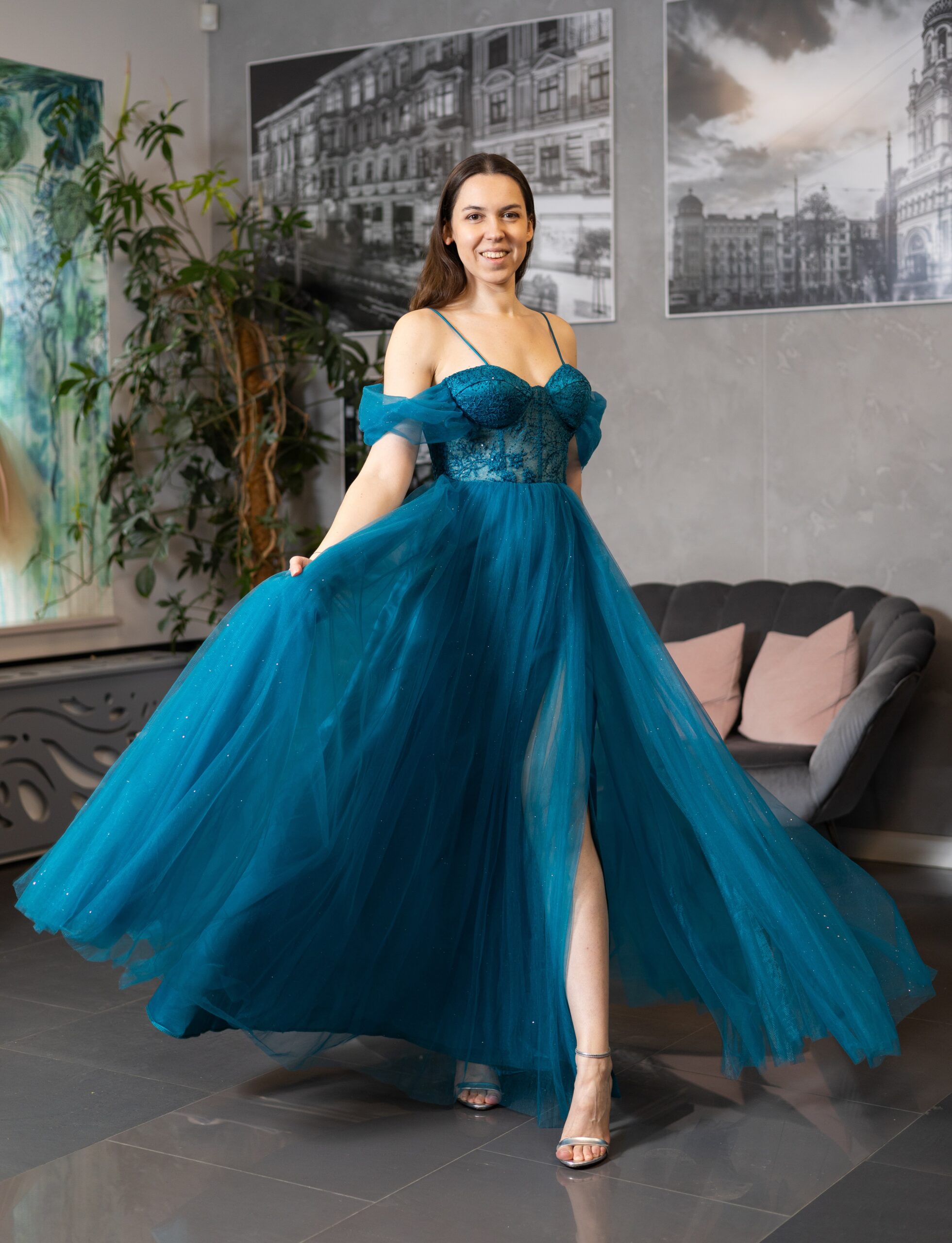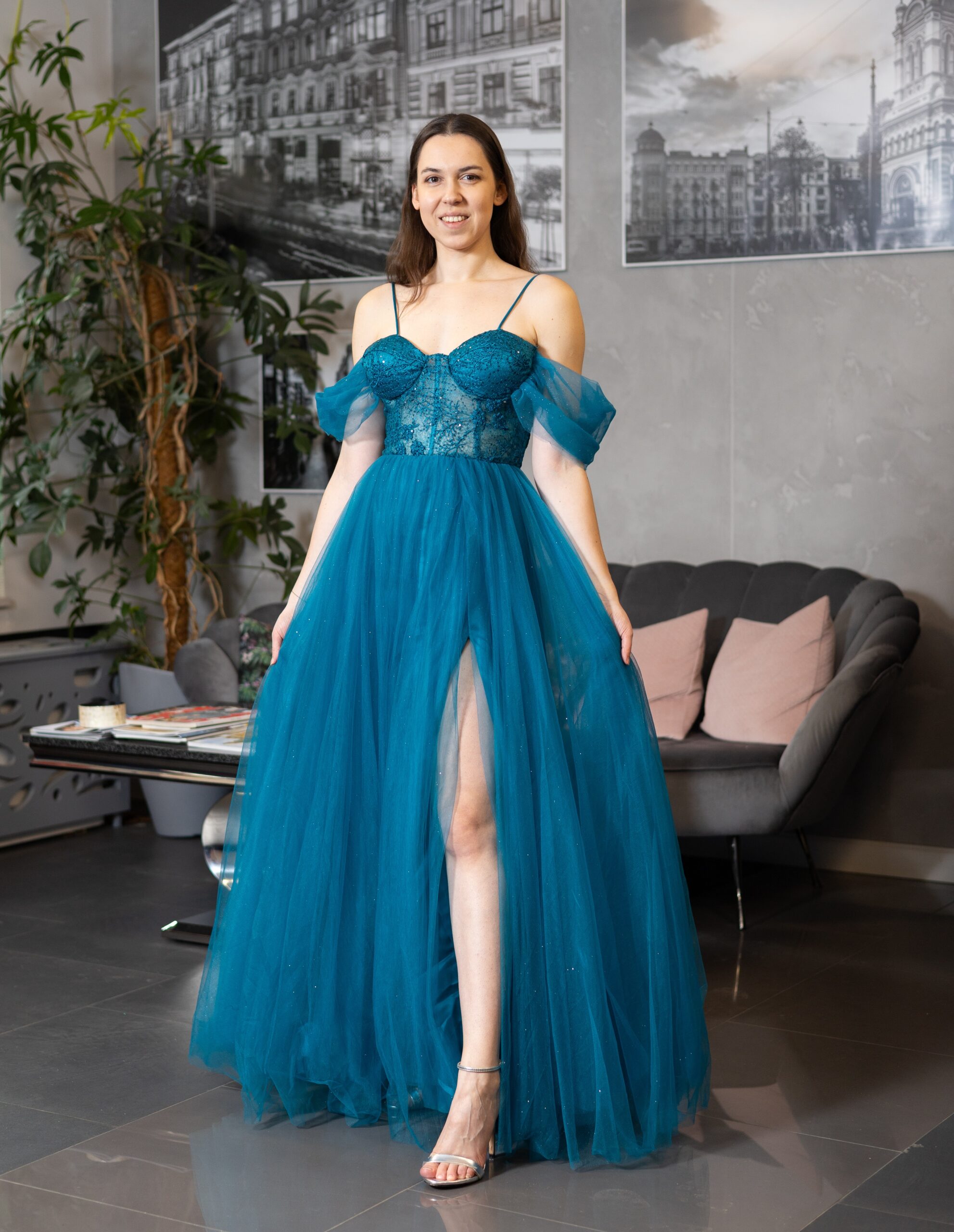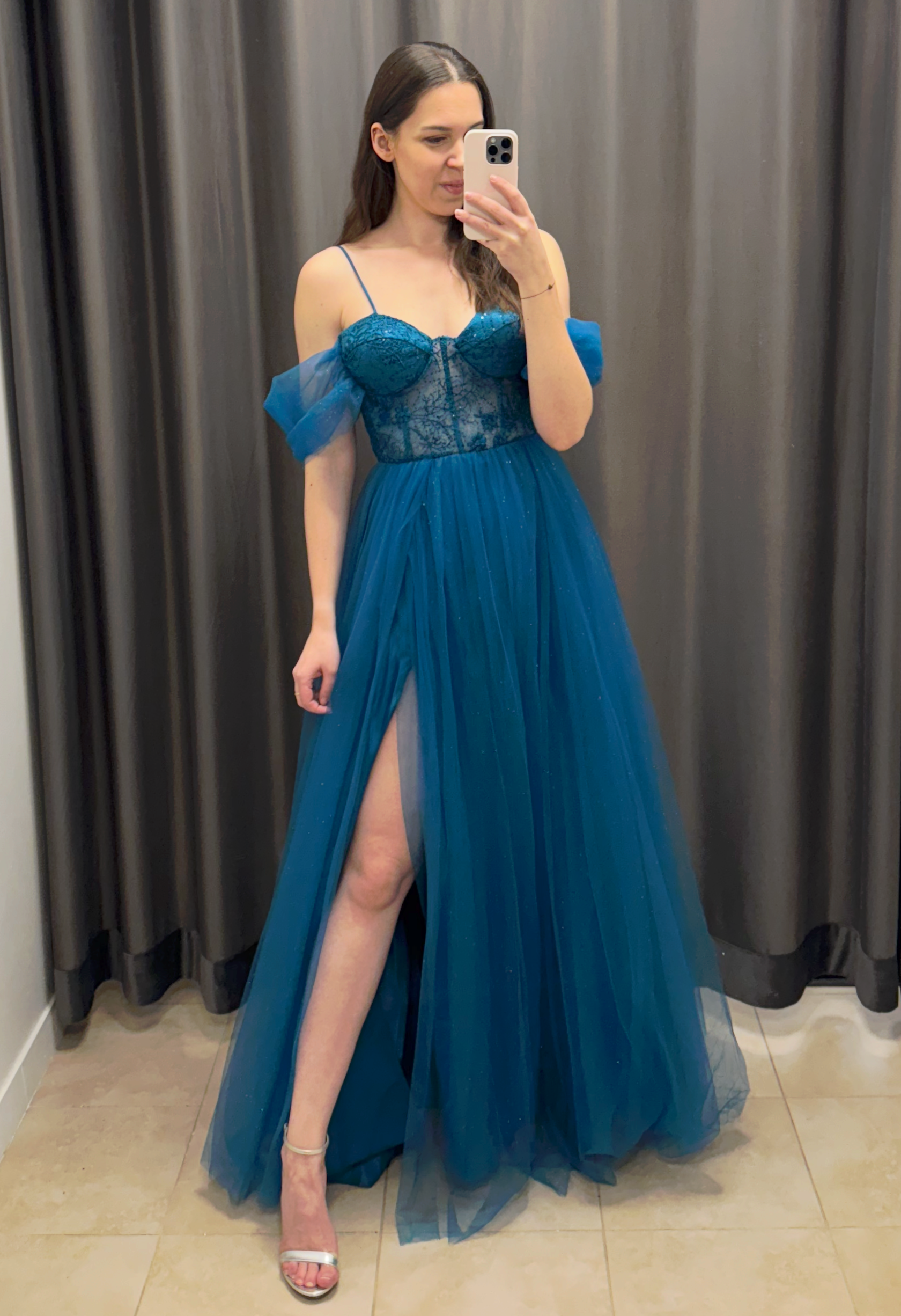 Efektowna gorsetowa, tiulowa sukienka maxi. Sukienka posiada dopasowaną, zdobioną, lekko transparentną górę wzmacnianą fiszbinami. Tył sznurowany, pięknie eksponuje plecy. Cienkie ramiączka oraz dodatkowe, delikatne, opadające, tiulowe szerokie ramiączka, które lekko przysłaniają ramiona. Od talii sukienka jest mocno rozkloszowana dając efekt księżniczki. Dół wykonany z lekkiego, miękkiego tiulu z subtelnym brokatem. Sukienka posiada również efektowne, głębokie rozcięcie na nogę.