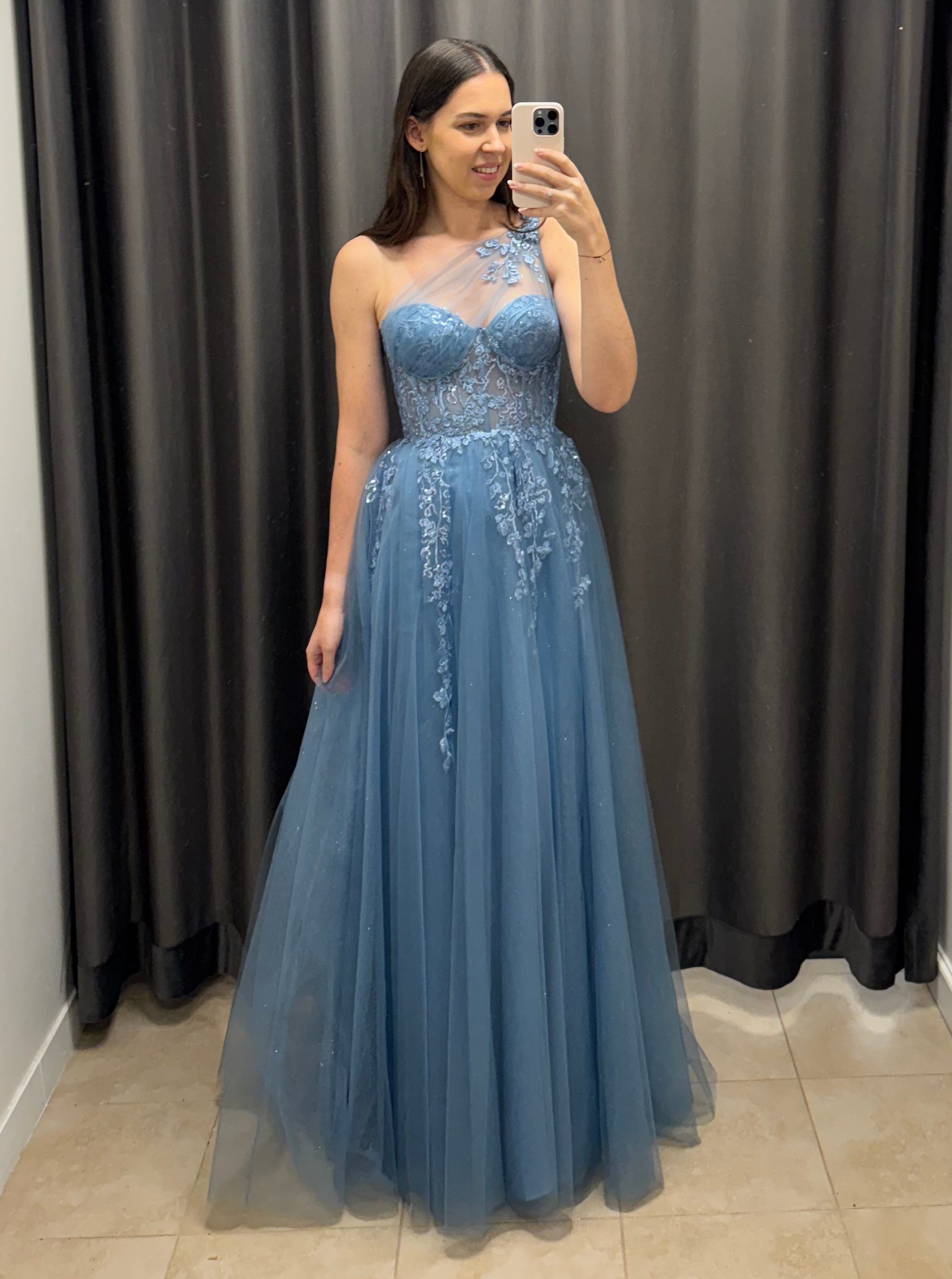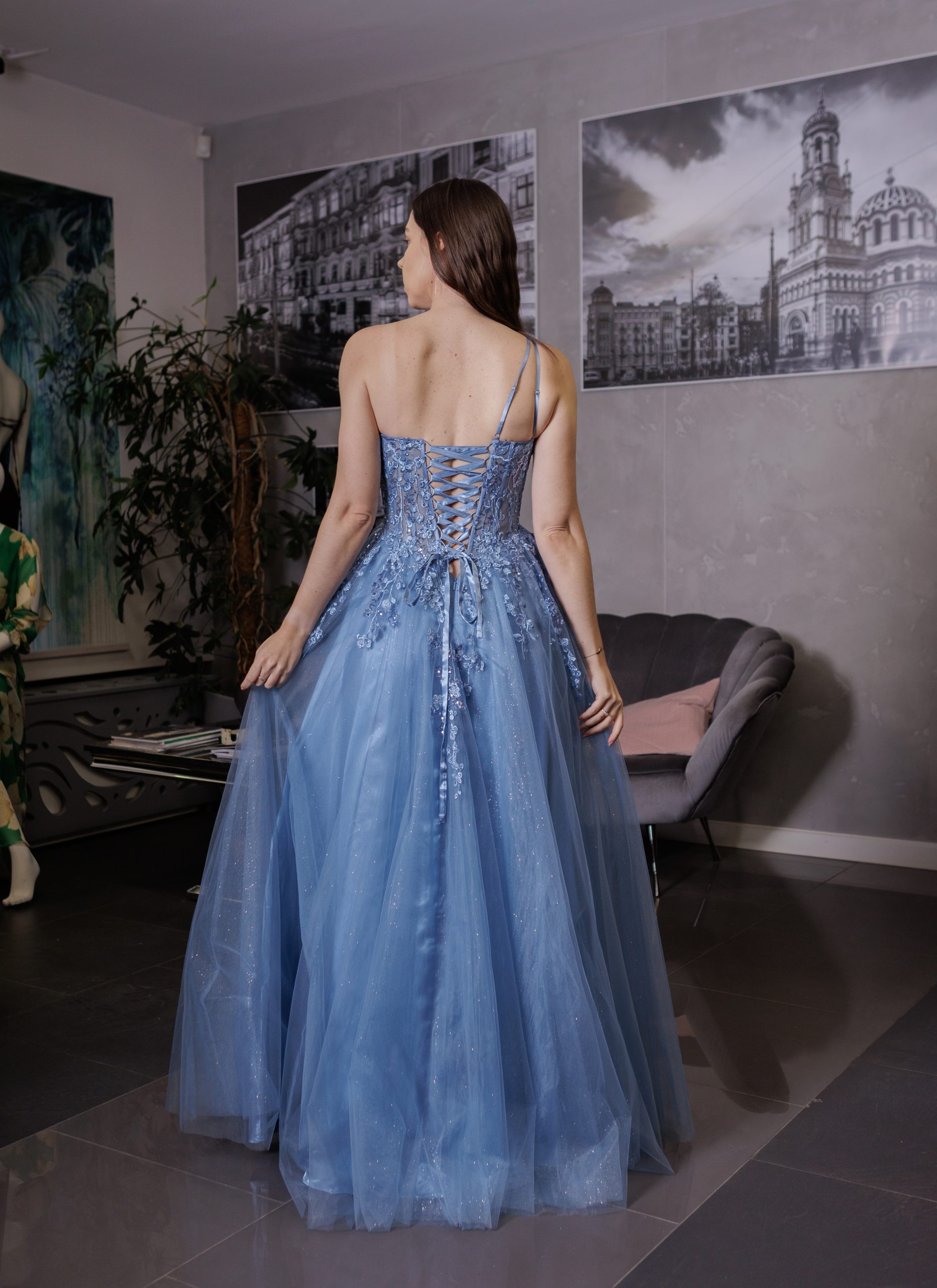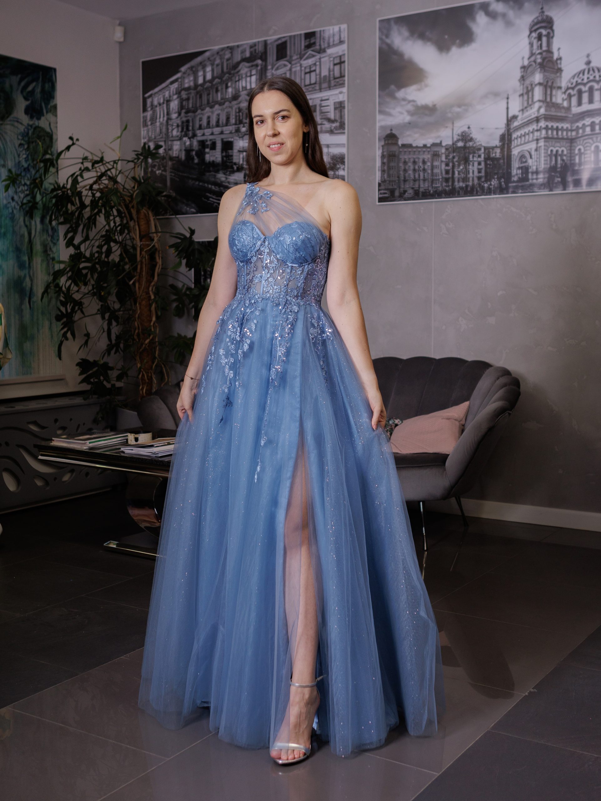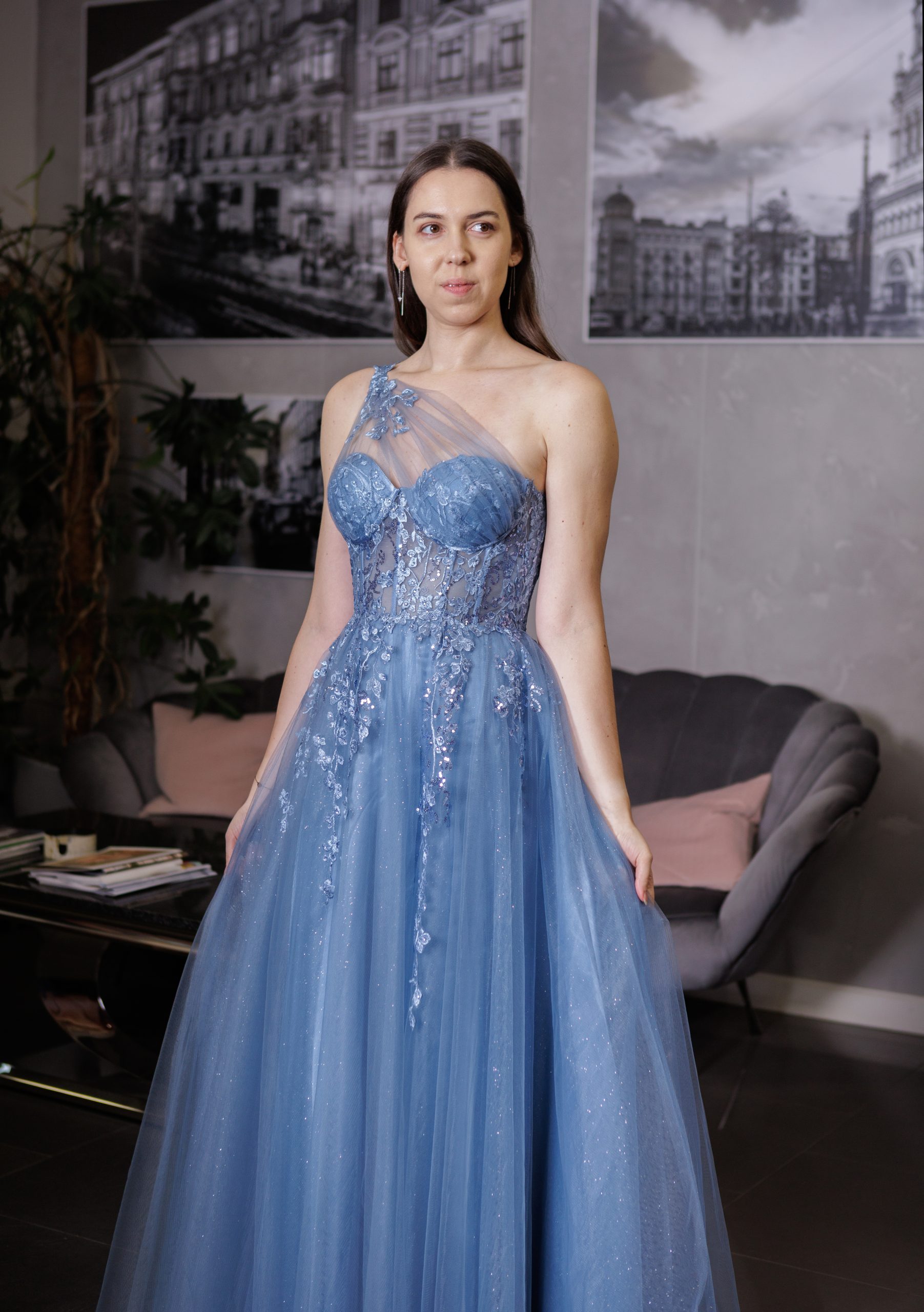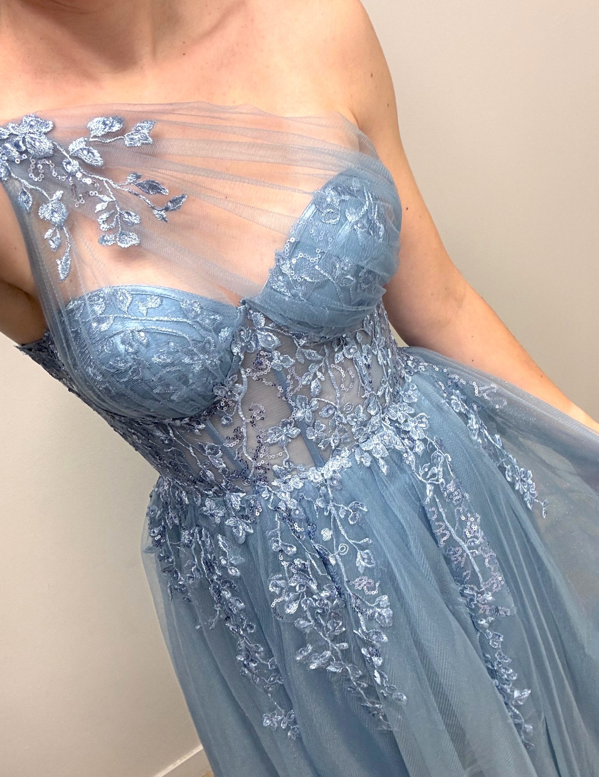 Efektowna gorsetowa, tiulowa sukienka maxi na jedno ramię z kwiatami 3D. Sukienka posiada dopasowaną, zdobioną kwiatkami, lekko transparentną górę wzmacnianą fiszbinami. Cienka warstwa tiulu została dodatkowo poprowadzona od miseczek i zebrana w ozdobny sposób na jednym ramieniu. Od talii sukienka jest mocno rozkloszowana dając efekt księżniczki. Dół wykonany z warstwy mocno brokatowego materiału oraz lekkiego, miękkiego tiulu. Tiul przedłużony w formie trenu. Sukienka posiada również efektowne, głębokie rozcięcie na nogę.