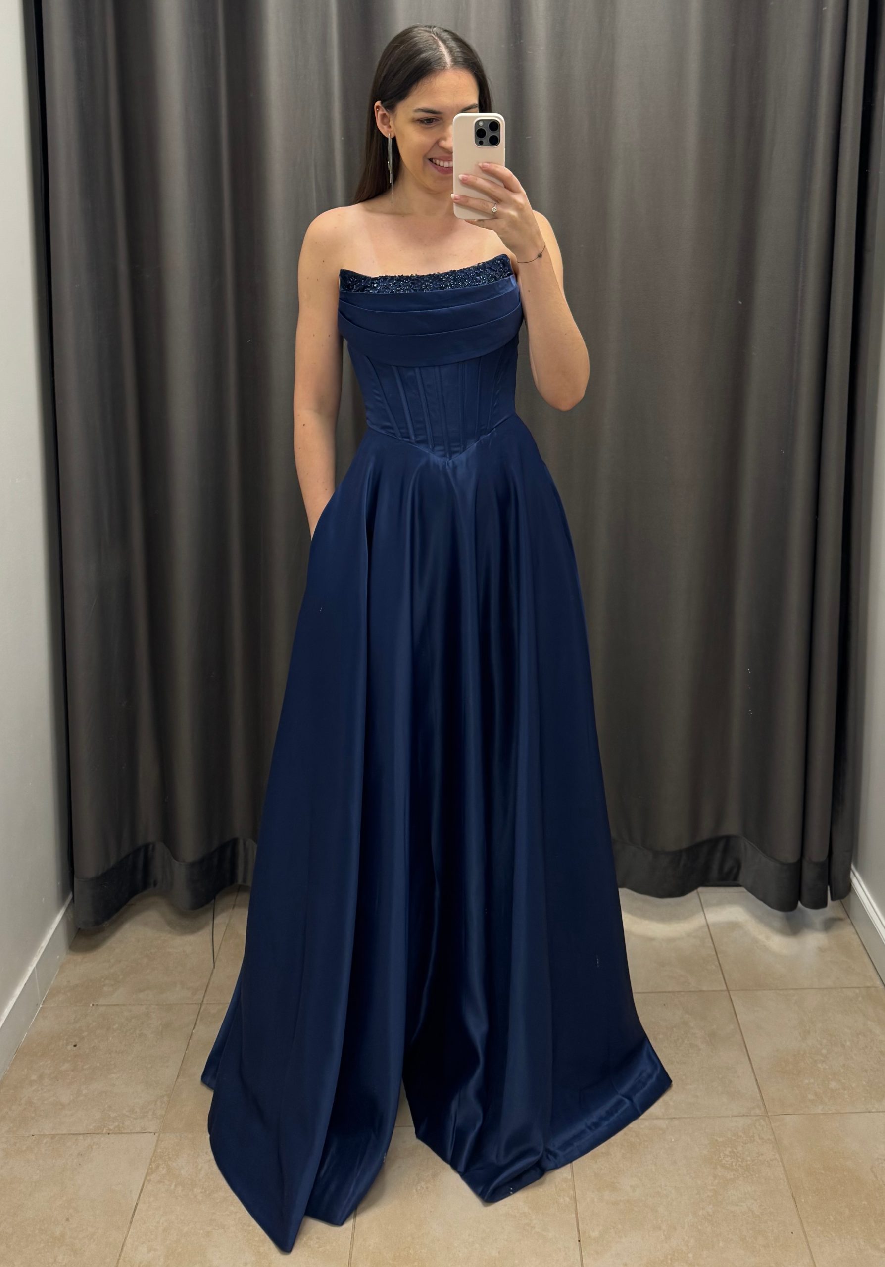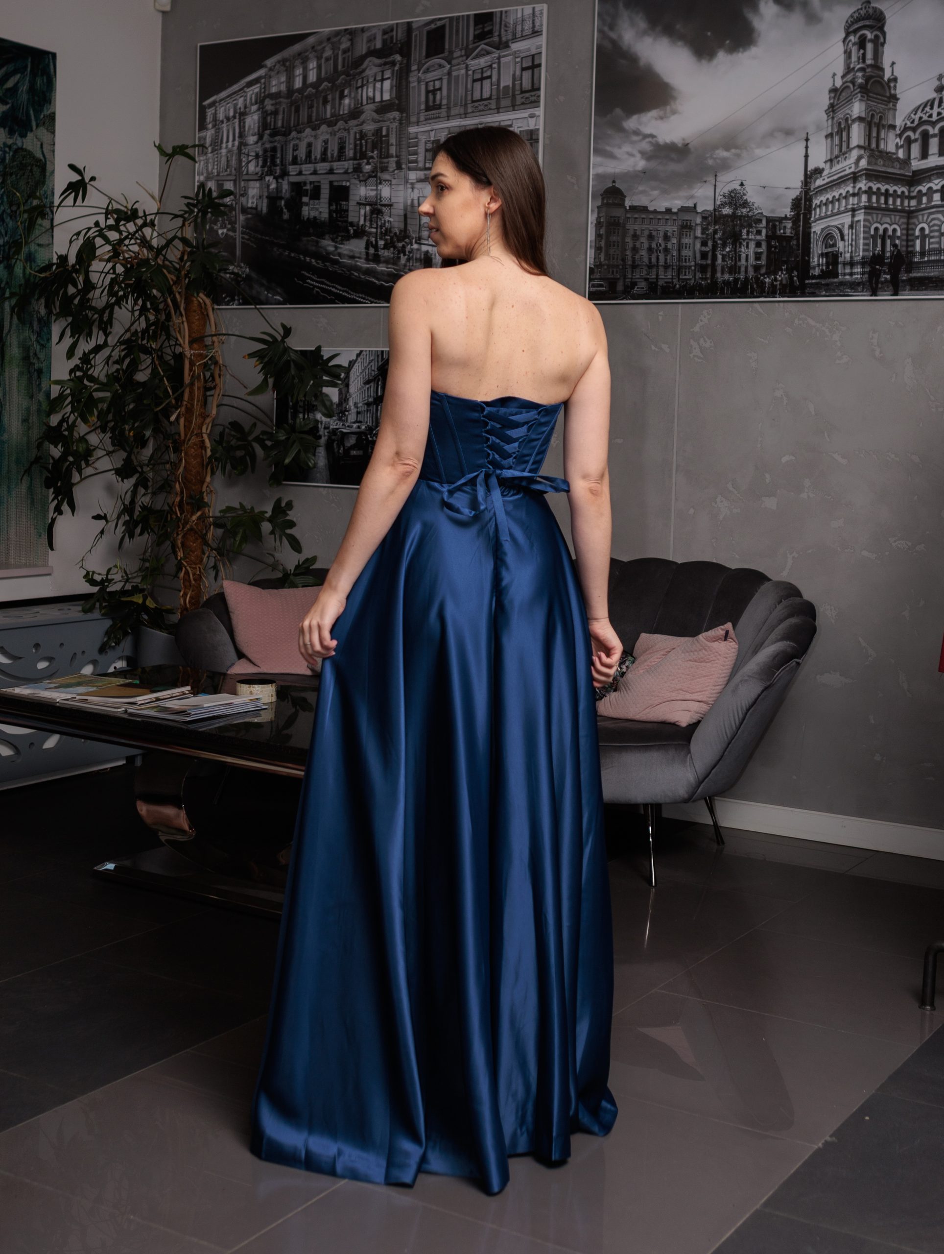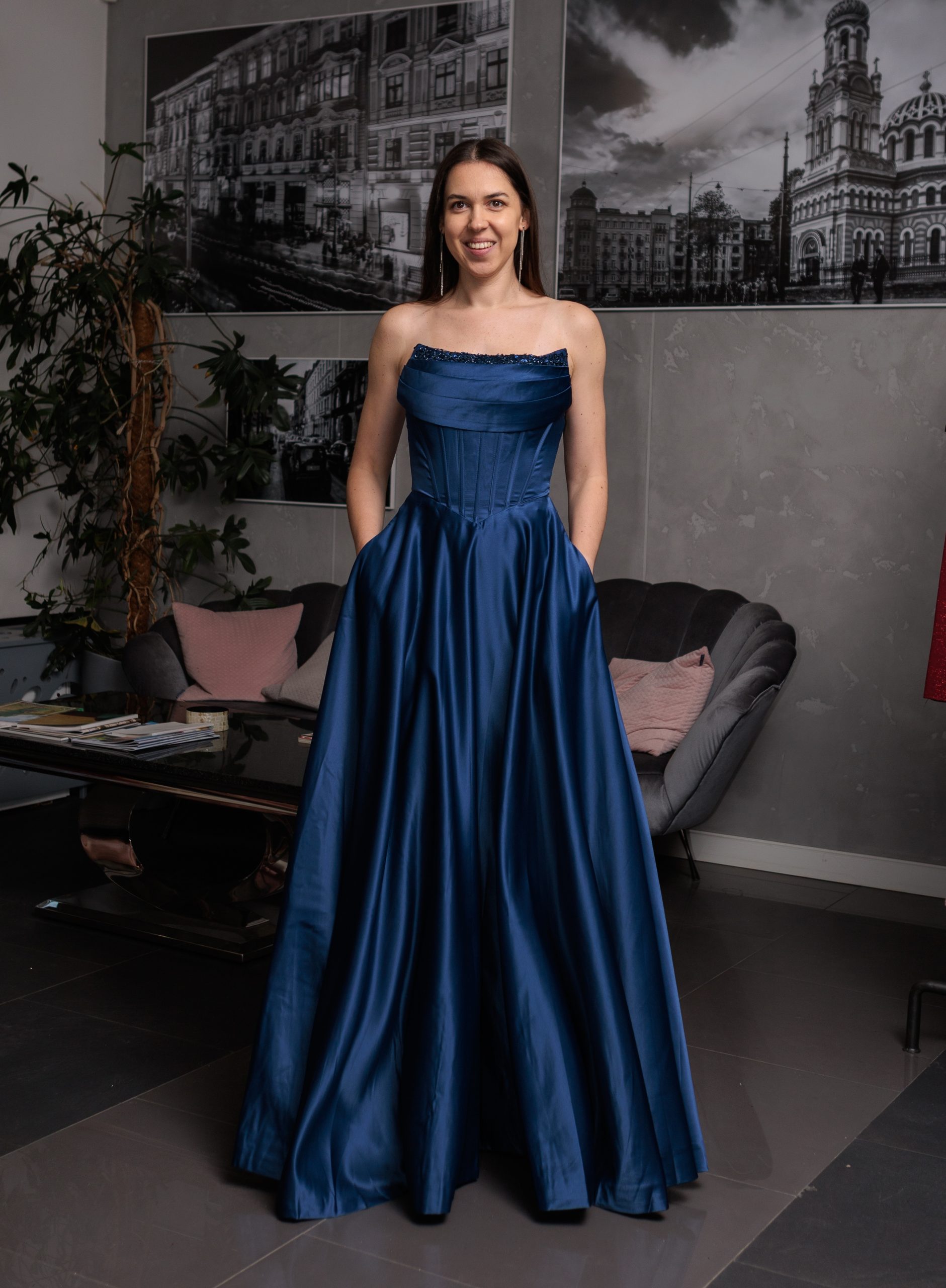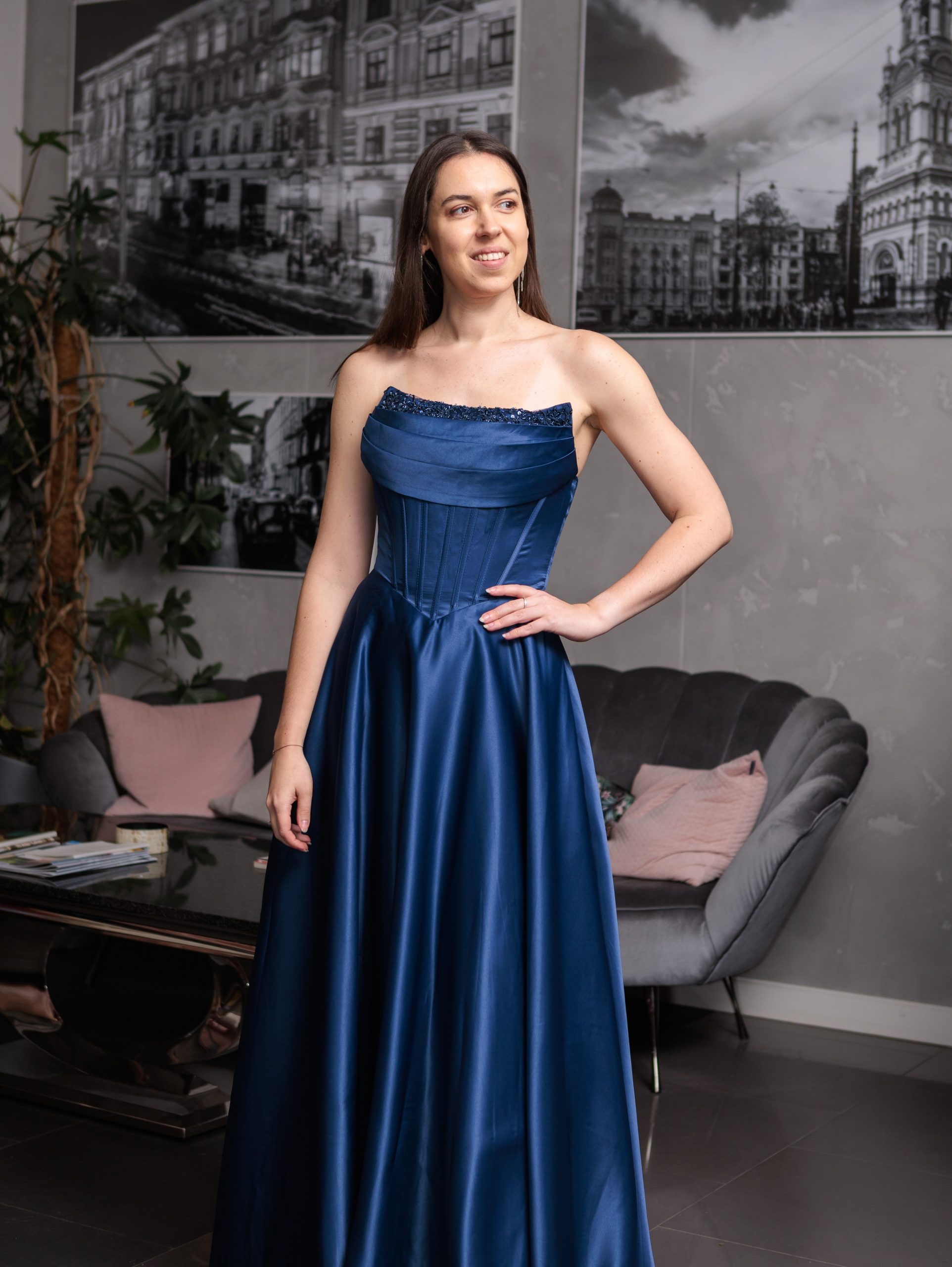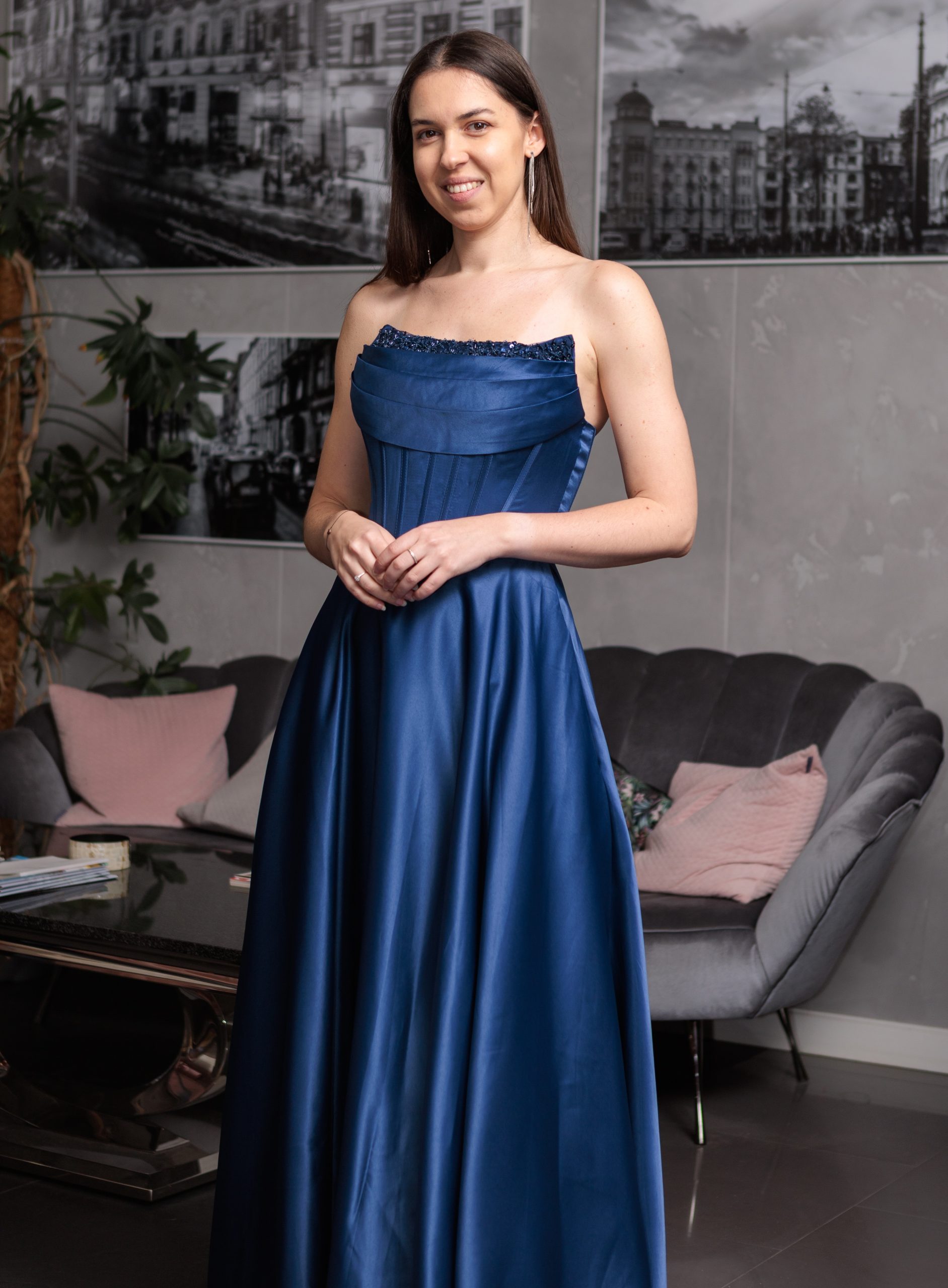 Długa, satynowa sukienka gorsetowa. Sukienka z gorsetem wiązanym na plecach. Gorset jest mocno dopasowany, z fiszbinami, góra zdobiona cekinami i koralikami przykryta dodatkowymi zaszewkami. Zarówno gorsetem można dostosować rozmiar do siebie, tak aby sukienka leżała perfekcyjnie. Świetnie sprawdzi się również przy większym biuście. W zestawie odpinane, cienkie ramiączka silikonowe. Dół luźny, lejący. Sukienka posiada praktyczne kieszenie. Satynowy materiał wysokiej jakości.
