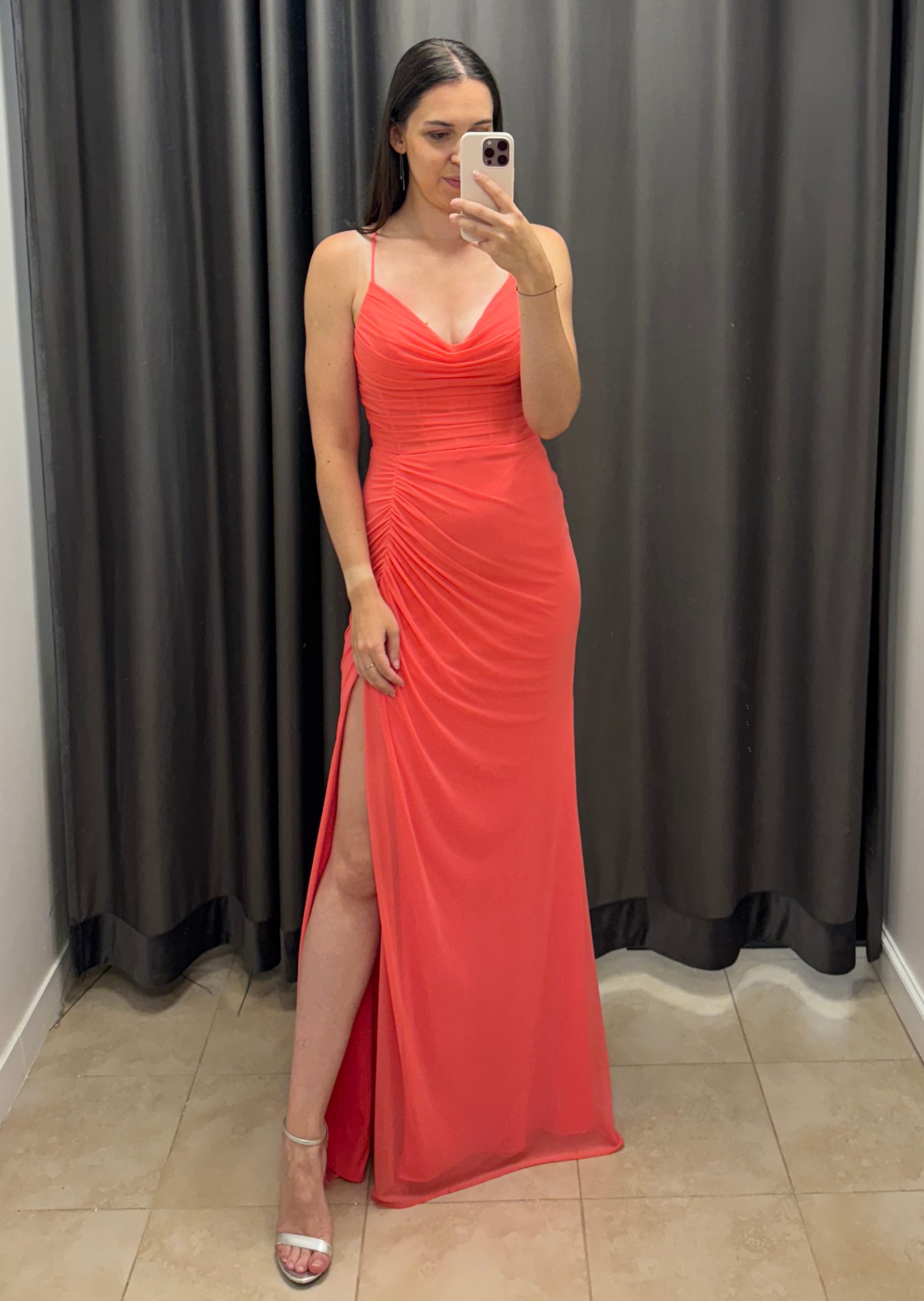 Długa sukienka gorsetowa o dopasowanym fasonie syrenki. Sukienka na cienkich ramiączkach z dopasowaną górą z marszczeniami. Dekolt w literę V. Wszyte miseczki. Rozmiar można świetnie dopasować dzięki wiązaniu na plecach. Dół dopasowany – krój typu „rybka”. Sukienka posiada rozcięcie na nogę oraz lekkie marszczenia pięknie modelujące sylwetkę. Tył przedłużony w formie trenu. Została wykonana z lekko elastycznego materiału z wierzchnią warstwą w formie delikatnej siateczki.