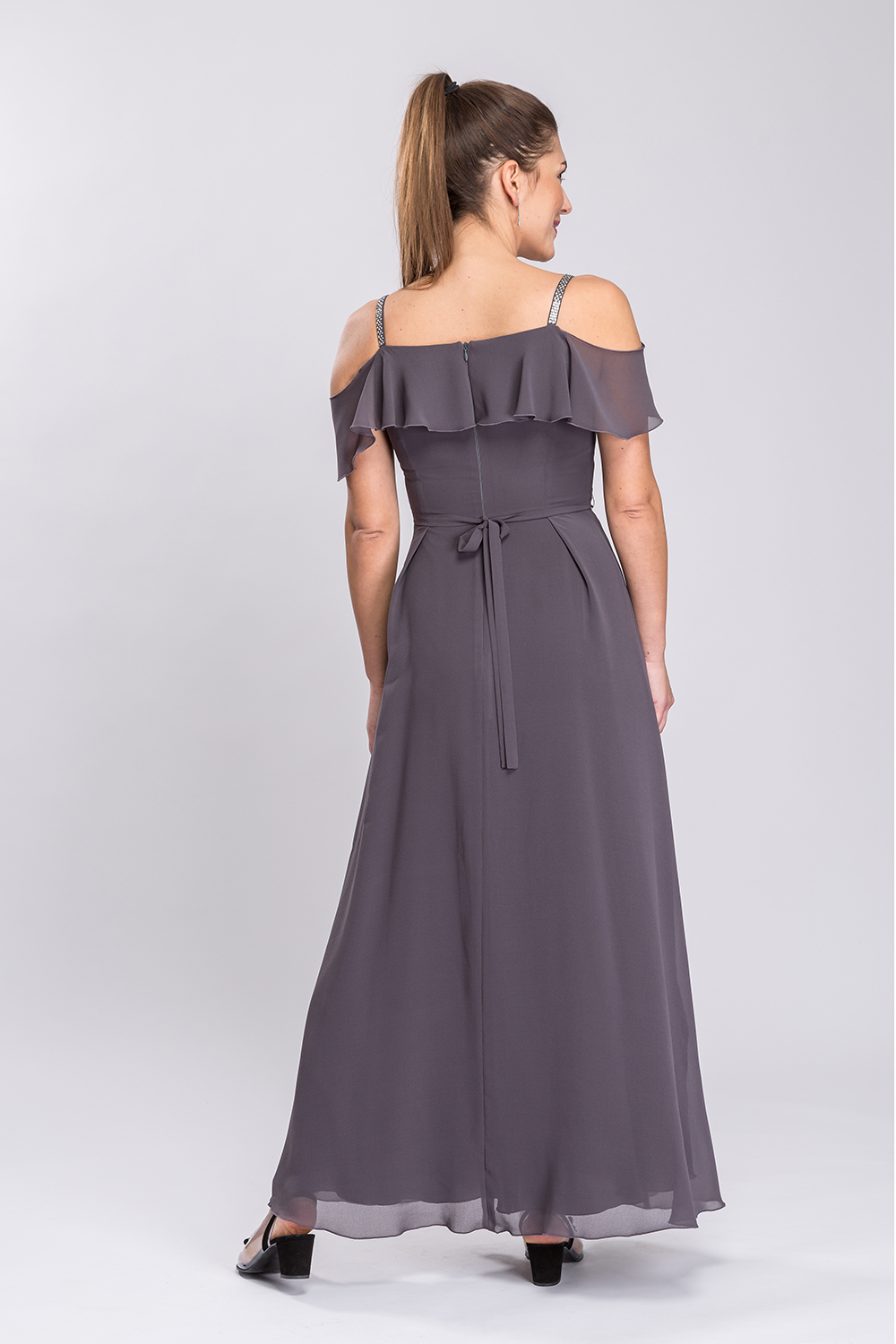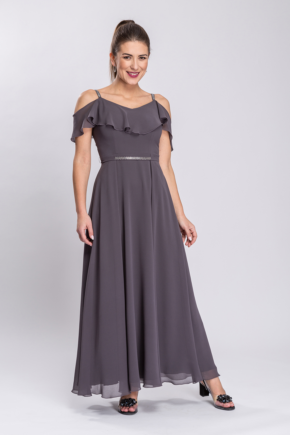 Długa sukienka wykonana z delikatnej żorżety. Ciekawy odcień szarości pięknie podkreślają kryształowe aplikacje umieszczone na naramkach oraz wąskim pasku. Góra wykończona zwiewną falbanką subtelnie osłaniającą ramiona. Falujący, rozkloszowany dół. W komplecie wąski paseczek żorżetowy umożliwiający dopasowanie sukienki do figury. Model pięknie wysmuklający sylwetkę. Z tyłu kryty zamek.