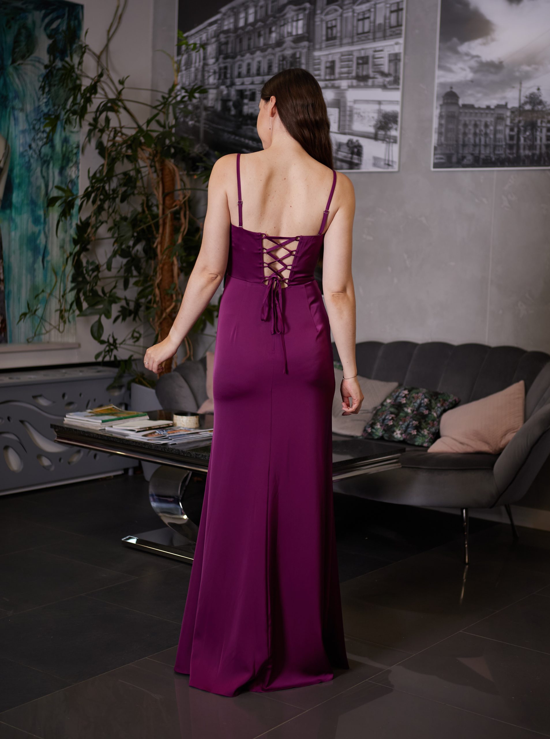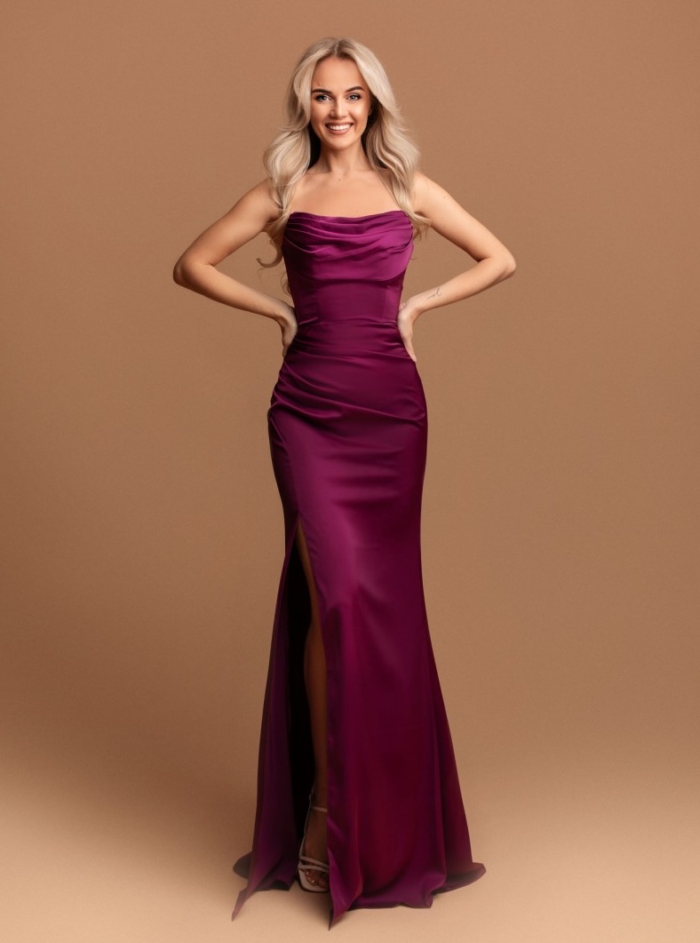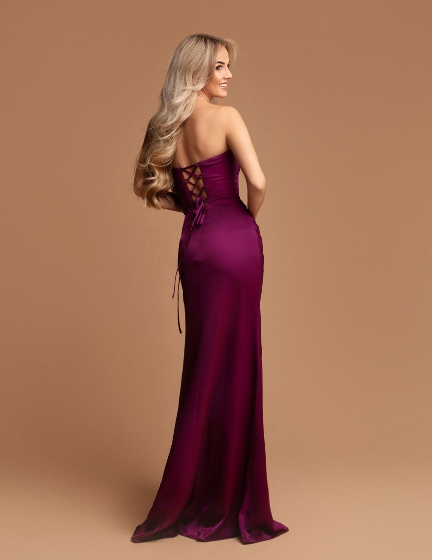 Długa, satynowa dopasowana sukienka gorsetowa. Sukienka posiada gorset wiązany na plecach. Dekolt typu woda. W zestawie dopinane ramiączka. Gorsetem można dostosować rozmiar do siebie, tak aby sukienka leżała perfekcyjnie. Dół prosty, dopasowany. Z boku znajduje się rozcięcie, które lekko odsłania i zdecydowanie optycznie wydłuża nogi. Satynowy, lekko elastyczny materiał w pięknym, fioletowym kolorze.