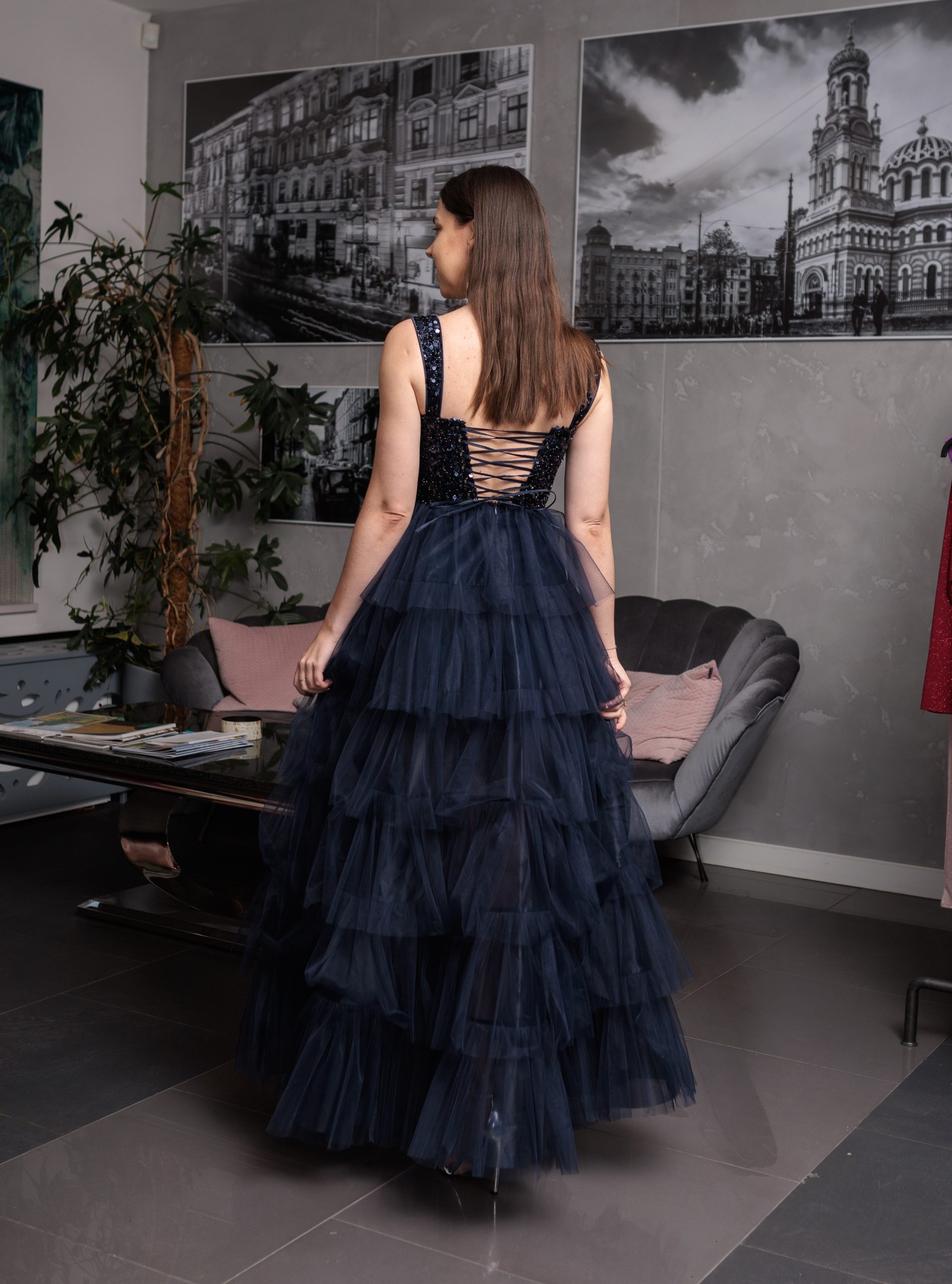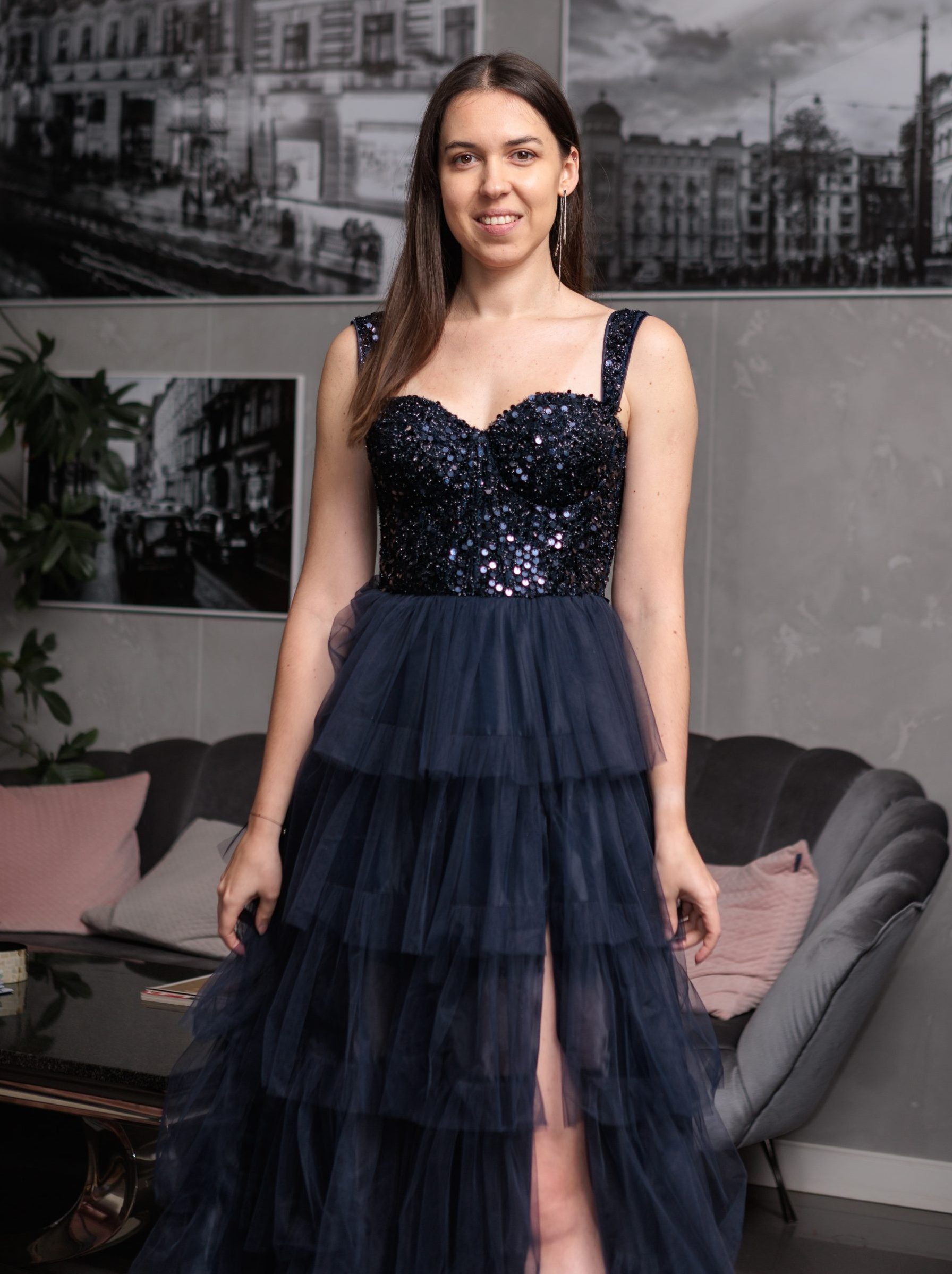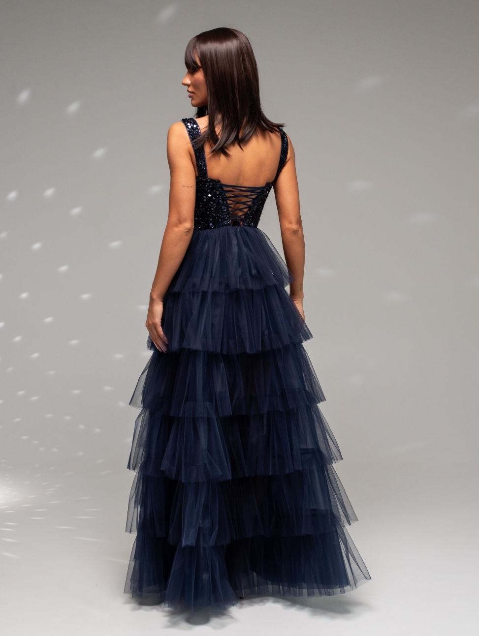 Efektowna gorsetowa, tiulowa sukienka maxi z falbanami. Sukienka posiada dopasowaną, zdobioną cekinami górę wzmacnianą fiszbinami. Lekko pogrubione ramiączka. Wiązaniem na plecach można idealnie dopasować rozmiar do sylwetki. Od talii sukienka jest lekko rozkloszowana dając efekt księżniczki. Dół wykonany z warstw tiulu naszytych w formie falbanek. Sukienka posiada również efektowne, głębokie rozcięcie na nogę. Krótsza podszewka nadaje lekkości sukience.