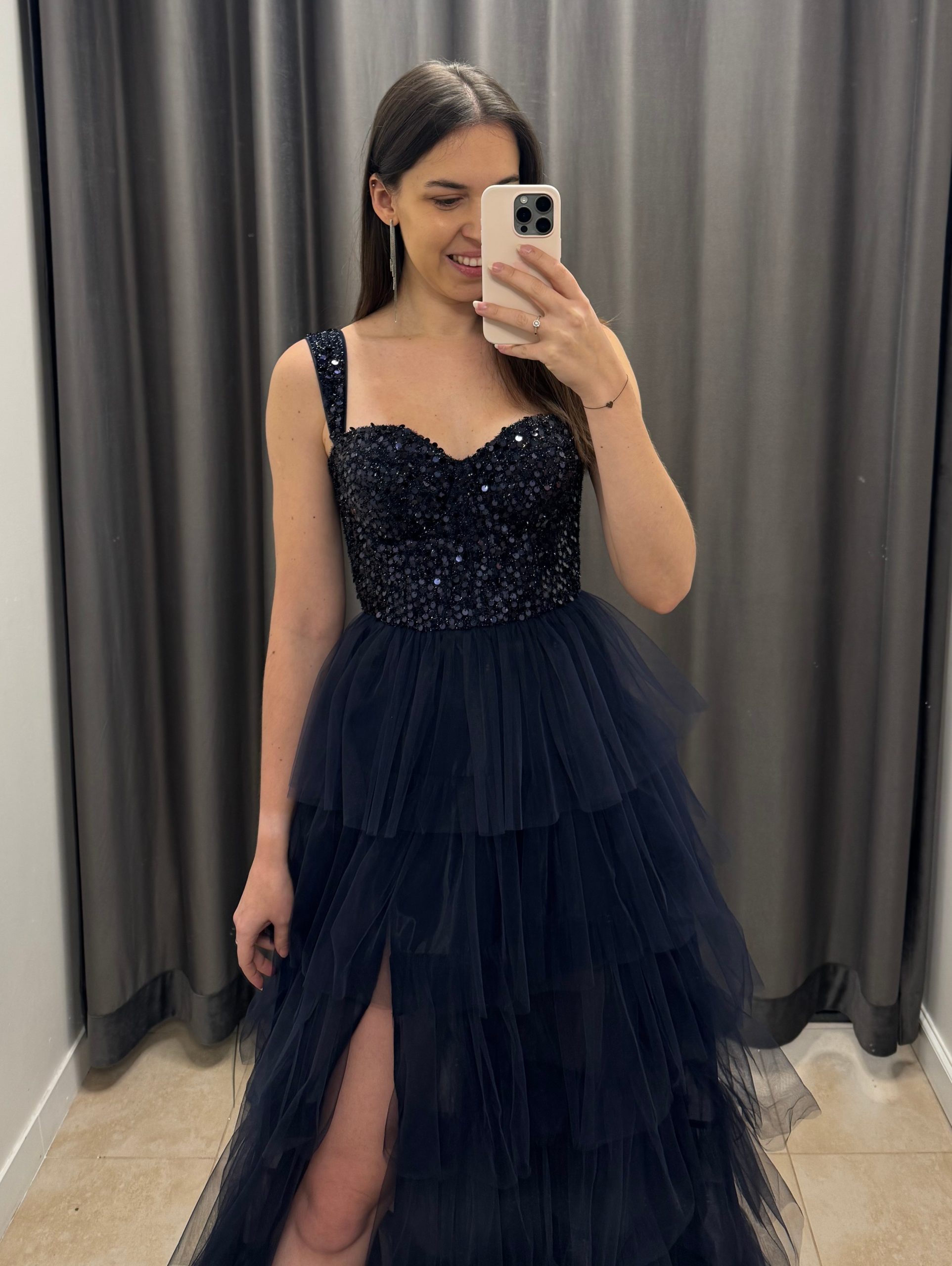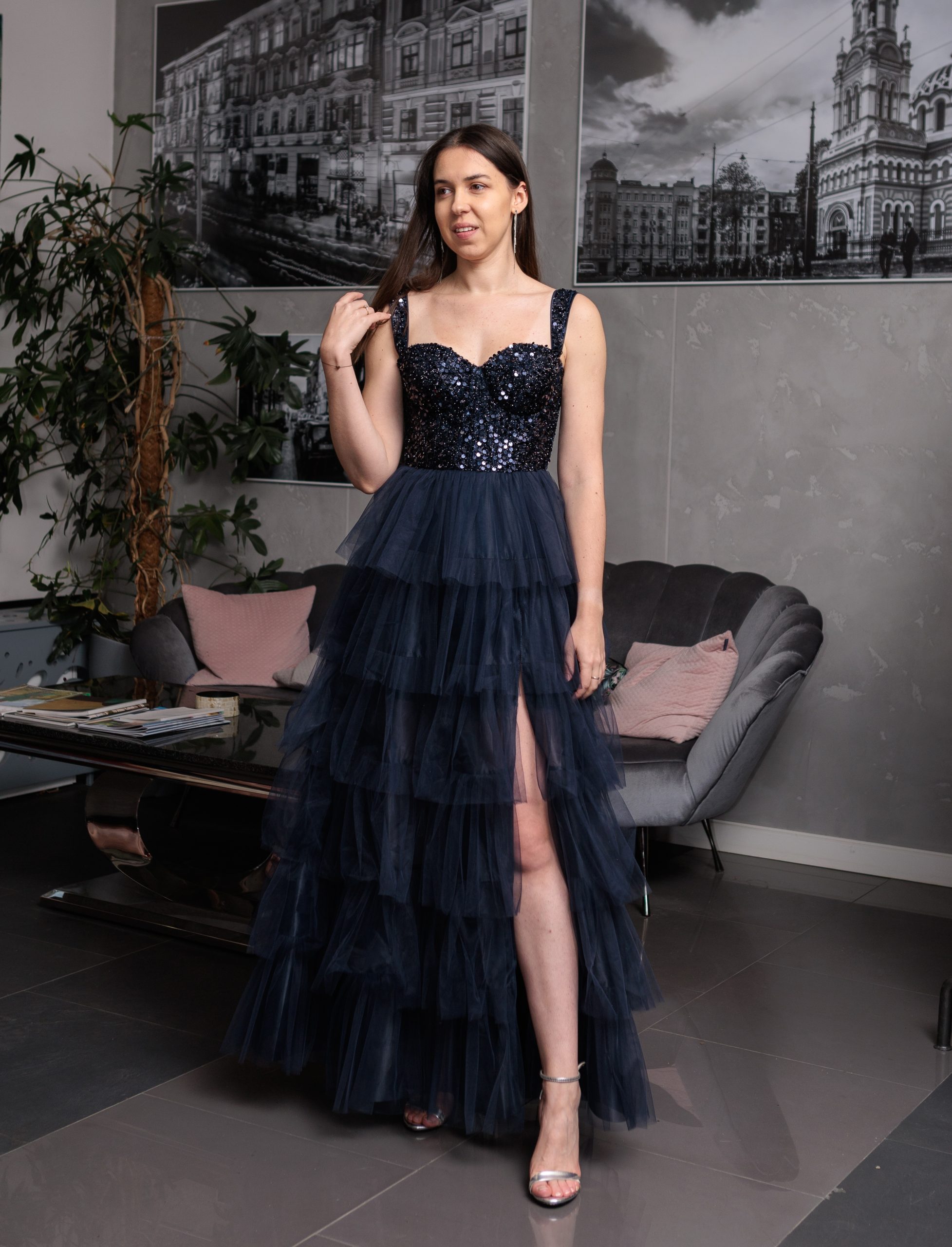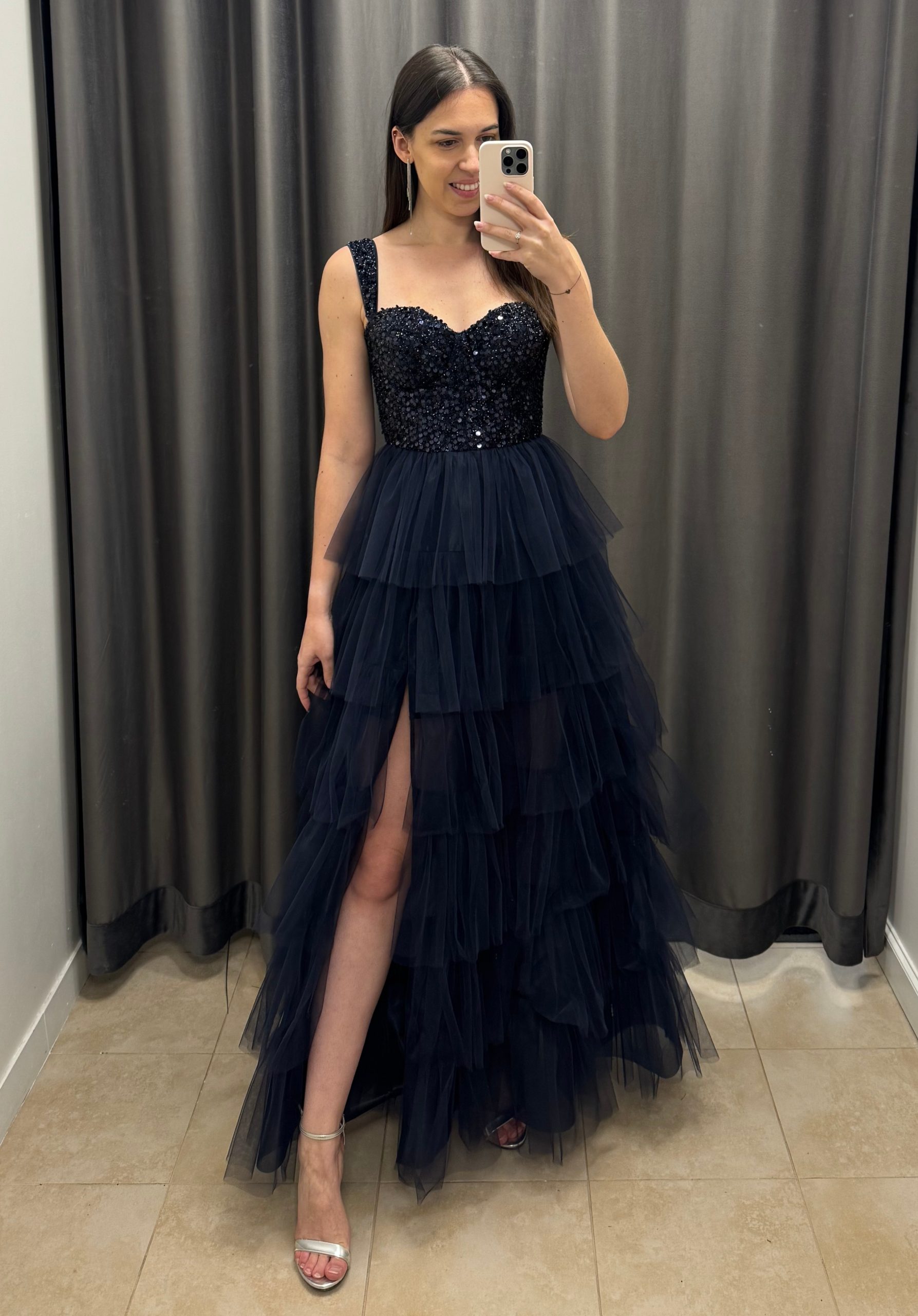 Efektowna gorsetowa, tiulowa sukienka maxi z falbanami. Sukienka posiada dopasowaną, zdobioną cekinami górę wzmacnianą fiszbinami. Lekko pogrubione ramiączka. Wiązaniem na plecach można idealnie dopasować rozmiar do sylwetki. Od talii sukienka jest lekko rozkloszowana dając efekt księżniczki. Dół wykonany z warstw tiulu naszytych w formie falbanek. Sukienka posiada również efektowne, głębokie rozcięcie na nogę. Krótsza podszewka nadaje lekkości sukience.