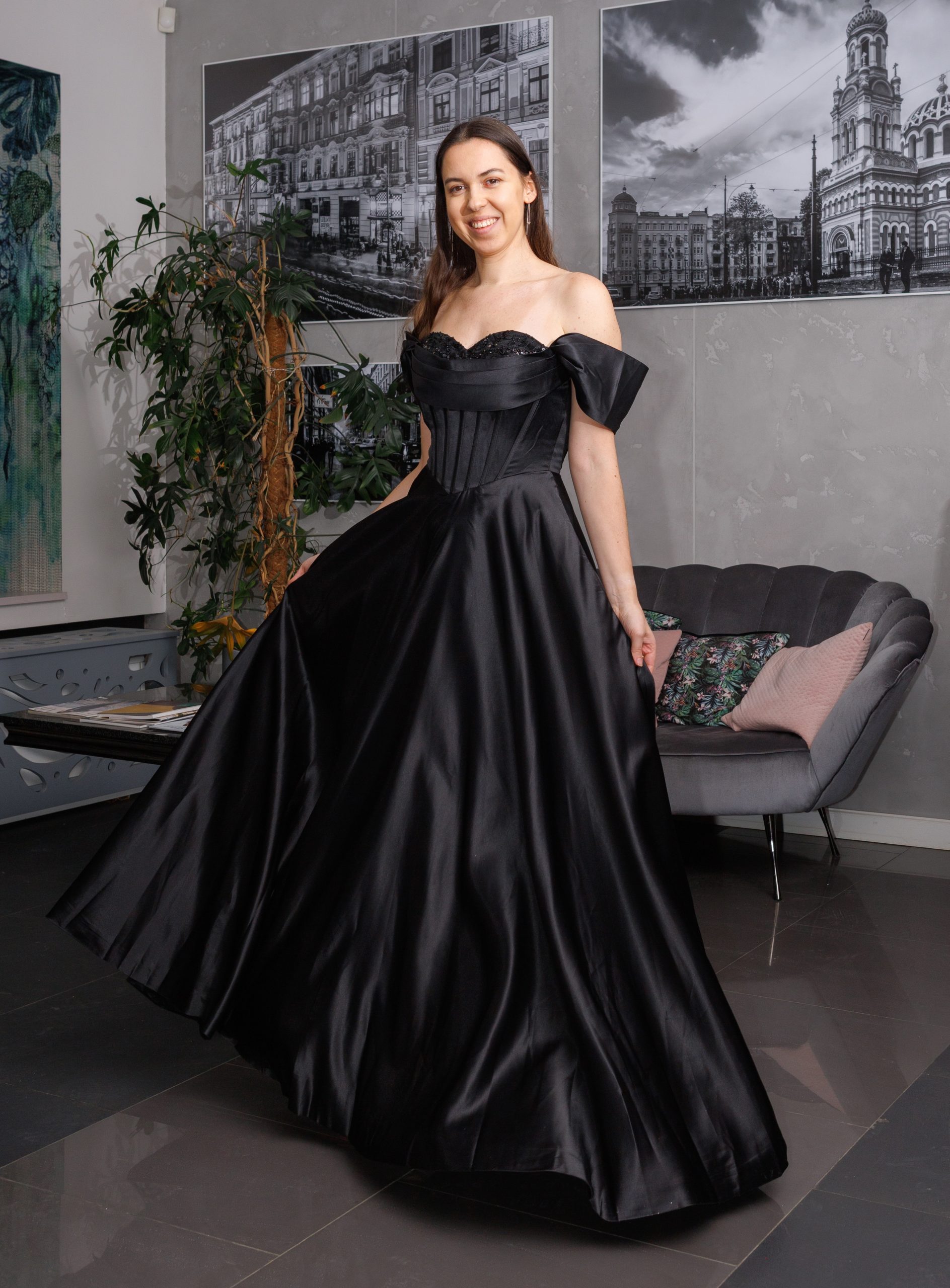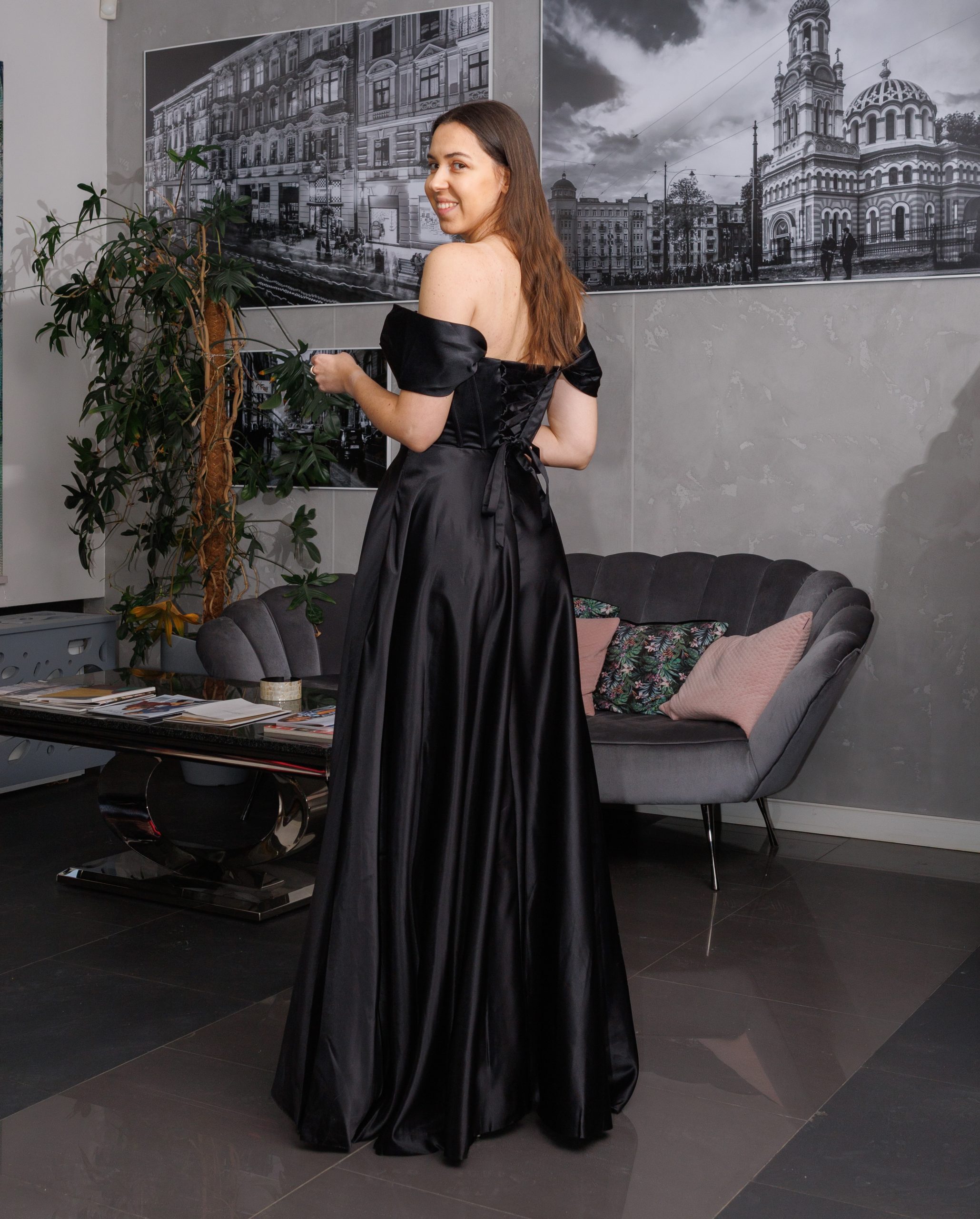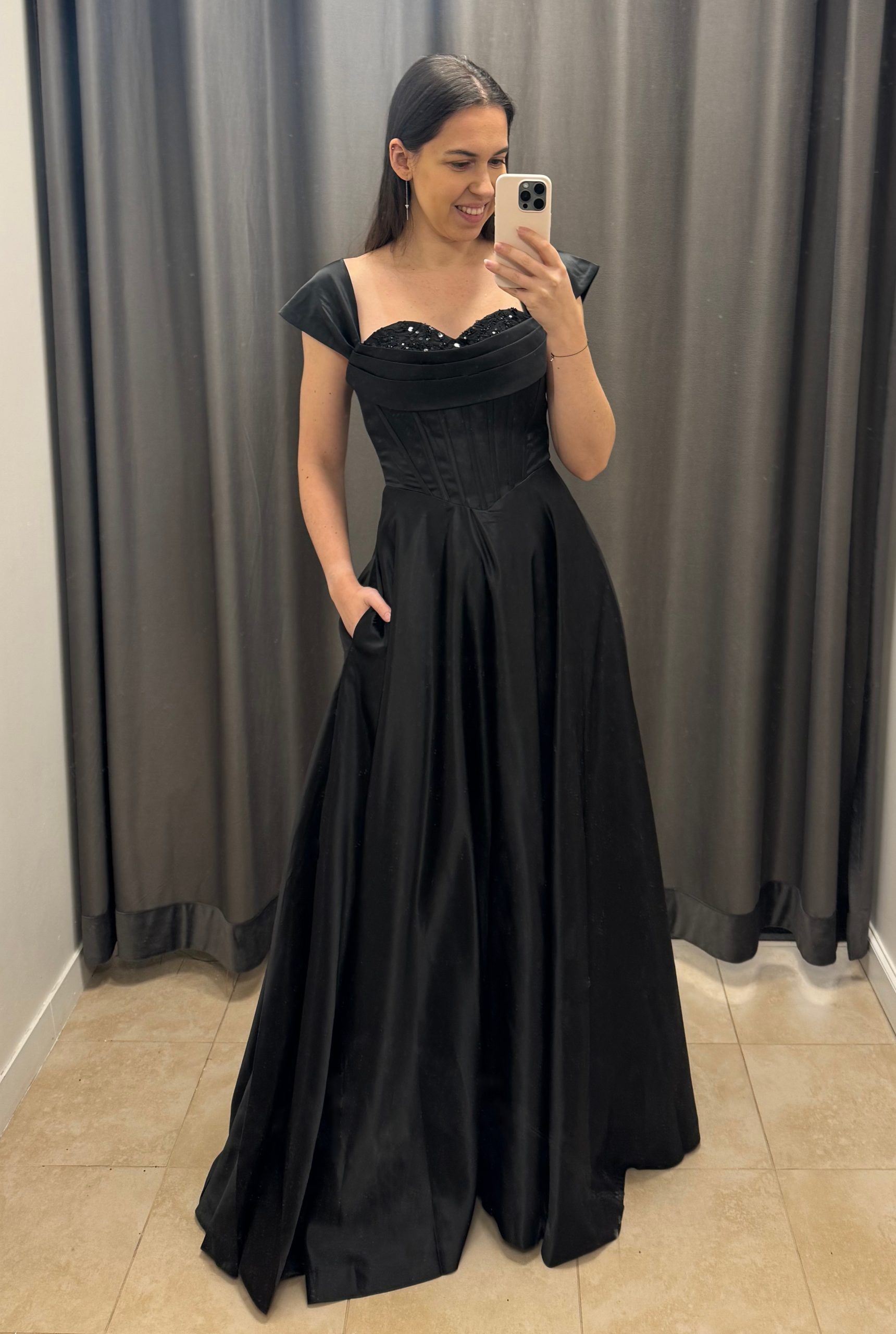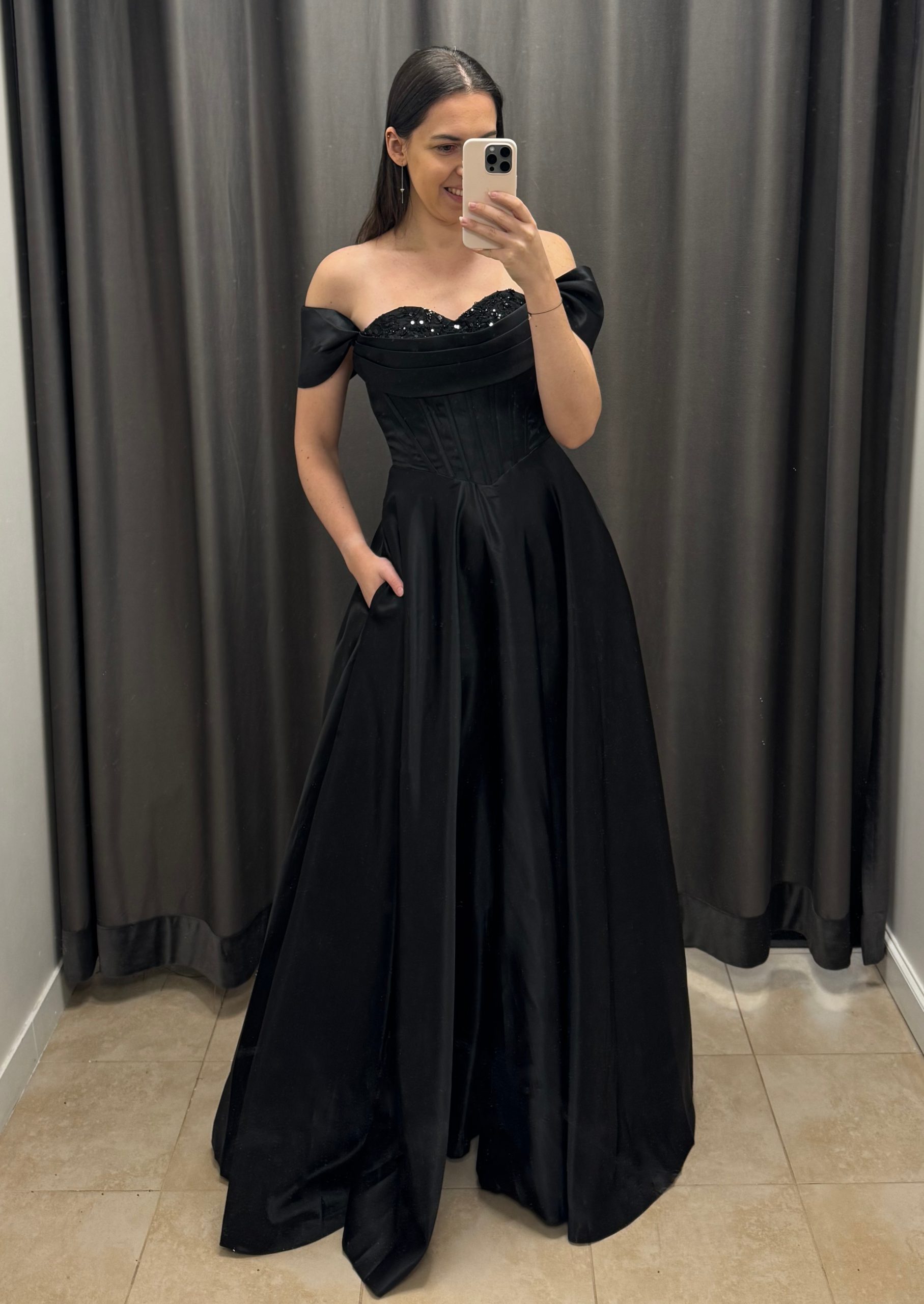 Długa, satynowa sukienka gorsetowa. Sukienka z gorsetem wiązanym na plecach i opadającymi rękawkami. Rękawki można nosić założone na ramiona, lub opuszczone luźno. Gorset jest mocno dopasowany, z fiszbinami, góra zdobiona cekinami i koralikami przykryta dodatkowymi zaszewkami. Gorsetem można dostosować rozmiar do siebie, tak aby sukienka leżała perfekcyjnie. Świetnie sprawdzi się również przy większym biuście. W zestawie odpinane, cienkie ramiączka silikonowe. Dół luźny, lejący. Sukienka posiada praktyczne kieszenie. Satynowy materiał wysokiej jakości.