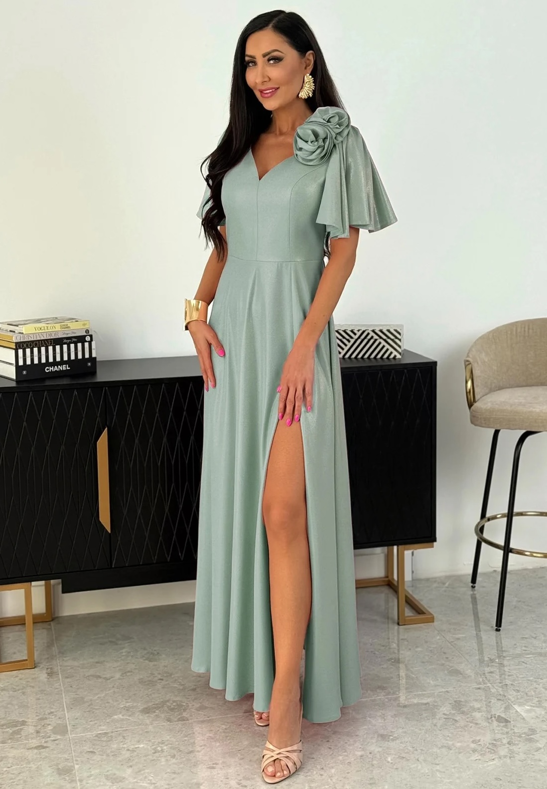 Elegancki i ponadczasowy fason – sukienka w długości maxi w kolorze szałwiowym. Dekolt w serduszko, wyprofilowany w literę V, plecy zabudowane. Podwójna róża na odpinanej broszce została przypięta przy dekolcie dla asymetrycznego efektu, można wykorzystać ją do przypięcia w innym miejscu, lub zupełnie odpiąć. Krótki, luźny, lekko falujący rękawek pięknie osłania ramiona. Talia podkreślona z dodatkowym paskiem w kolorze sukienki, który można wiązać na dowolne sposoby. Dół lekko rozkloszowany, cudownie pracuje w ruchu. Sukienka posiada rozcięcie na nogę.
