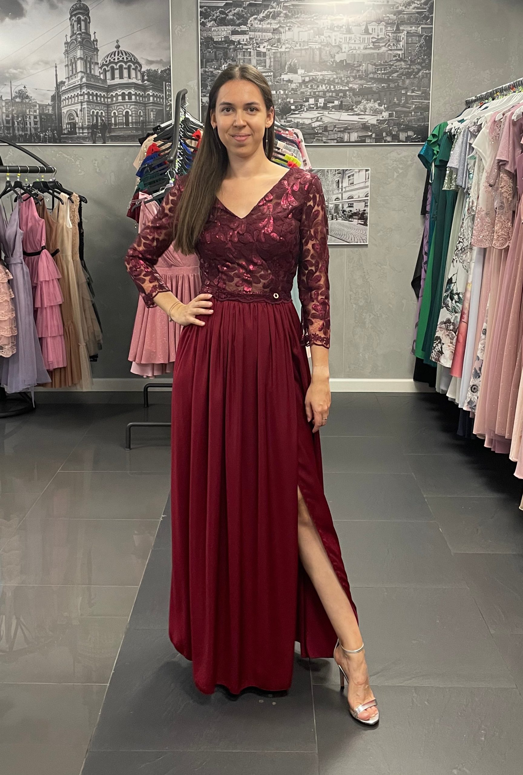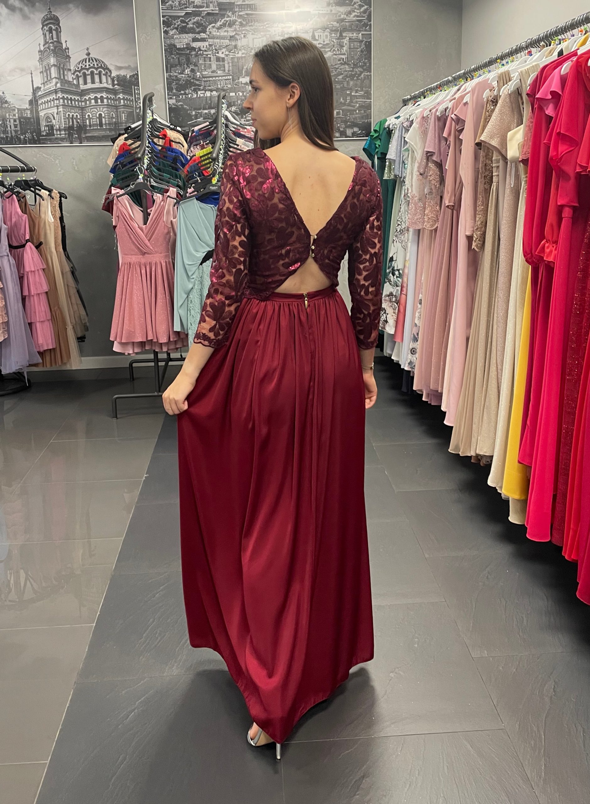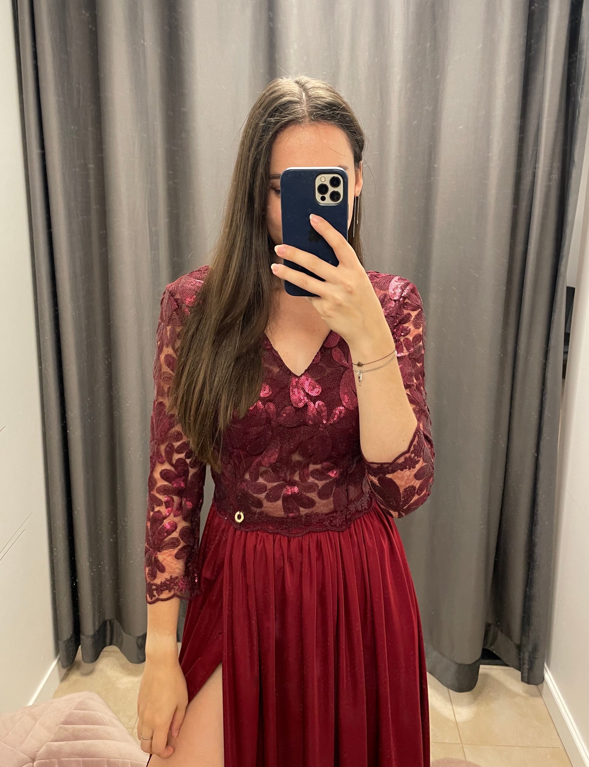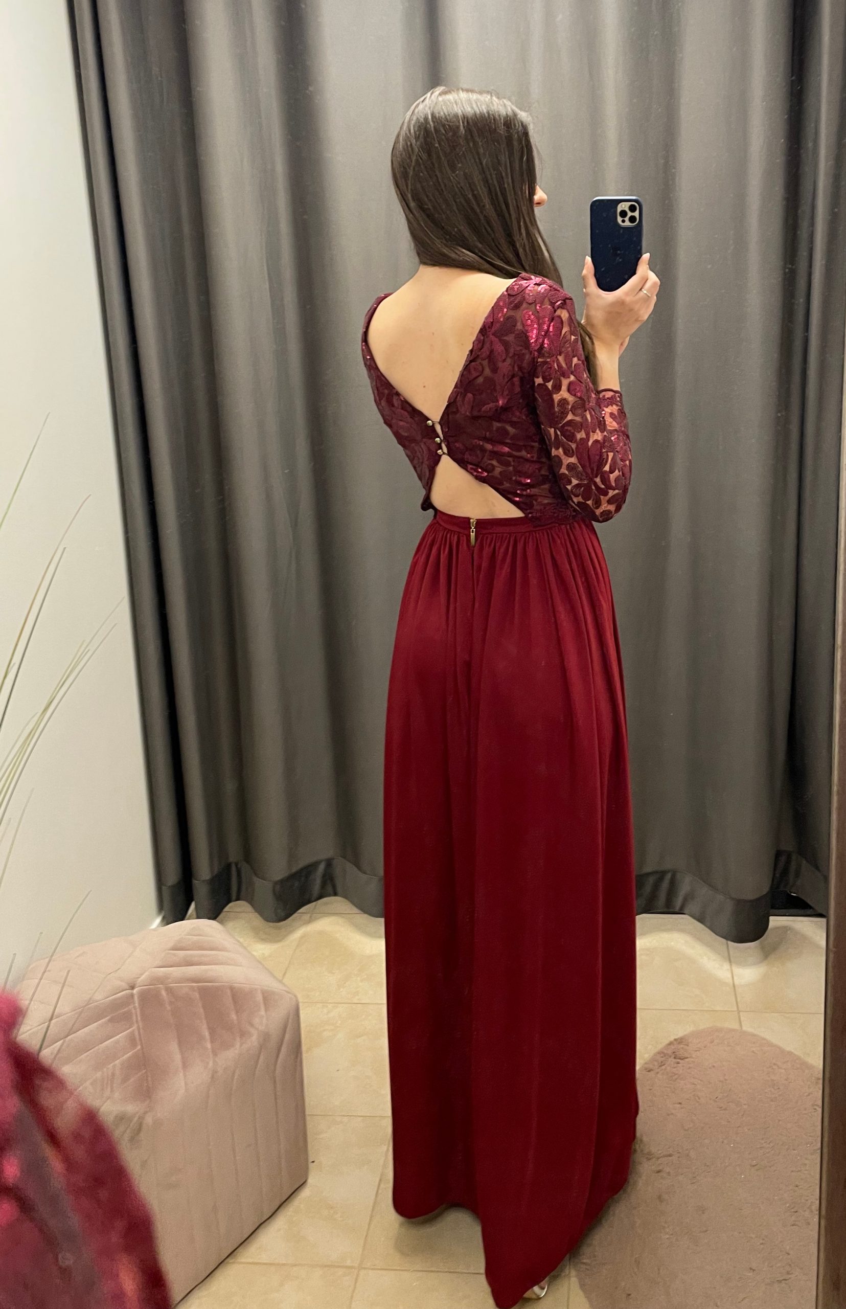 Sukienka maxi z koronkowym rękawem i wycięciem na plecach. Góra sukienki wykonana z lekko błyszczącej, transparentnej koronki. Wszyty materiałowy stanik. Dekolt w literkę V, tył zapinana na 3 guziczki, z dodatkowym wycięciem. Sukienka jest taliowana, odcinana w pasie. Dół lekki i zwiewny, wykonany z satynowego materiału. Sukienka posiada bardzo głębokie rozcięcie które pięknie prezentuje się w ruchu.