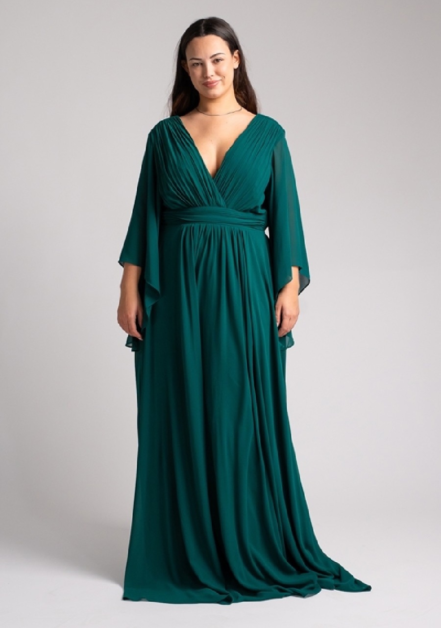 Długa szyfonowa sukienka z luźnym rękawem. Sukienka posiad dekolt w literę V z delikatnym marszczeniem oraz odcięcie pod biustem, które pięknie wydłuża sylwetkę. Plecy są zabudowane. Luźne, rozszerzane rękawki delikatnie przykrywają ramiona. Sukienka wykonana z lekkiego, szyfonowego materiału, pięknie układa się w ruchu.