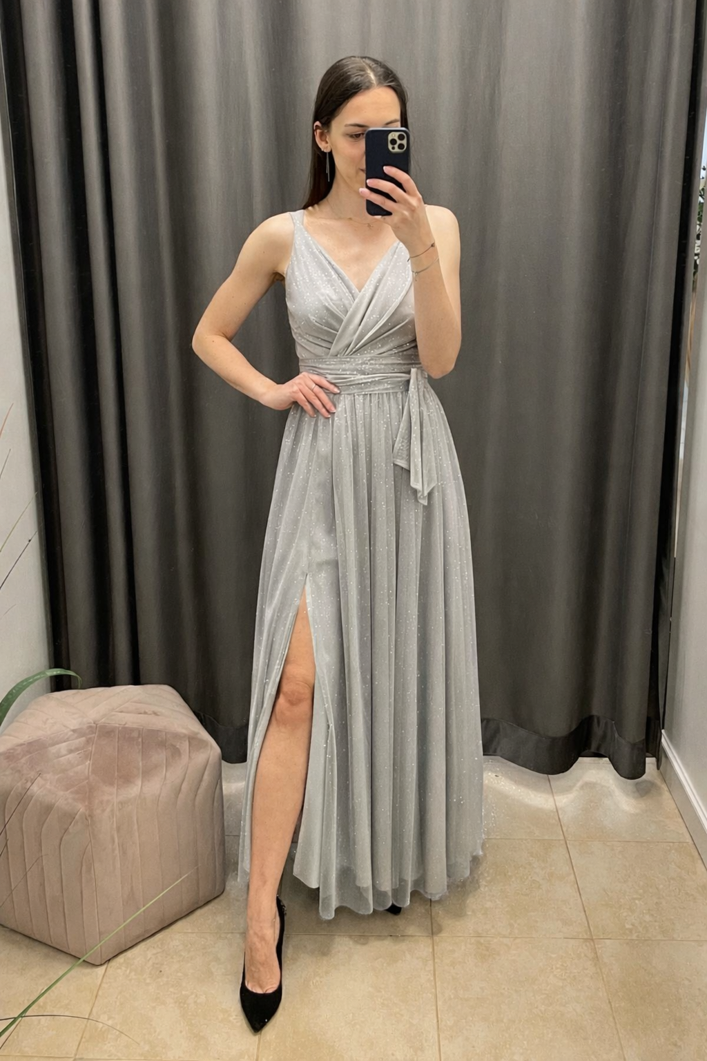 Sukienka maxi na ramiączkach o oryginalnym kształcie, w pięknym kolorze srebra z brokatem. Dekolt w V na zakładkę. Sukienka jest taliowana, odcinana w pasie i lekko rozkloszowana. W zestawie znajduje się materiałowy pasek w kolorze sukienki, który można zawiązać na kokardę lub wykorzystać jako ozdobę np. we włosach. Sukienka posiada dwie warstwy: materiał oraz miękki tiul z brokatem.