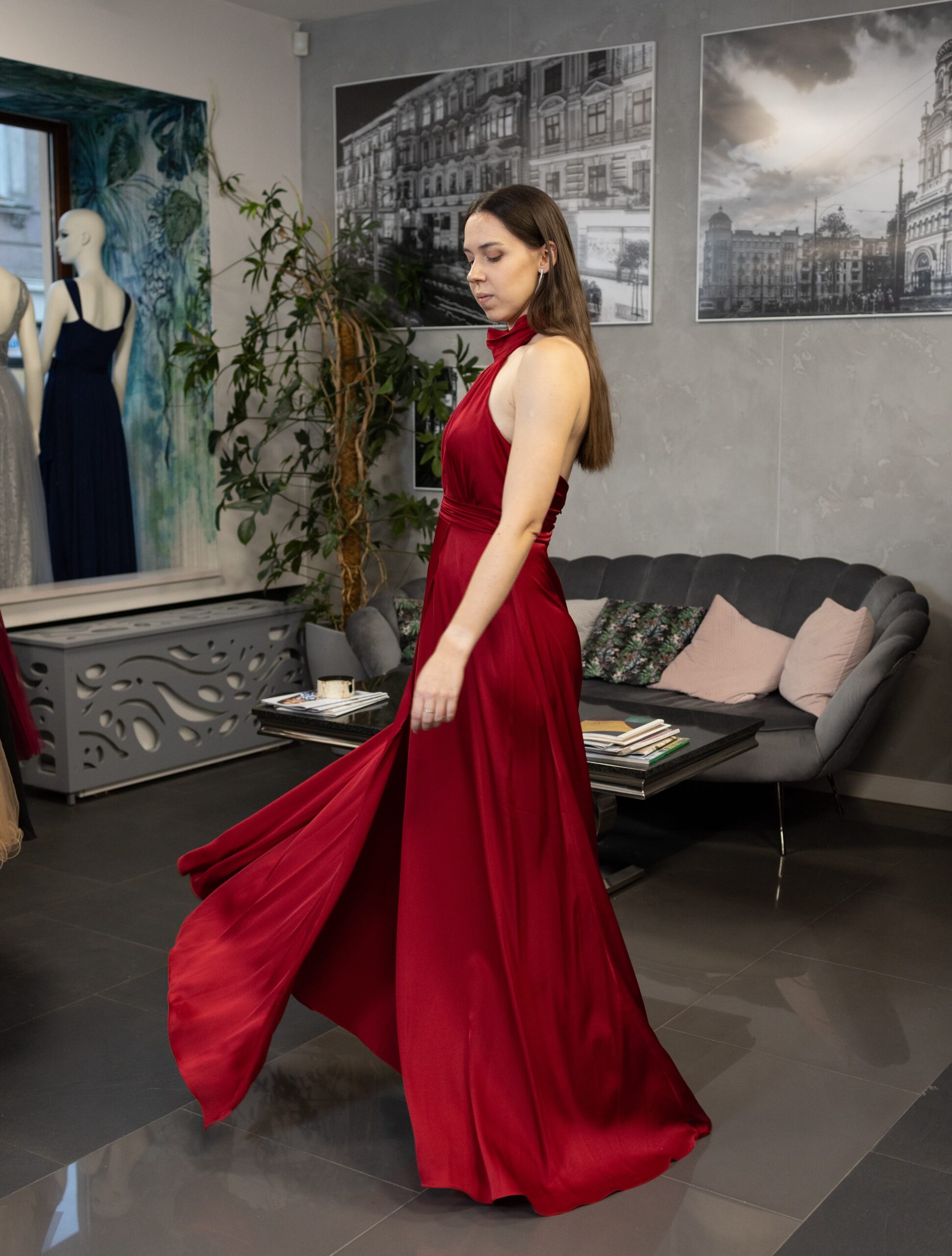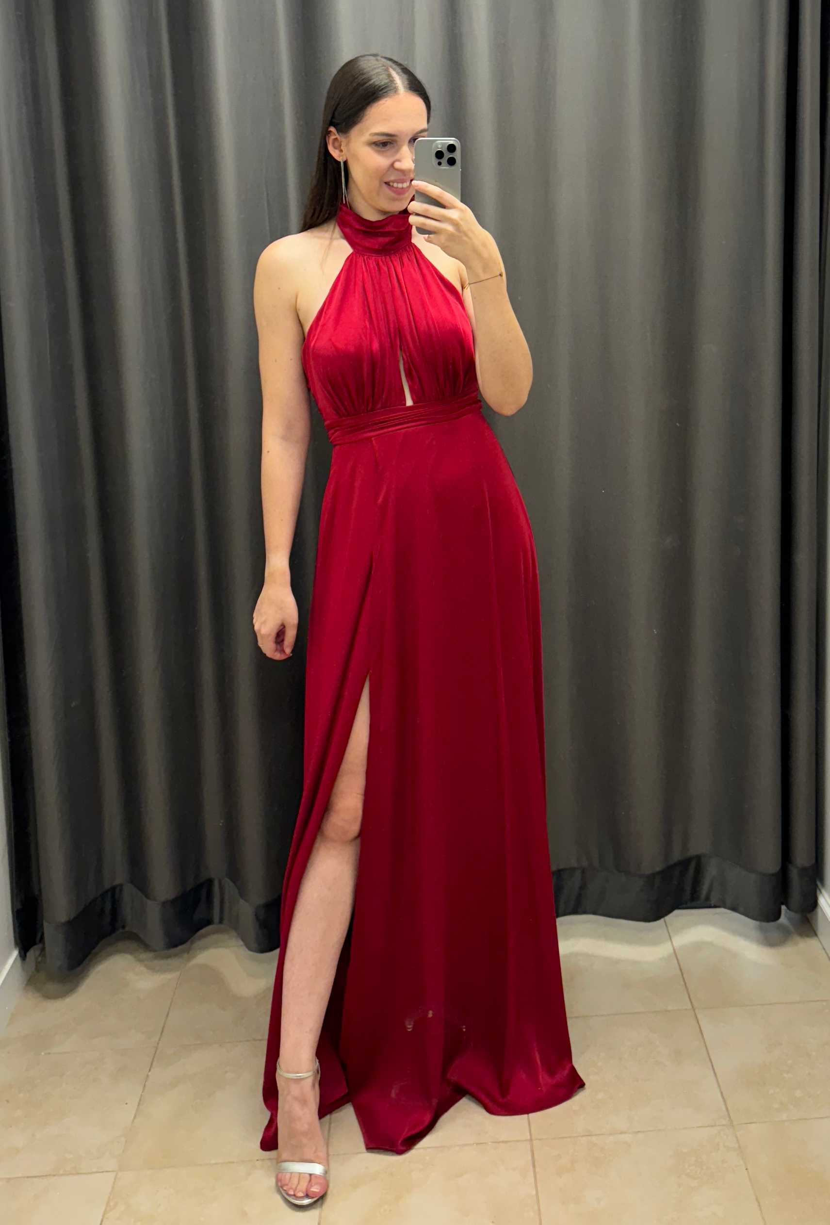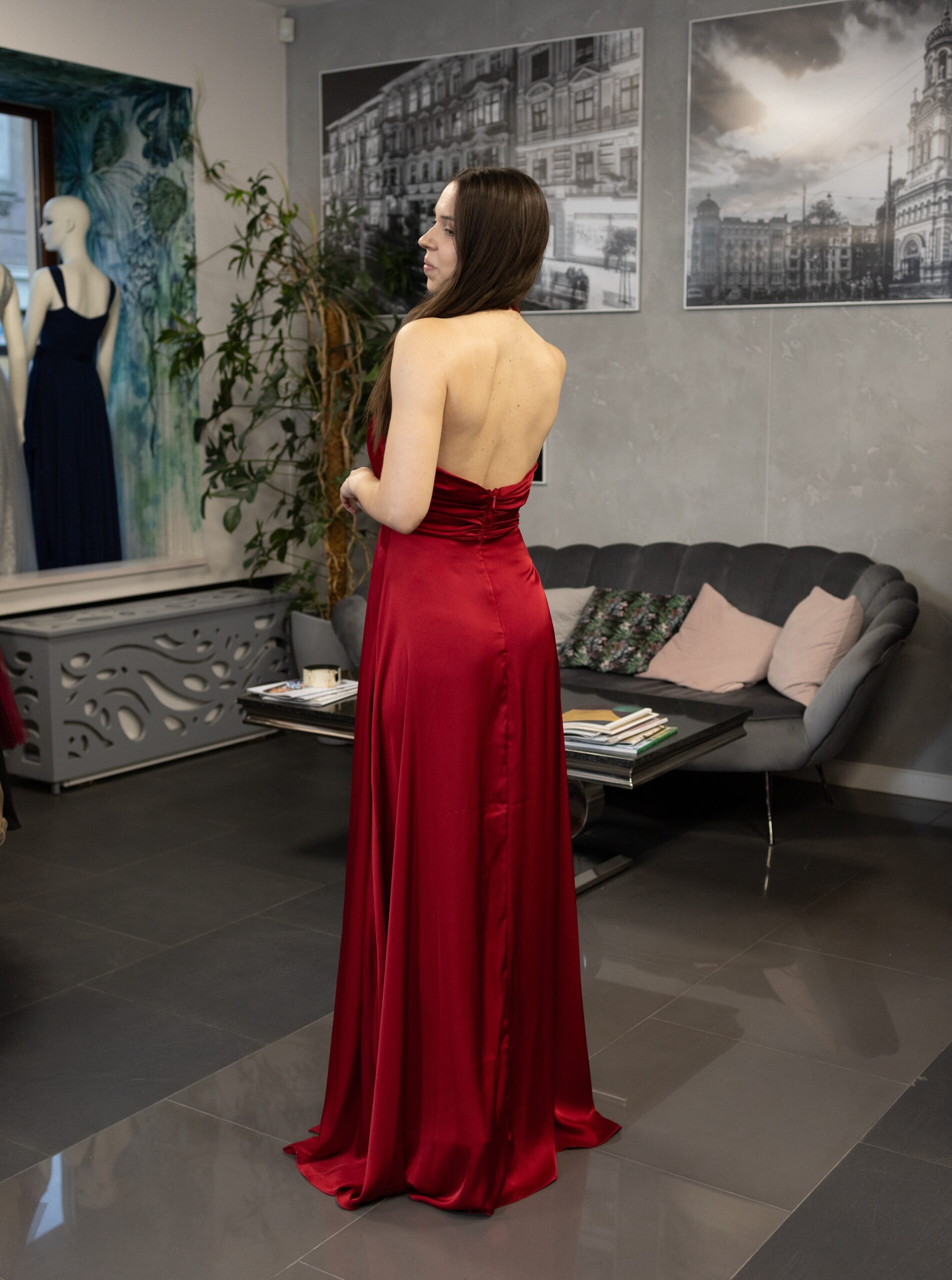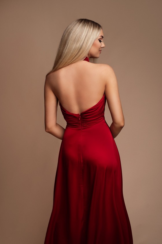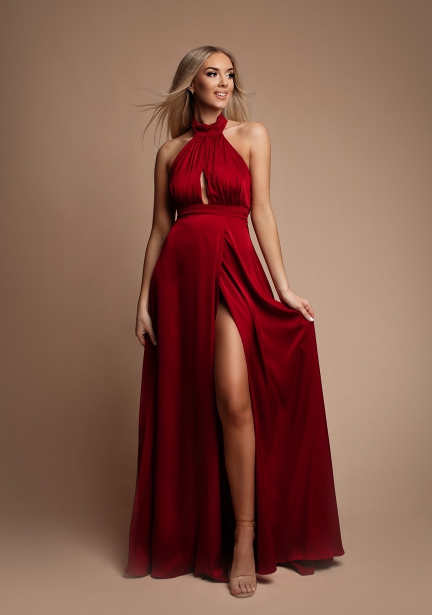 Długa, satynowa sukienka zakładana na szyję z odkrytymi plecami. Sukienka zakładana na szyję z efektownym pęknięciem na dekolcie. Plecy mocno wycięte, wyeksponowane. Talia została pięknie podkreślona. Dół jest luźny, lejący. Z boku znajduje się rozcięcie, które lekko odsłania i zdecydowanie optycznie wydłuża nogi. Satynowy materiał w pięknym, czerwono-wiśniowym kolorze. W zestawie znajduje się odpinana róża którą można nosić przypiętą na szyi.