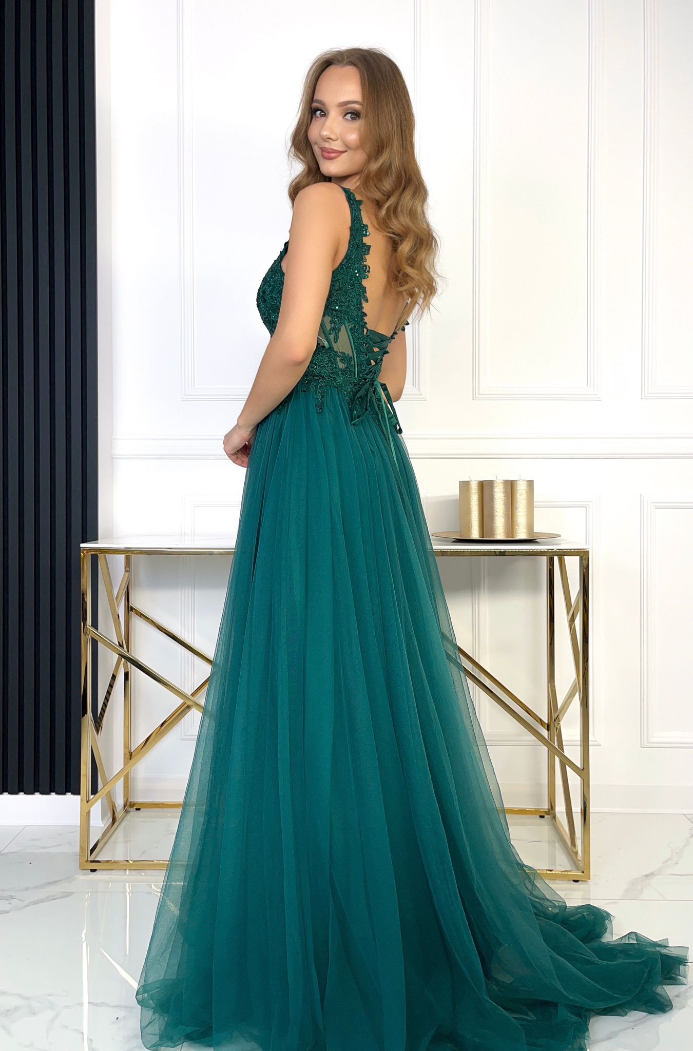 Efektowna gorsetowa, tiulowa sukienka maxi. Sukienka posiada dopasowaną, zdobioną, lekko transparentną górę wzmacnianą fiszbinami. Tył mocno wycięty, na dole sznurowany, pięknie eksponuje plecy. Sukienka posiada wszyte miseczki oraz szersze ramiączka. Od talii sukienka jest mocno rozkloszowana dając efekt księżniczki. Dół wykonany z lekkiego, miękkiego tiulu. Sukienka posiada również efektowne, głębokie rozcięcie na nogę.