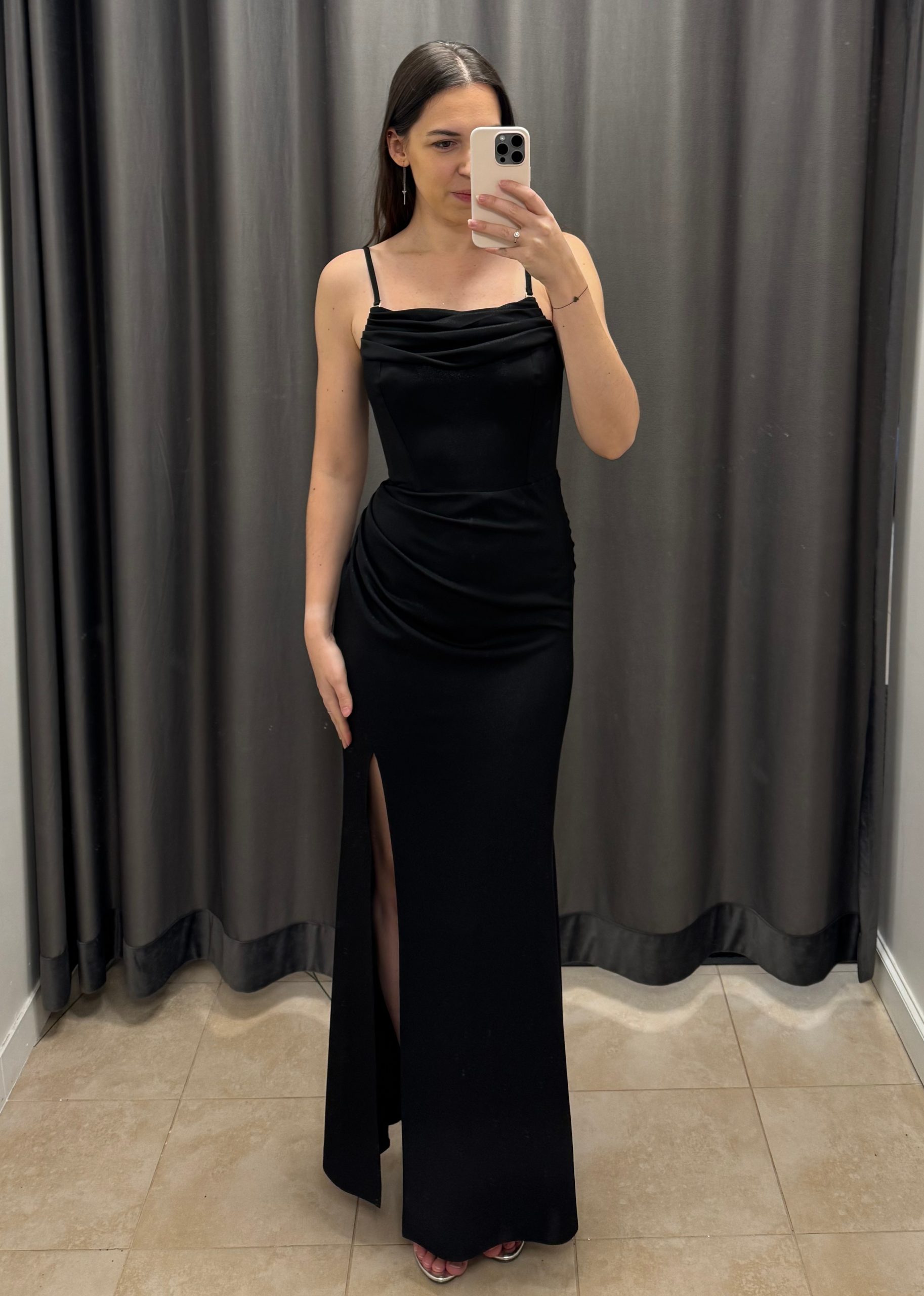 Długa, elegancka dopasowana sukienka ze sznurowanymi plecami. Sukienka posiada cienkie, odpinane ramiączka, oraz dekolt wykończony na prosto, z delikatnym marszczeniem typu woda, aby pięknie podkreślić zarówno mały jak i większy biust. Dodatkowo góra została usztywniona wszytymi fiszbinami, które dają jej gorsetowy efekt. Plecy odkryte, z efektownym sznurowaniem typu gorset. Talia podkreślona odcięciem. Dół prosty, dopasowany, z rozcięciem na nogę. Całość wykonana z lejącego materiału wysokiej jakości, który pięknie układa się na sylwetce.