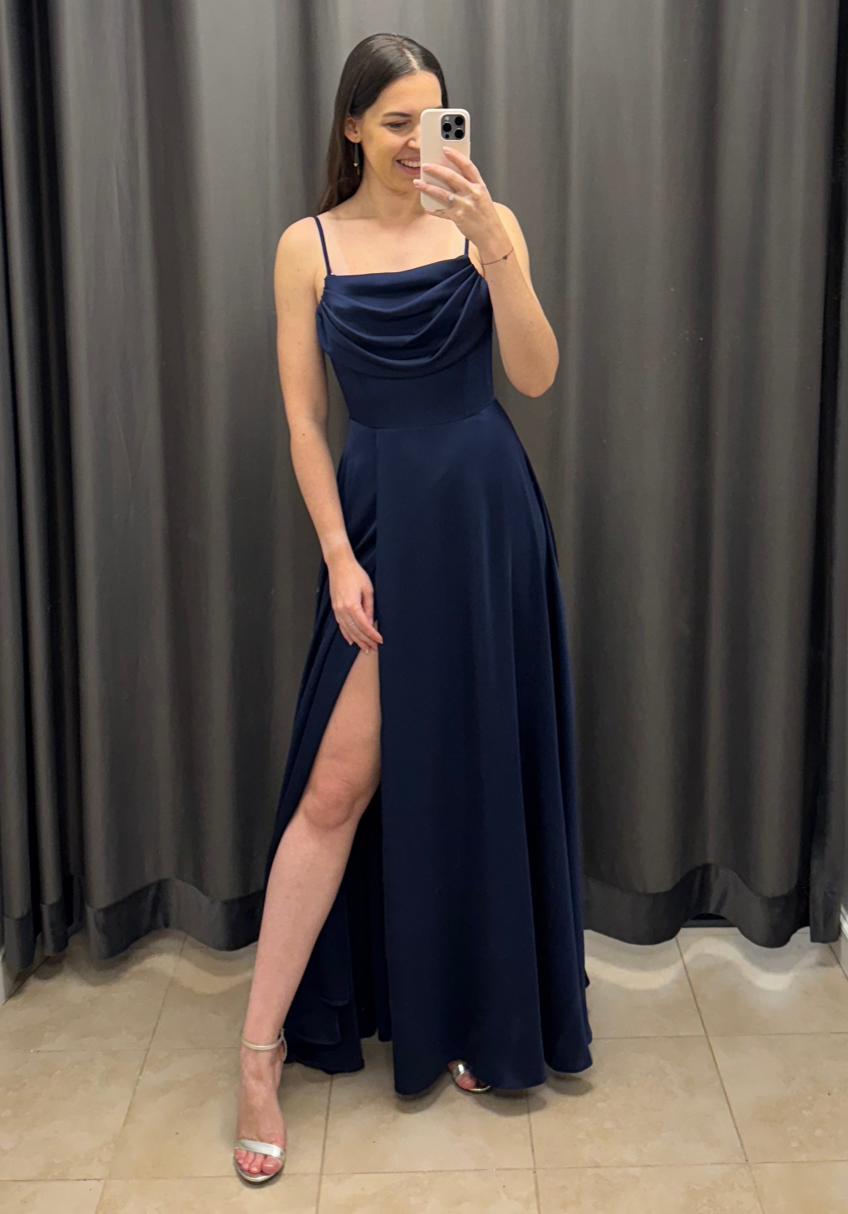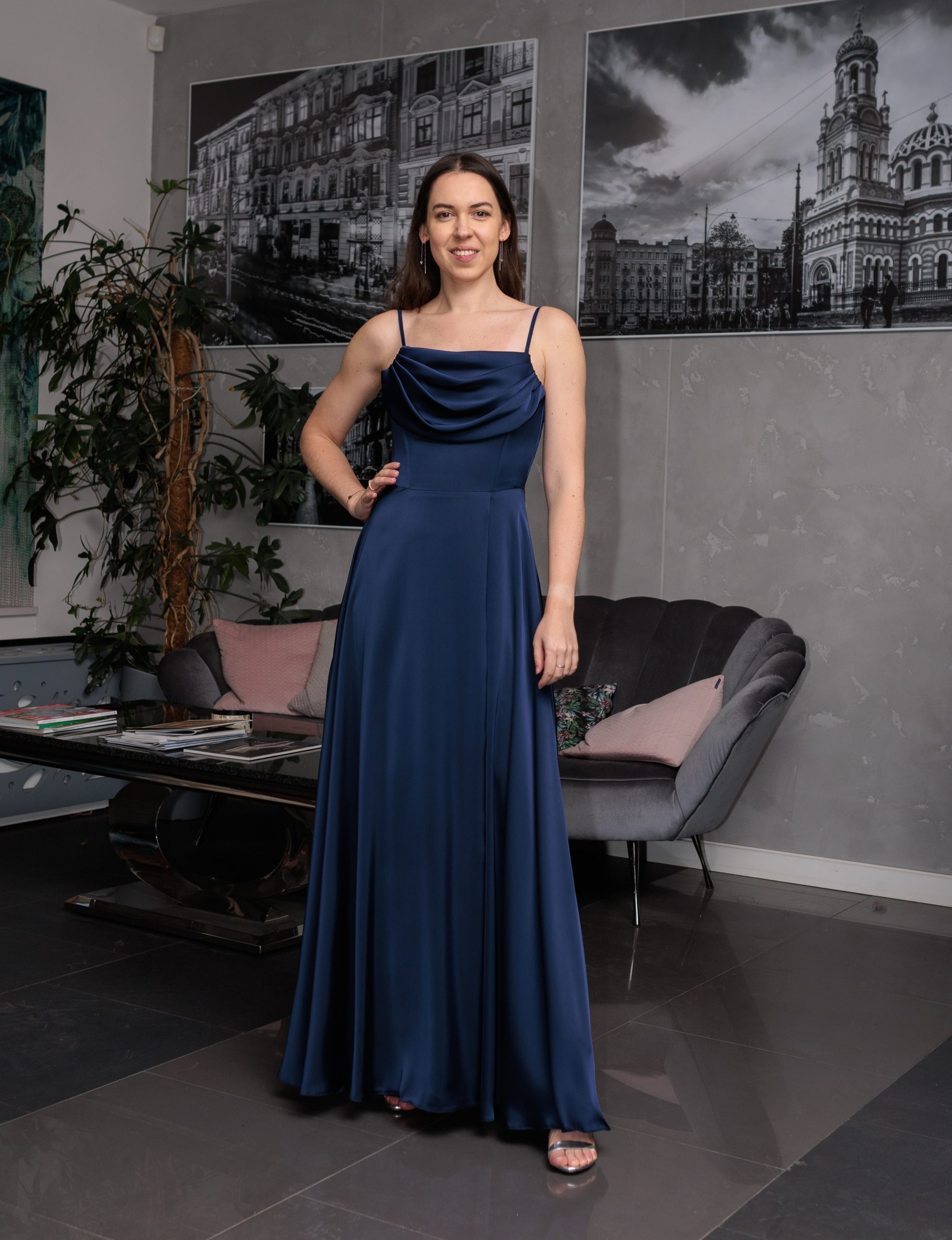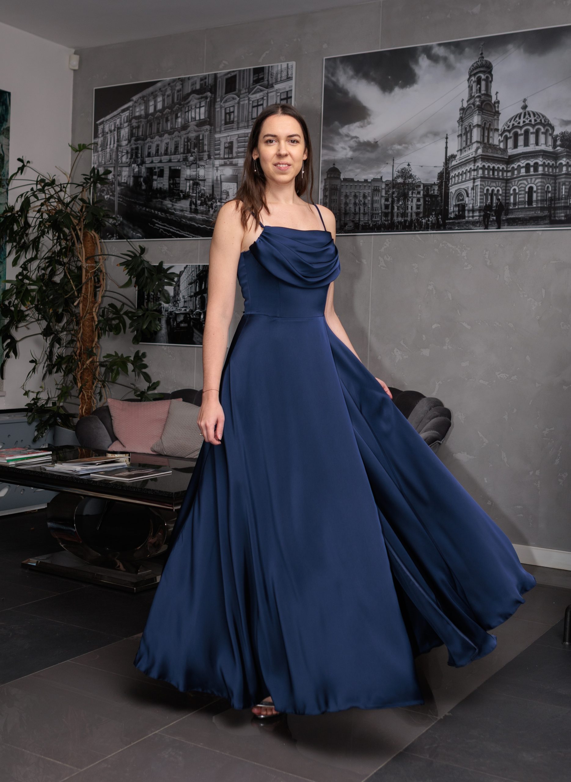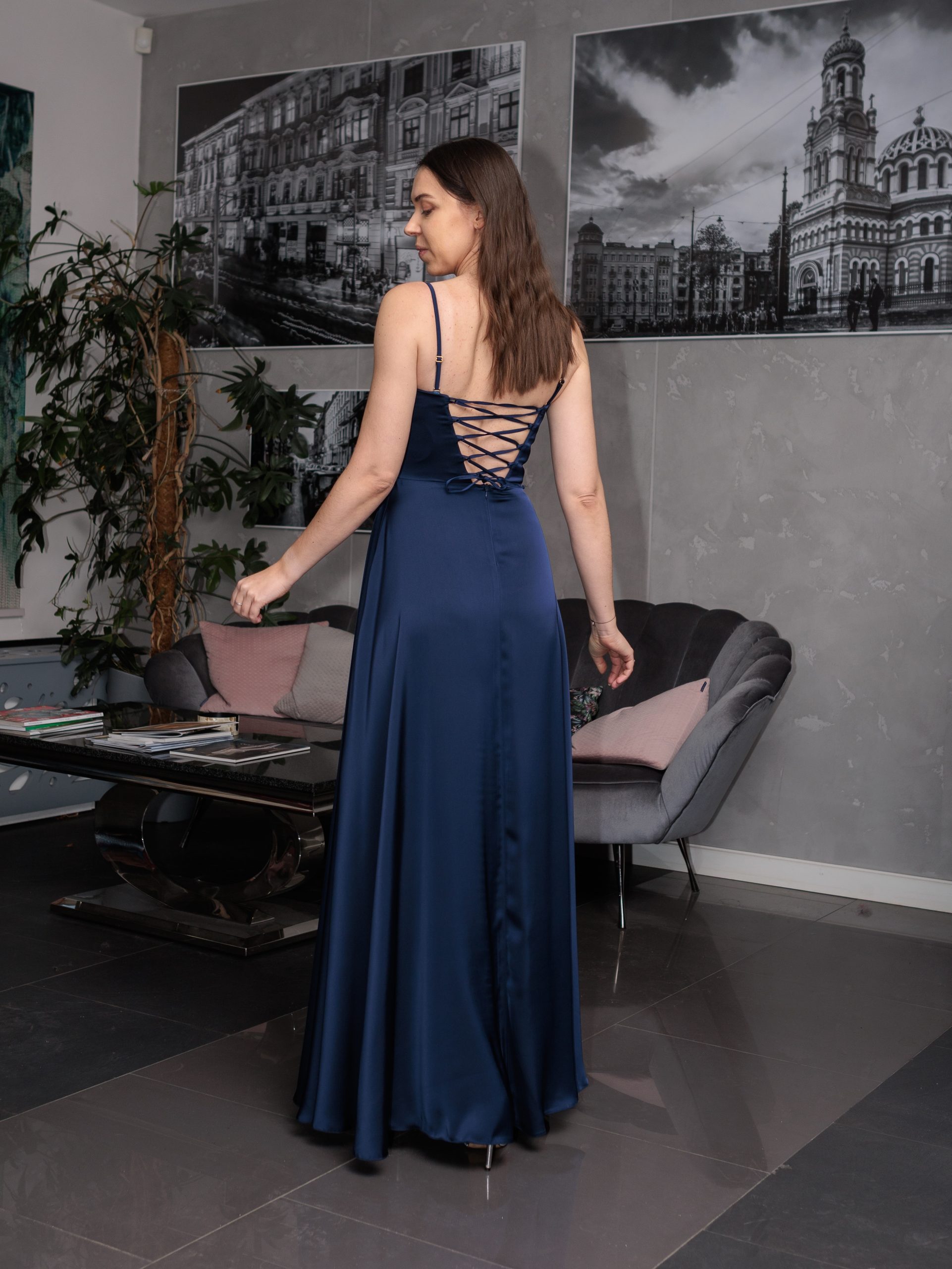 Długa, elegancka sukienka satynowa na cienkich ramiączkach ze sznurowanymi plecami. Sukienka posiada cienkie odpinane ramiączka, oraz dekolt typu woda tak, aby pięknie podkreślić zarówno mały jak i większy biust. Plecy odkryte, z efektownym sznurowaniem przypominającym gorset. Talia podkreślona odcięciem. Dół lejący, lekko rozkloszowany, z rozcięciem na nogę. Całość wykonana z lekkiej, lejącej satyny wysokiej jakości, która pięknie układa się w ruchu.