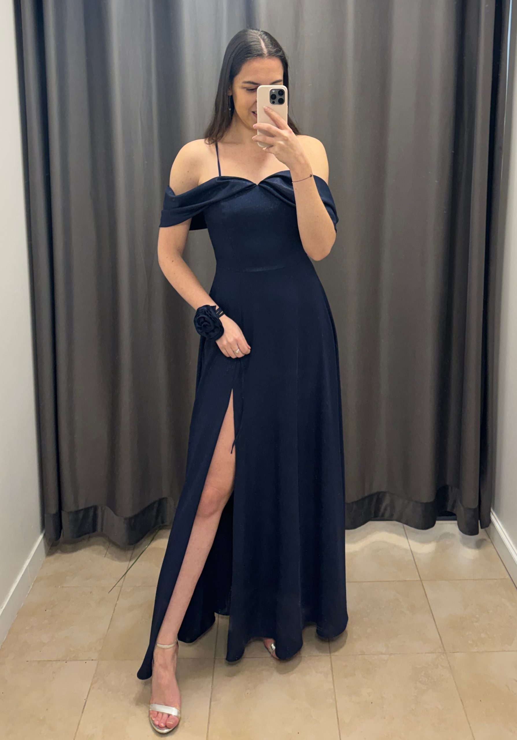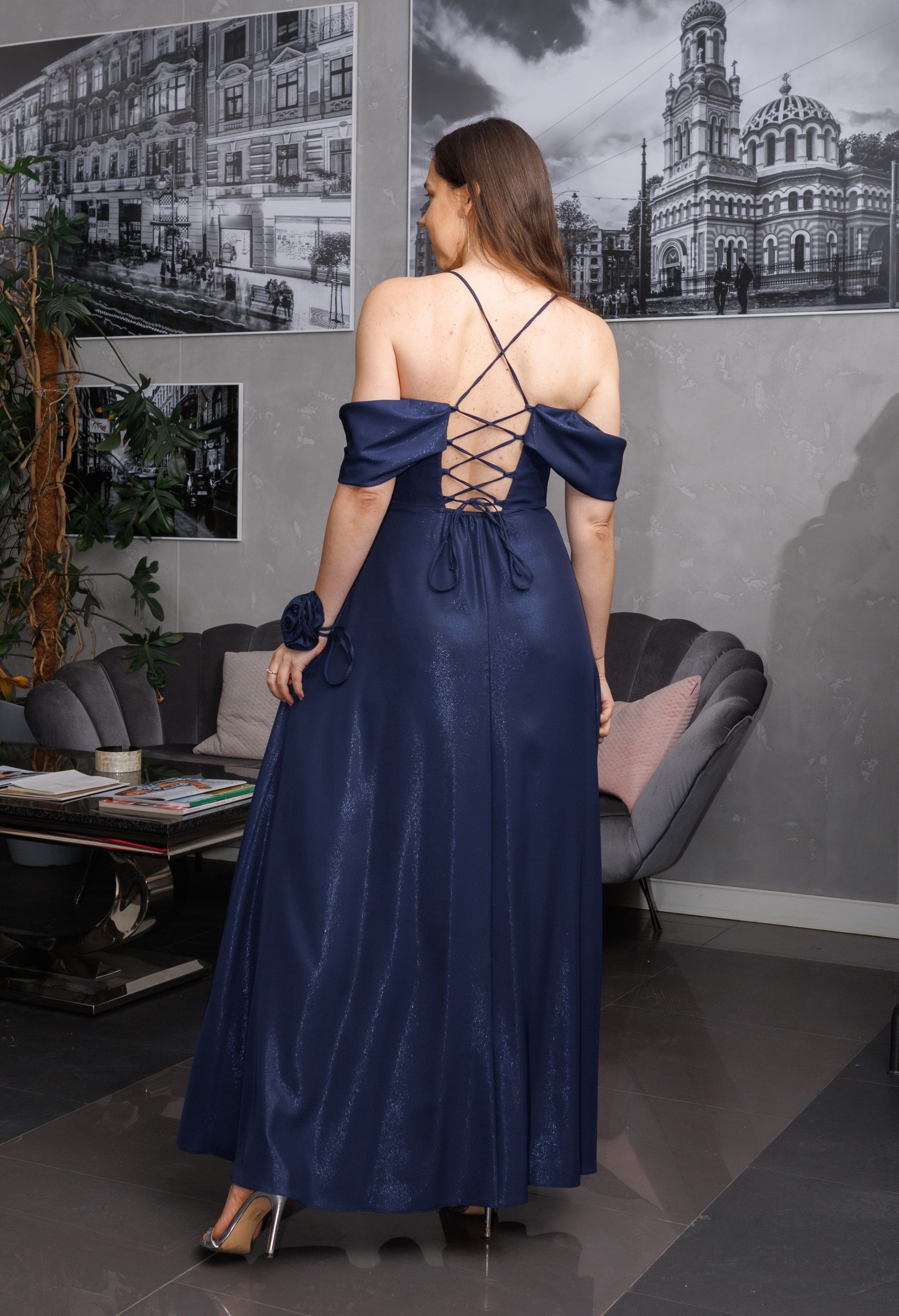 Długa, elegancka sukienka z opadającymi ramiączkami w stylu hiszpanki i sznurowanymi plecami. Sukienka posiada cienkie ramiączka, oraz dekolt wykończony na prosto, wykończony opadającymi, szerszymi ramiączkami tak, aby pięknie podkreślić zarówno mały jak i większy biust. Dodatkowo góra została usztywniona wszytymi fiszbinami, które dają jej gorsetowy efekt. Plecy odkryte, z efektownym sznurowaniem przypominającym gorset. Talia podkreślona odcięciem. Dół prosty, lekko rozkloszowany, z rozcięciem na nogę. Całość wykonana z lejącego materiału wysokiej jakości. W zestawie róża na sznurku.
