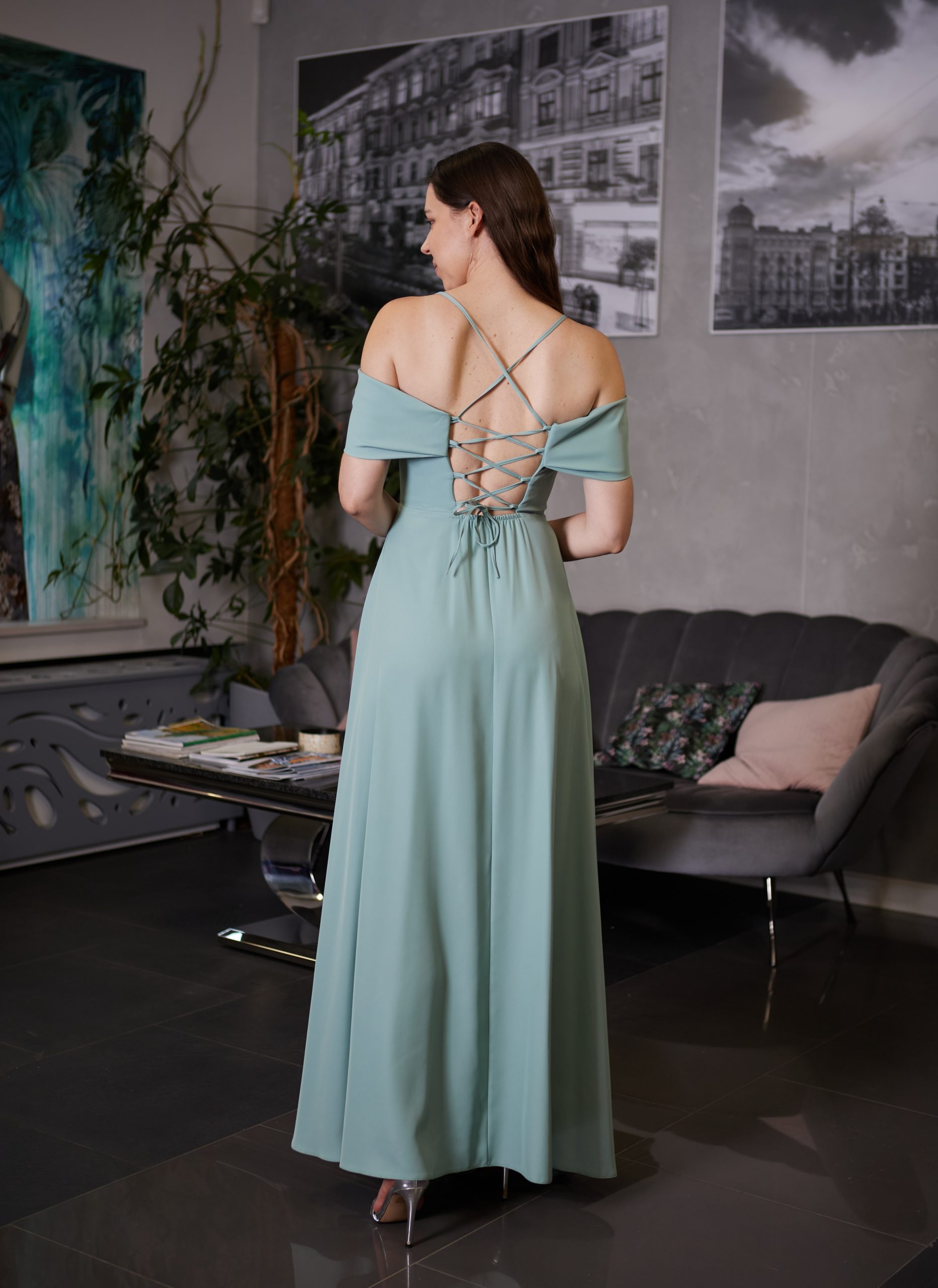 Długa, elegancka sukienka z opadającymi ramiączkami i sznurowanymi plecami. Sukienka posiada cienkie ramiączka, oraz dekolt wykończony na prosto, wykończony opadającymi, szerszymi ramiączkami tak, aby pięknie podkreślić zarówno mały jak i większy biust. Dodatkowo góra została usztywniona wszytymi fiszbinami, które dają jej gorsetowy efekt. Plecy odkryte, z efektownym sznurowaniem przypominającym gorset. Talia podkreślona odcięciem. Dół prosty, lekko rozkloszowany, z rozcięciem na nogę. Całość wykonana z lejącego materiału wysokiej jakości. W zestawie róża w formie odpinanej broszki. Można przypiąć ją symetrycznie przy dekolcie lub wykorzystać jako dodatek do stylizacji np. przy włosach.