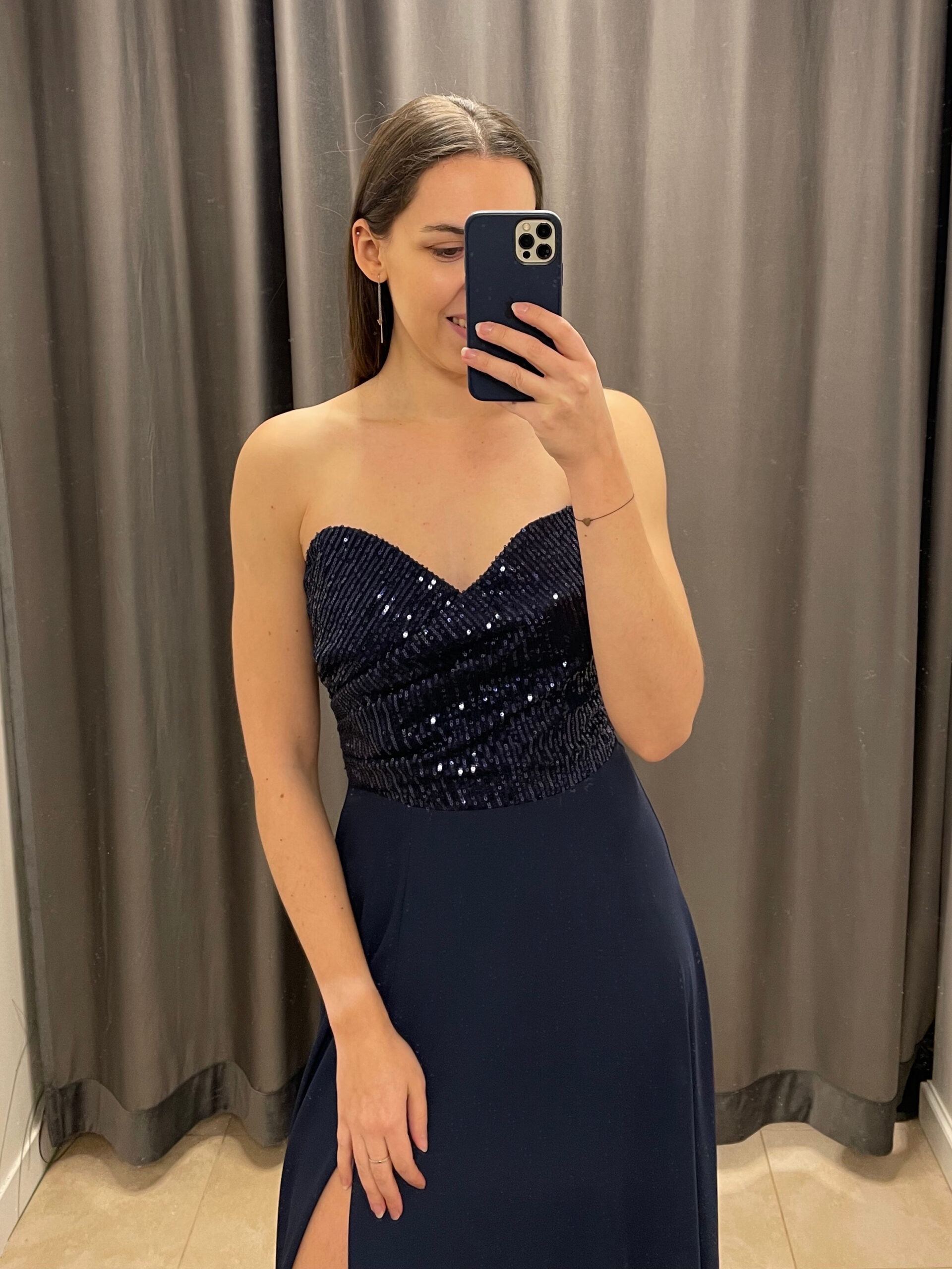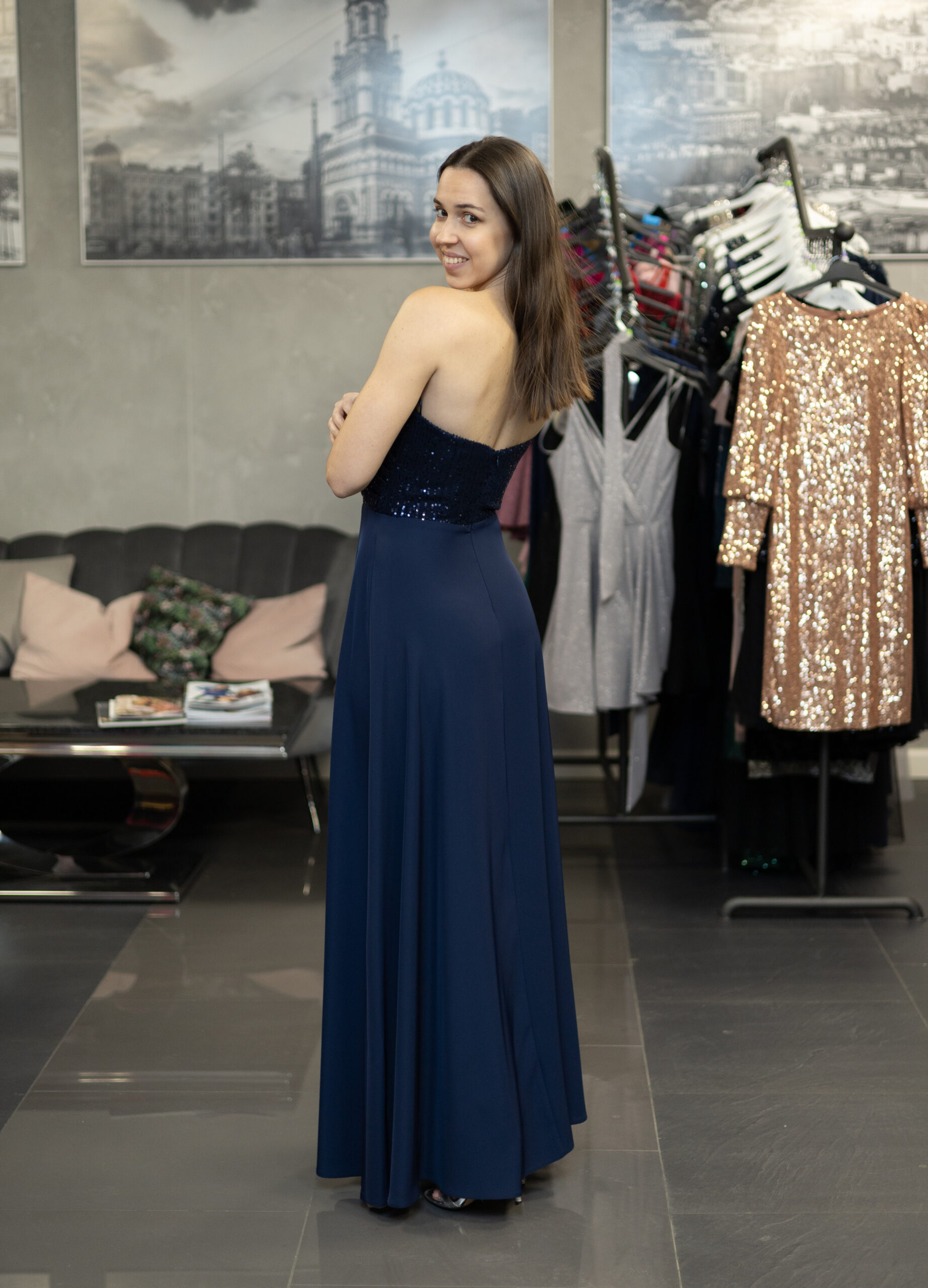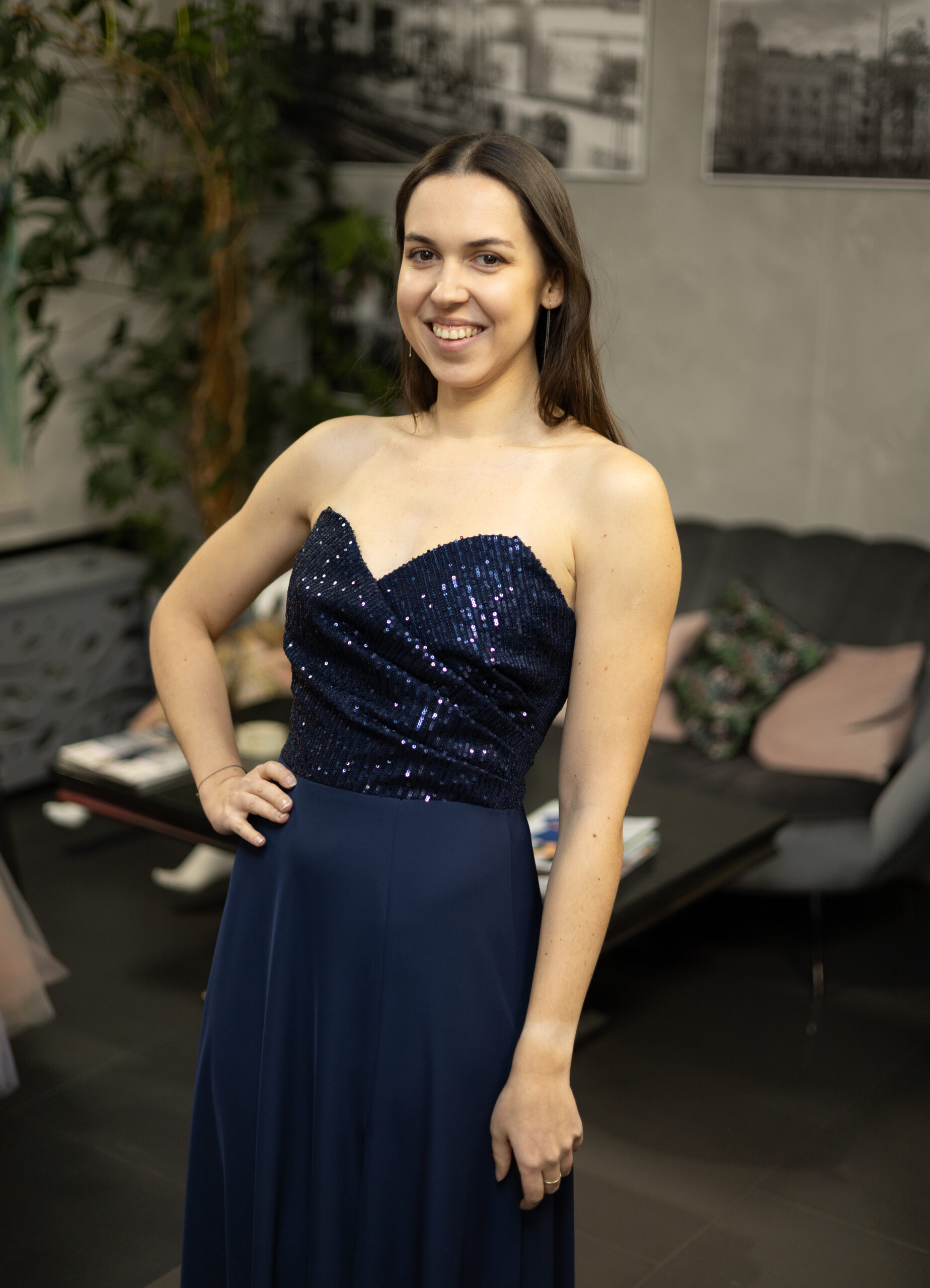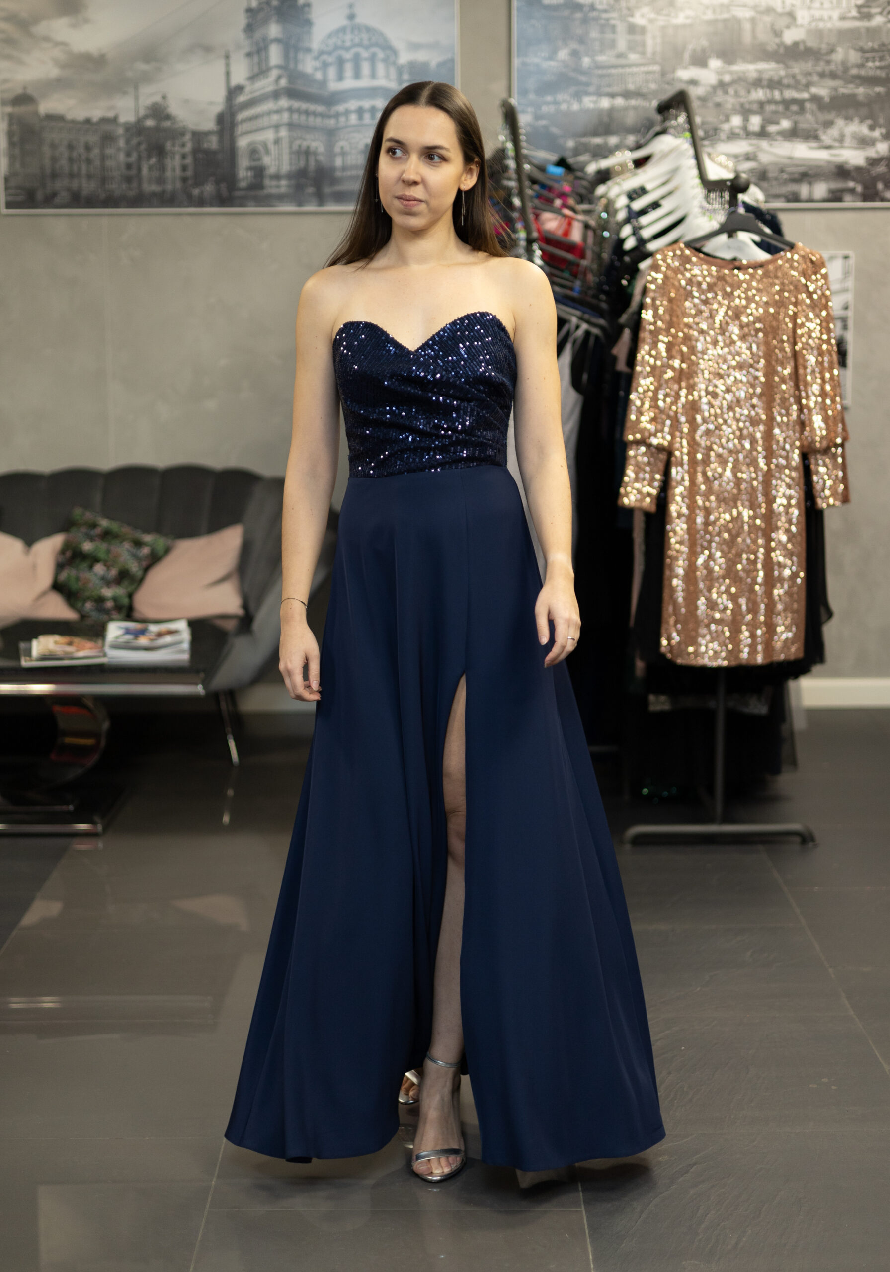 Długa, elegancka sukienka z usztywnianym gorsetem i odpinanymi ramiączkami. Sukienka posiada zdobioną, cekinową górę usztywnioną fiszbinami oraz cienkie, regulowane ramiączka w zestawie. Talia podkreślona odcięciem. Dół prosty, lekko rozkloszowany, z rozcięciem na nogę. Dół wykonany z lejącego materiału, który pięknie układa się w ruchu.