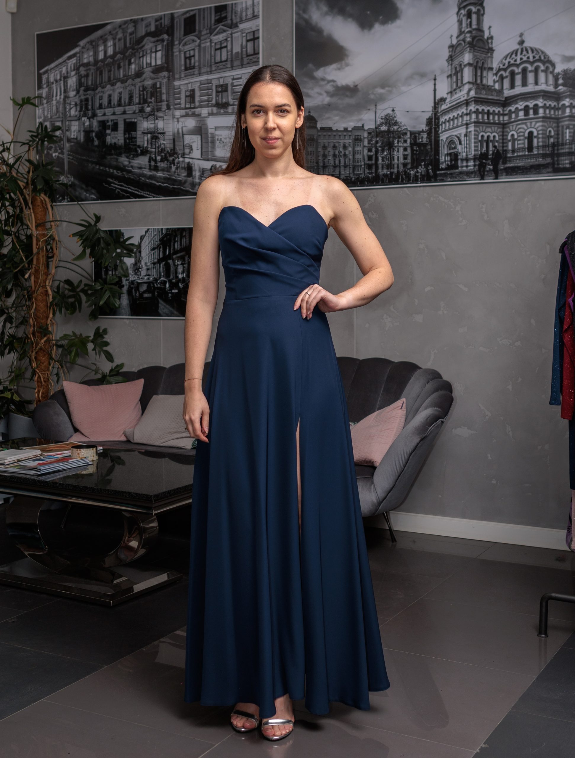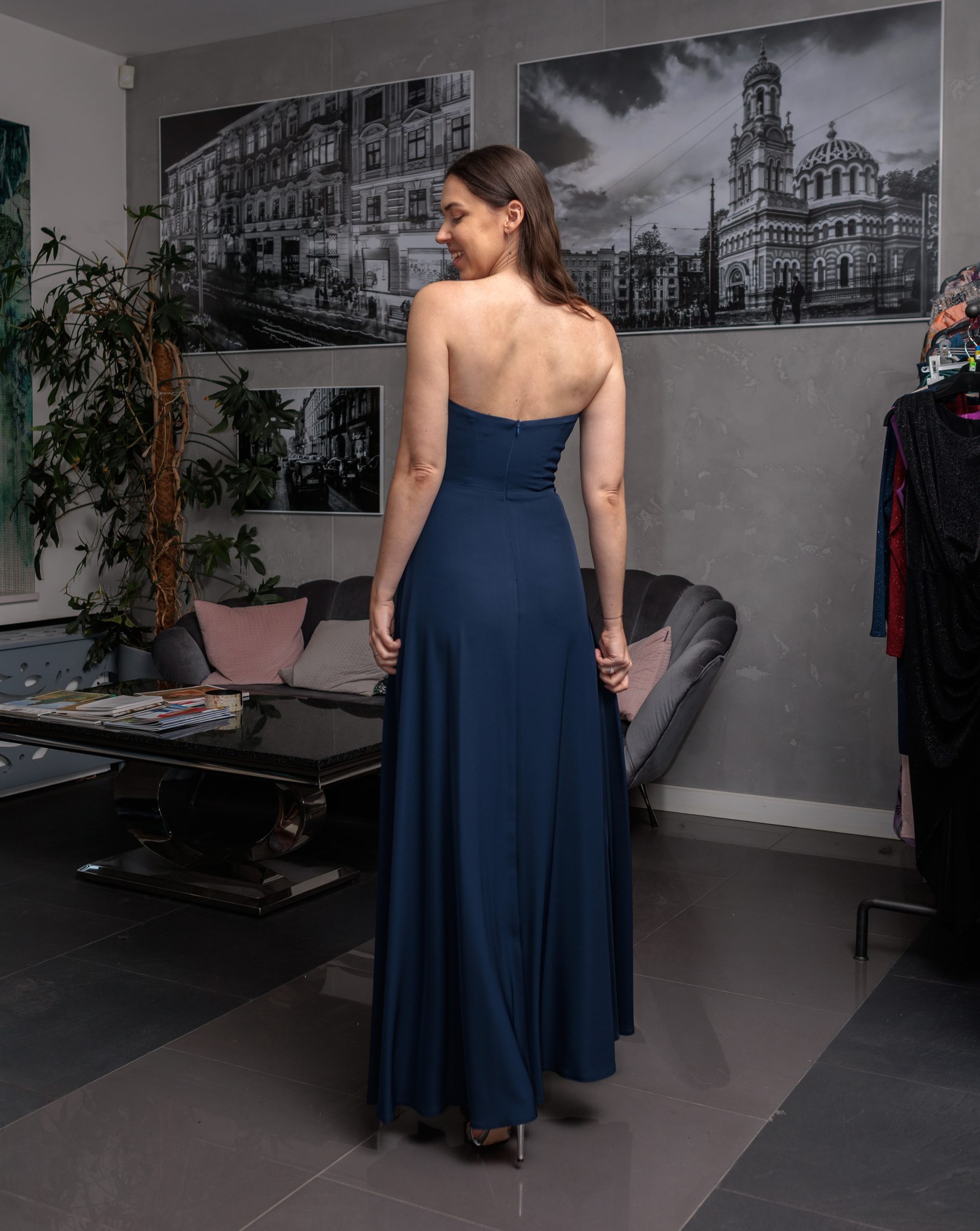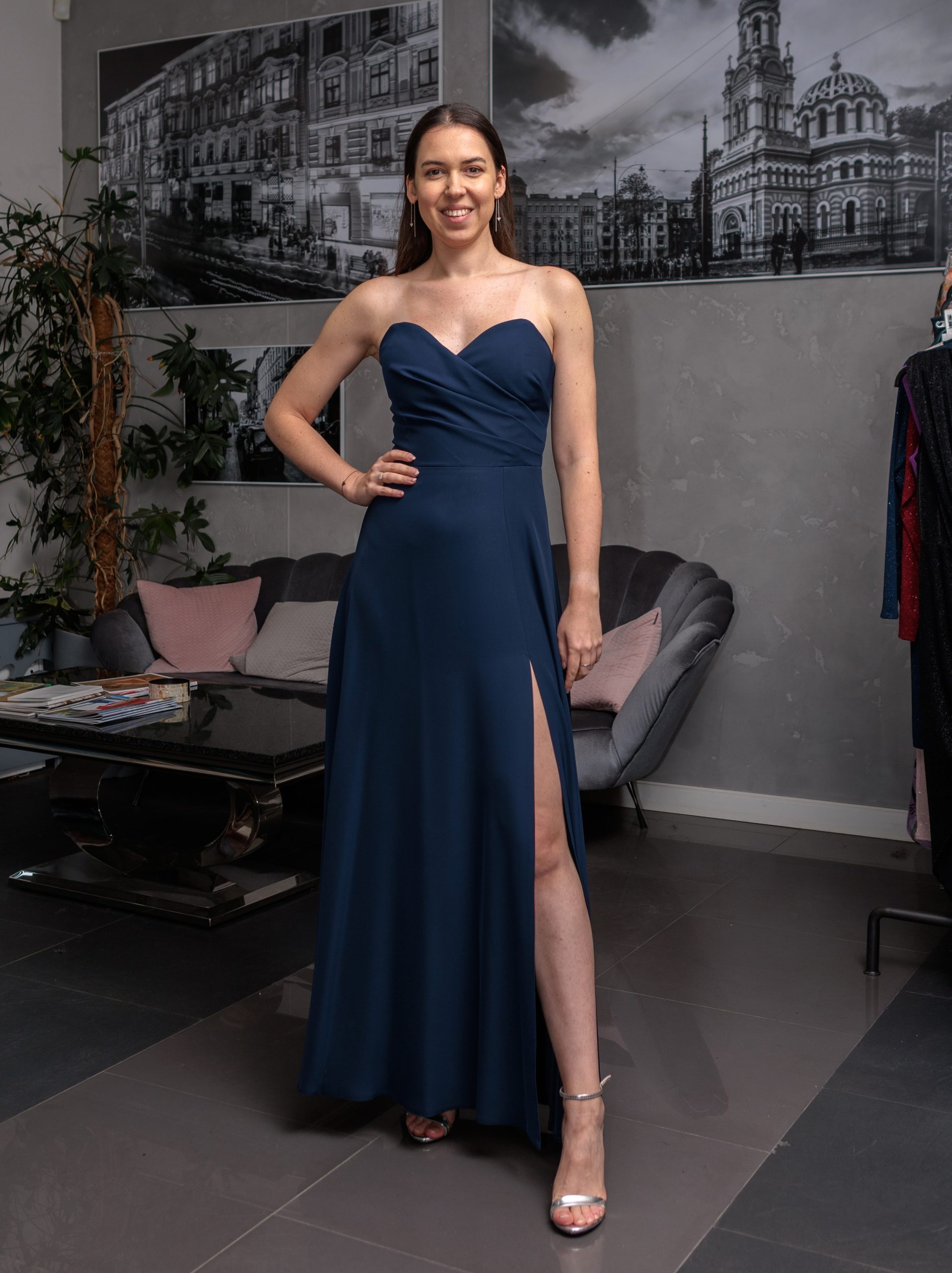 Długa, elegancka sukienka z usztywnianym gorsetem i odpinanymi ramiączkami. Sukienka posiada dopasowaną górę usztywnioną fiszbinami oraz cienkie, regulowane ramiączka w zestawie. Talia podkreślona odcięciem. Dół prosty, lekko rozkloszowany, z rozcięciem na nogę. Dół wykonany z lejącego materiału, który pięknie układa się w ruchu.