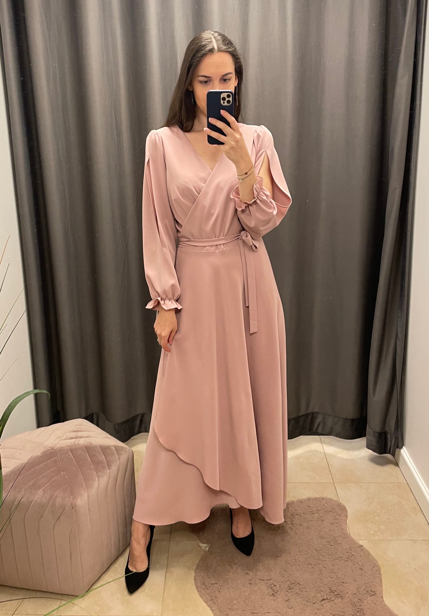 Elegancka sukienka wizytowa maxi plus size. Rozkloszowana sukienka wiązana w pasie, rozmiarem można manewrować ze względu na zapas materiału “na zakładkę” – dzięki temu idealnie dopasujesz ją do swojej sylwetki. Dekolt w literę V pięknie eksponuje szyję i dekolt. Długie rękawki wykończone gumką i z pęknięciem. Sukienka Posiada podszewkę, która sięga do kolan.