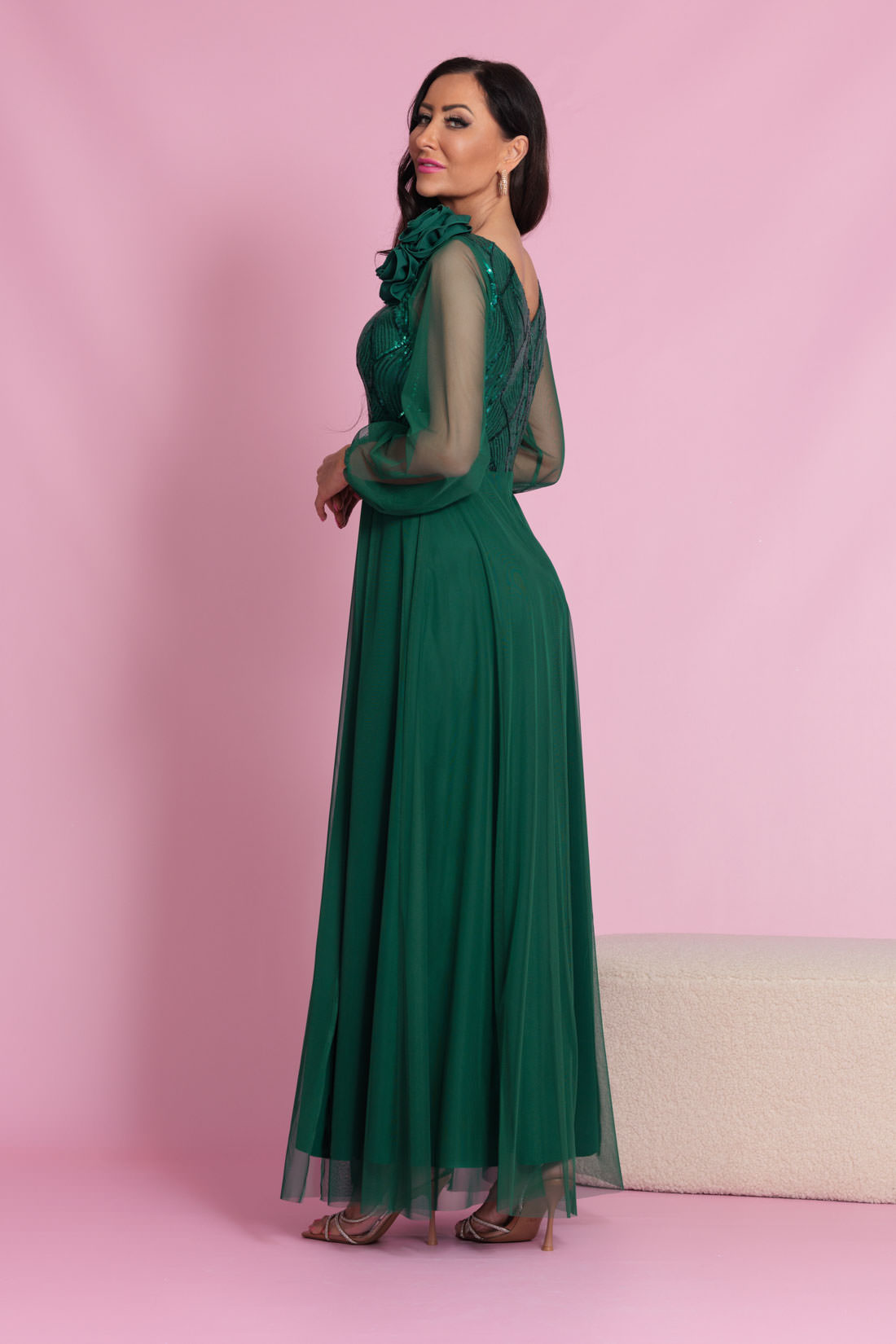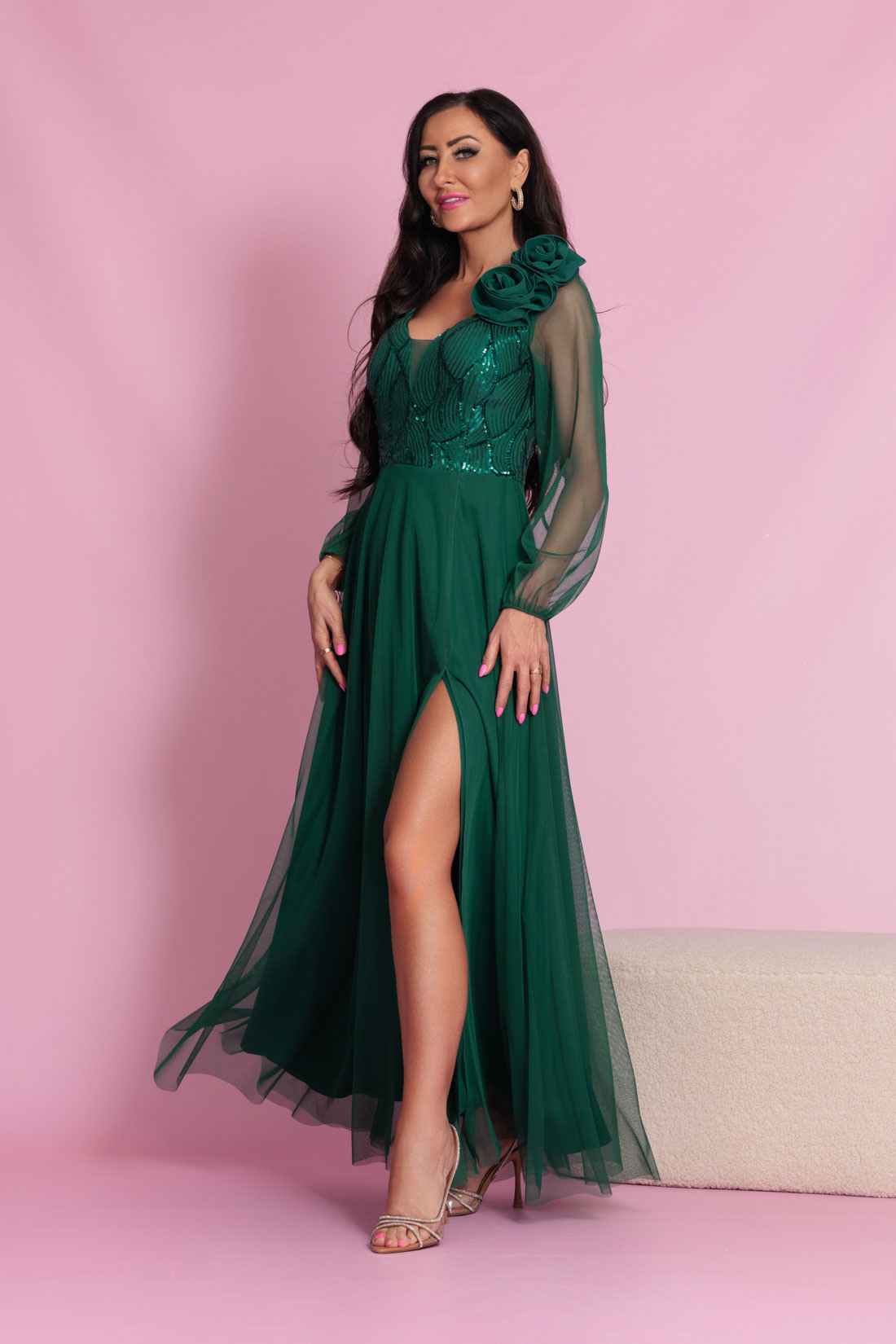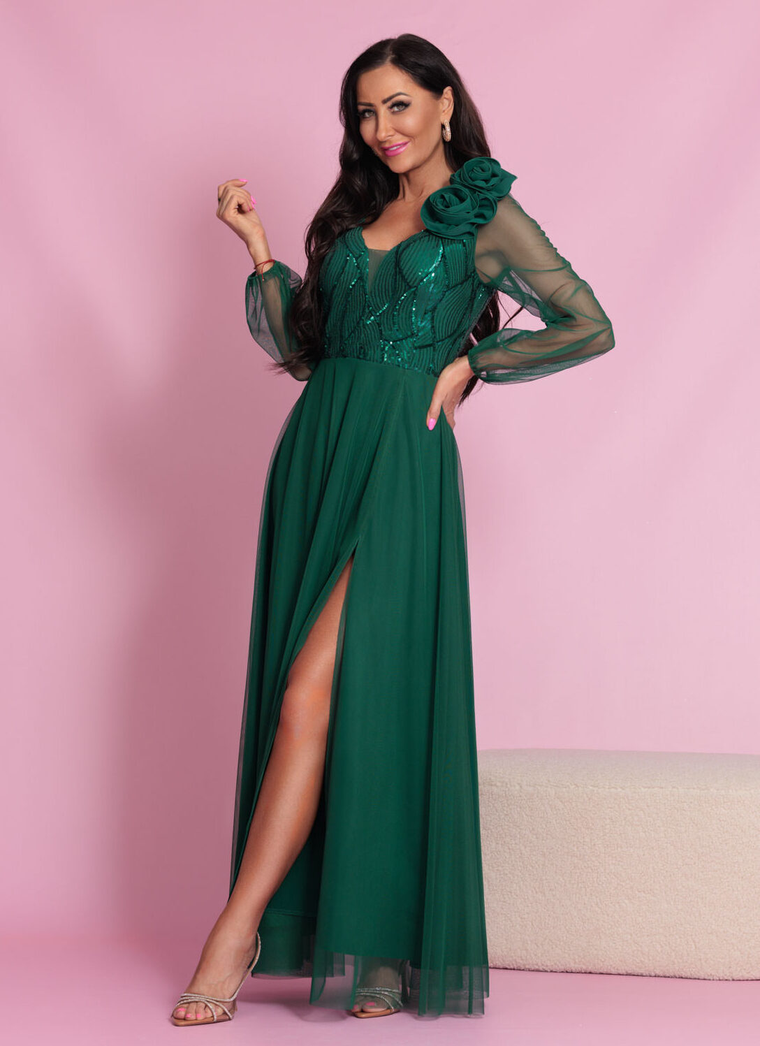 Długa, elegancka sukienka z długim transparentym rękawem. Sukienka posiada dekolt w literę V wykończony siateczką tak, aby pięknie podkreślić zarówno mały jak i większy biust. W zestawie broszka w formie podwójnej róży którą można przypiąć na ramieniu dla asymetrycznego efektu, lub wykorzystać dowolnie w stylizacji. Dodatkowo góra sukienki została subtelnie ozdobiona cekinami. Długi, półprzezroczysty, siateczkowy rękaw wykończony gumeczką. Dół prosty, lekko rozkloszowany, z rozcięciem na nogę oraz delikatną warstwą tiulu. Całość jest niezwykle lekka i pięknie układa się w ruchu.