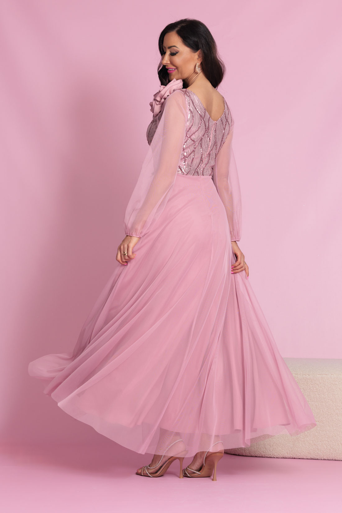 Długa, elegancka sukienka z długim transparentym rękawem. Sukienka posiada dekolt w literę V wykończony siateczką tak, aby pięknie podkreślić zarówno mały jak i większy biust. W zestawie broszka w formie podwójnej róży którą można przypiąć na ramieniu dla asymetrycznego efektu, lub wykorzystać dowolnie w stylizacji. Dodatkowo góra sukienki została subtelnie ozdobiona cekinami. Długi, półprzezroczysty, siateczkowy rękaw wykończony gumeczką. Dół prosty, lekko rozkloszowany, z rozcięciem na nogę oraz delikatną warstwą tiulu. Całość jest niezwykle lekka i pięknie układa się w ruchu.
