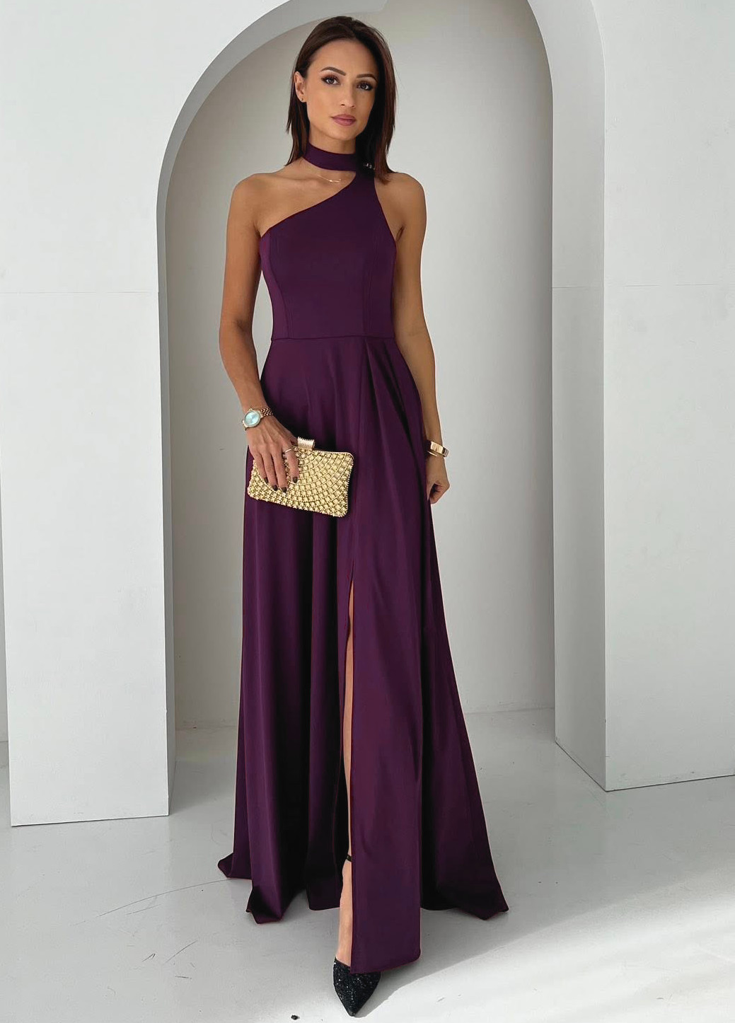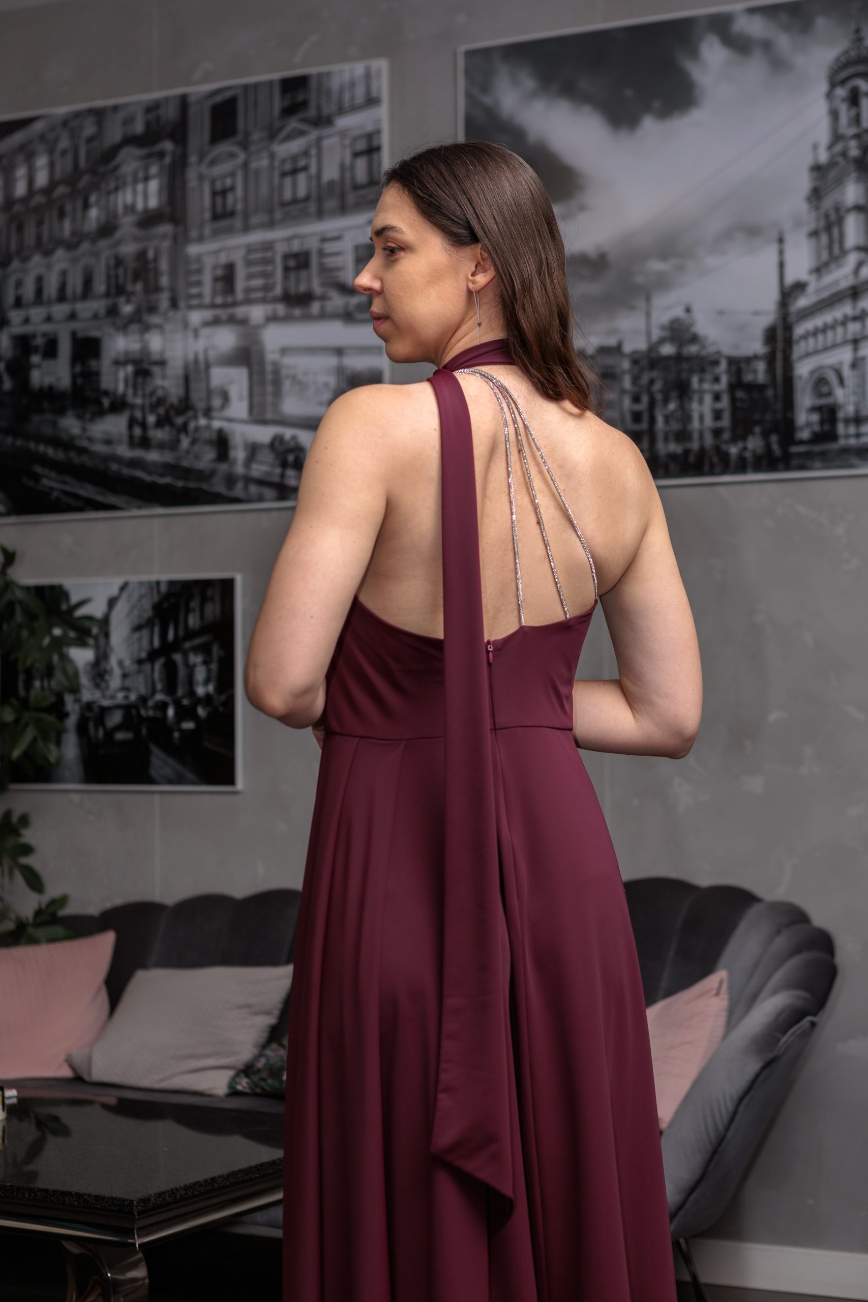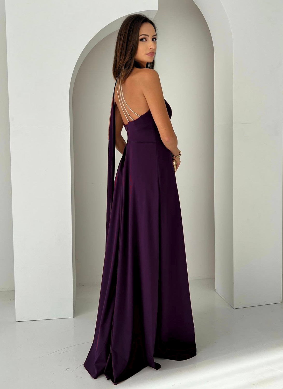 Długa sukienka na jedno ramię z biżuteryjnymi paseczkami i szalem, wykonana z elastycznego materiału w stylu satyny. Sukienka jest asymetryczna, na jedno ramiączko, które z tyłu wykończone jest ozdobnymi, srebrnymi łańcuszkami. Sukienka posiada dodatkowo choker o regulowanym obwodzie, szarfa daje efekt cienkiego szala. Z boku znajduje się rozcięcie, które lekko odsłania i zdecydowanie optycznie wydłuża nogi. Sukienka na kryty zamek. Uszyta w Polsce, z wysokiej jakości elastycznego materiału, który w wyglądzie i dotyku przypomina satynę.