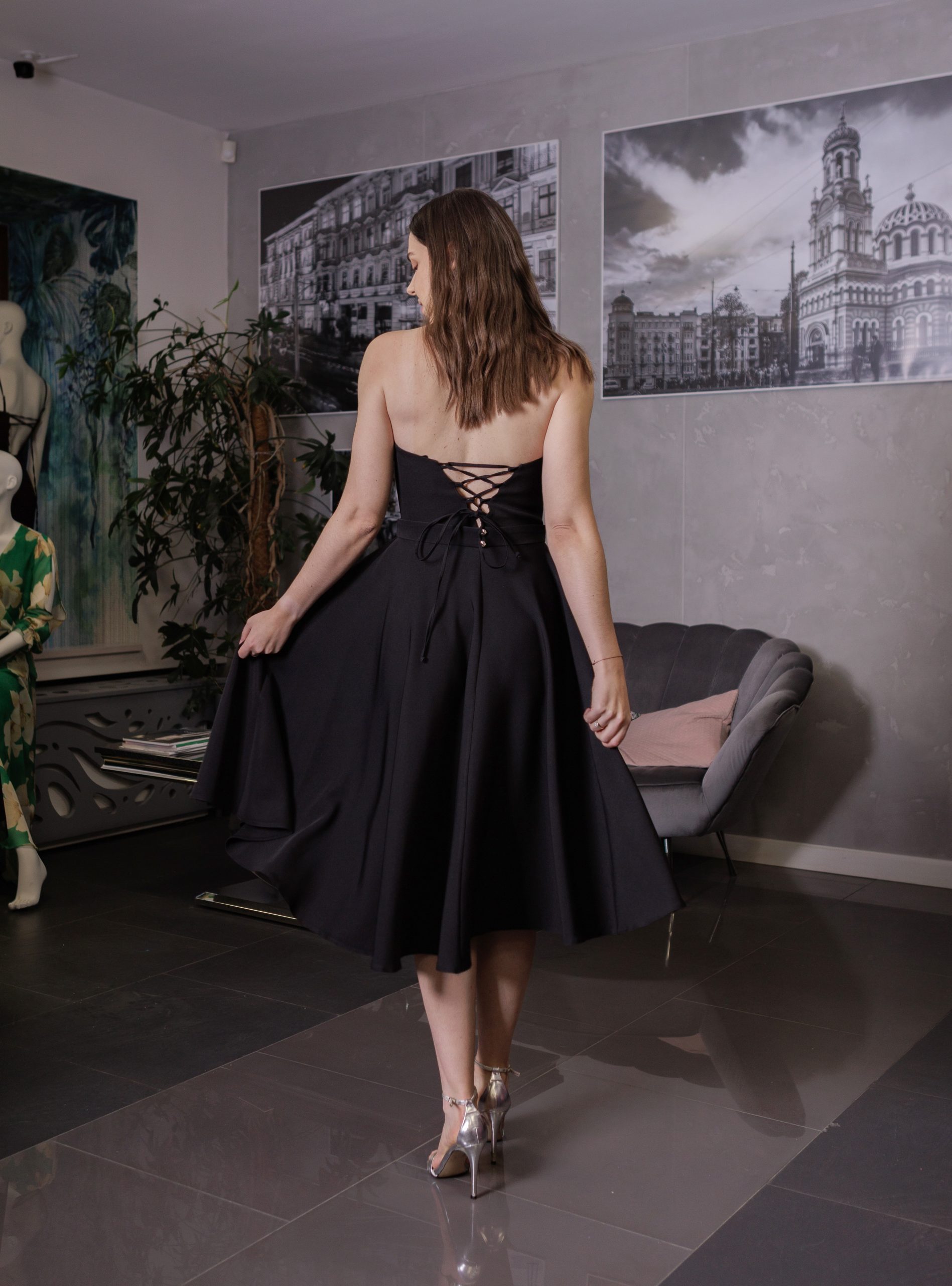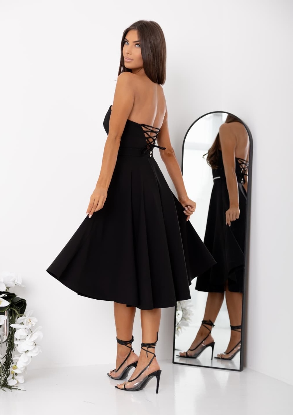 Elegancka sukienka gorsetowa midi w ponadczasowej czerni. Modna i wygodna długość midi – do połowy łydki. Sukienka bez ramiączek z gorsetem usztywnionym pionowymi fiszbinami. Tył sznurowany gorsetowo – dzięki wiązaniu na plecach idealnie dopasujesz rozmiar sukienki do siebie. W zestawie dołączone ramiączka. Odcięcie w talii. W zestawie ozdoby pasek ze srebrnym zdobieniem, zapinany na guziczki. Dół lekki, zwiewny, rozkloszowany. Pięknie wiruje w ruchu.