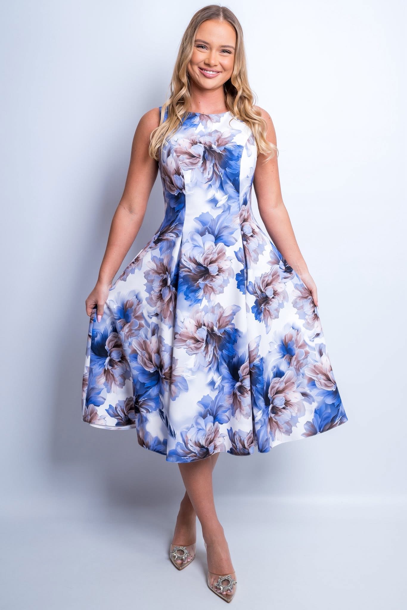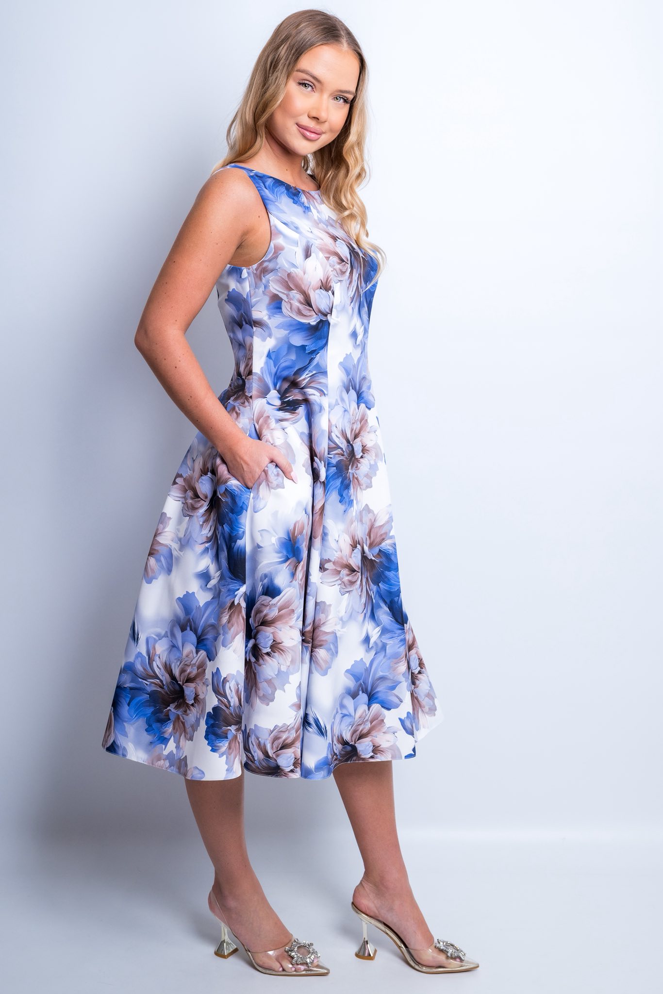Elegancka, rozkloszowana sukienka za kolano. Sukienka bez rękawów z dekoltem w kształcie łódki. Talia została podkreślona dzięki idealnie wyprofilowanym cieniom francuskim – zamiast typowego odcięcia w pasie mamy przeszycia które optycznie nadają sylwetce wcięcie i ukrywają brzuszek. Spódnica sukienki podszyta jest siateczką, która sprawia że materiał nie przylega do ciała. Sukienka posiada również praktyczne kieszenie. Klasyczny krój podkreślający kobiecą sylwetkę. Sukienka wykonana z wysokiej jakości materiału. Wzór w efektowne kwiaty.