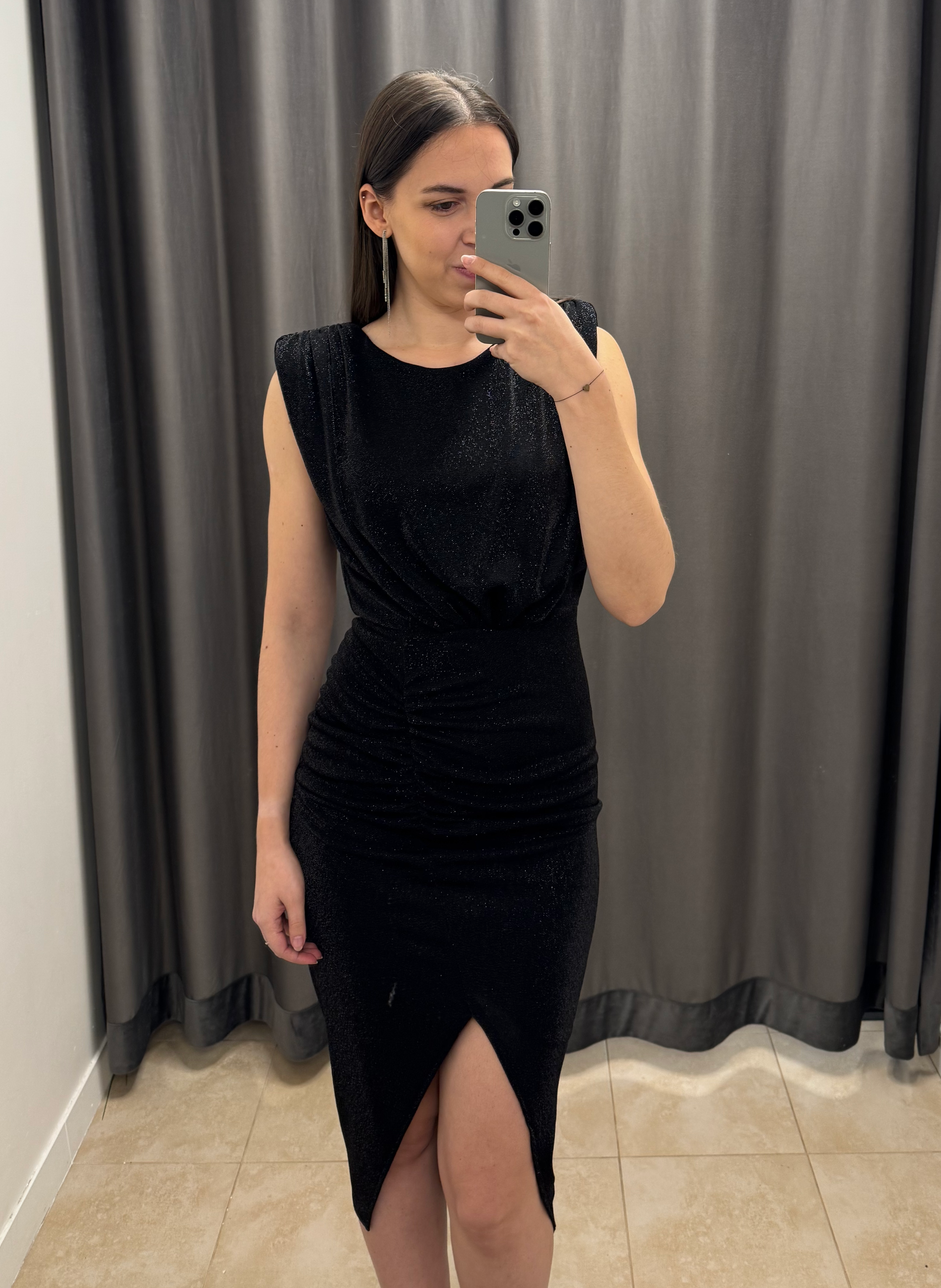 Przepiękna, dopasowana sukienka midi z opalizującego lureksu. Sukienka bez rękawów, z poduszeczkami na ramionach. Dekolt okrągły. W talii oraz na brzuchu marszczenia pięknie podkreślające i modelujące sylwetkę. Głębokie rozcięcie na nogę. Modna i wygodna długość za kolano. Wykonana z wysokiej jakości błyszczącego materiału opalizującego, bardzo elastycznego, który idealnie dopasowuje się do ciała.