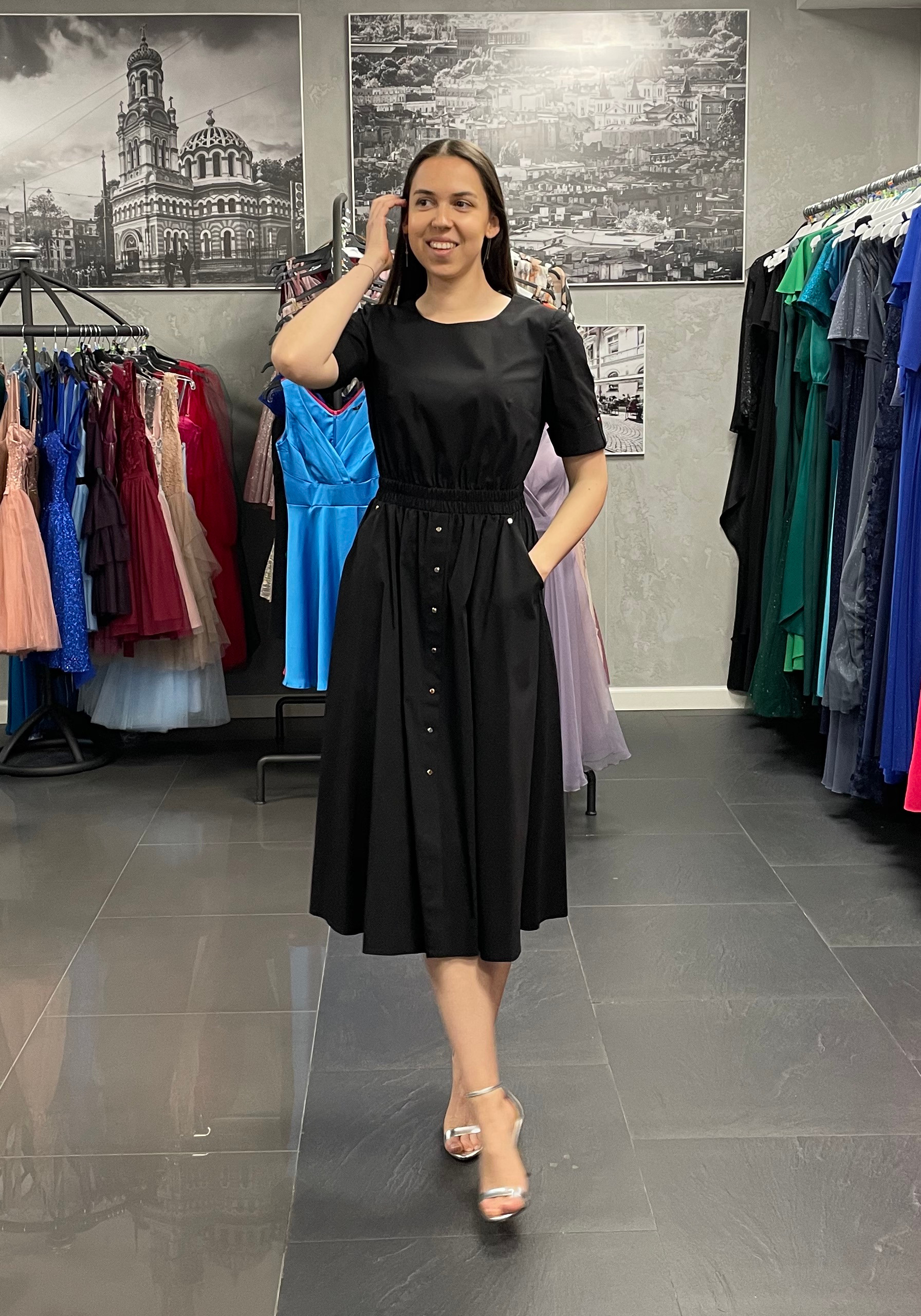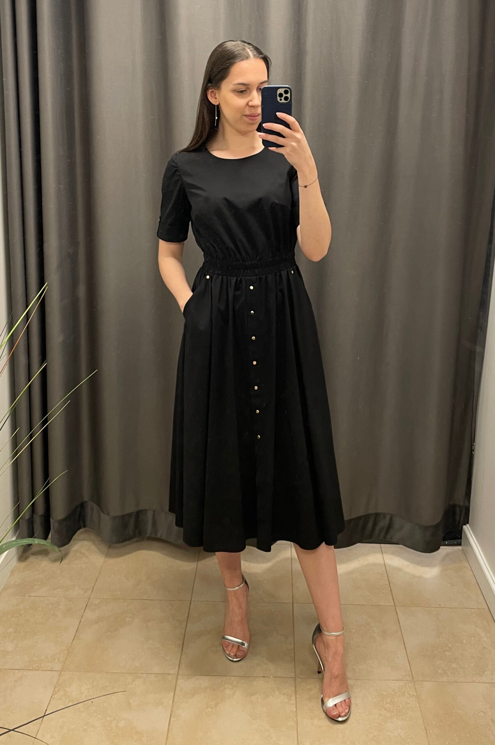 Letnia sukienka bawełniana w ponadczasowym, czarnym kolorze. Sukienka długości midi, o talkowanym kroju imitującym szmizjerkę. Dekolt okrągły, krótki rękawek wykończony mankietem z guzikiem. W talii elastyczna gumka, która pięknie dopasowuje się do sylwetki i podkreśla ją. Sukienka posiada praktyczne kieszenie ozdobione guziczkiem. Dolna część posiada ozdobne guziczki wzdłuż przodu. Uszyta z wysokiej jakości naturalnego, bawełnianego materiału.