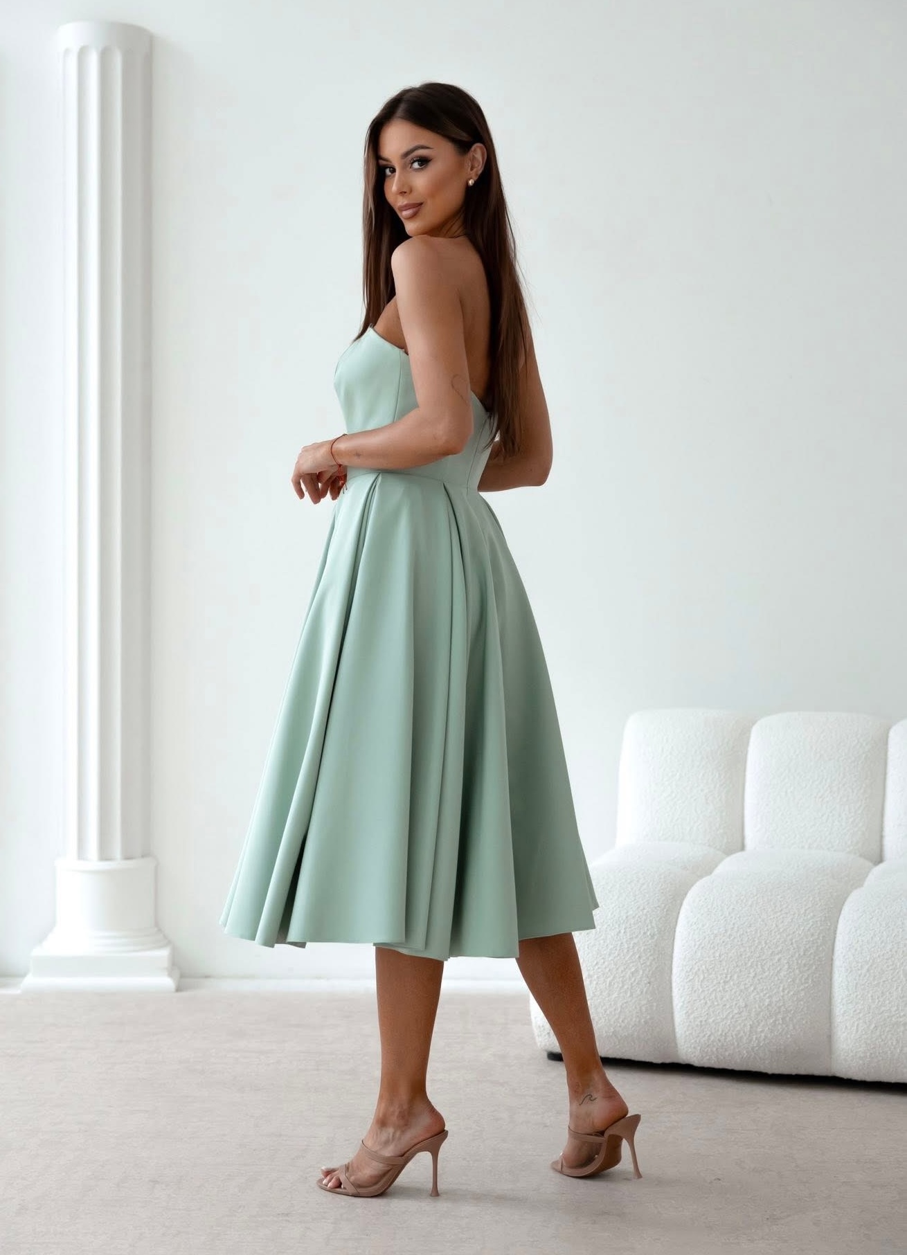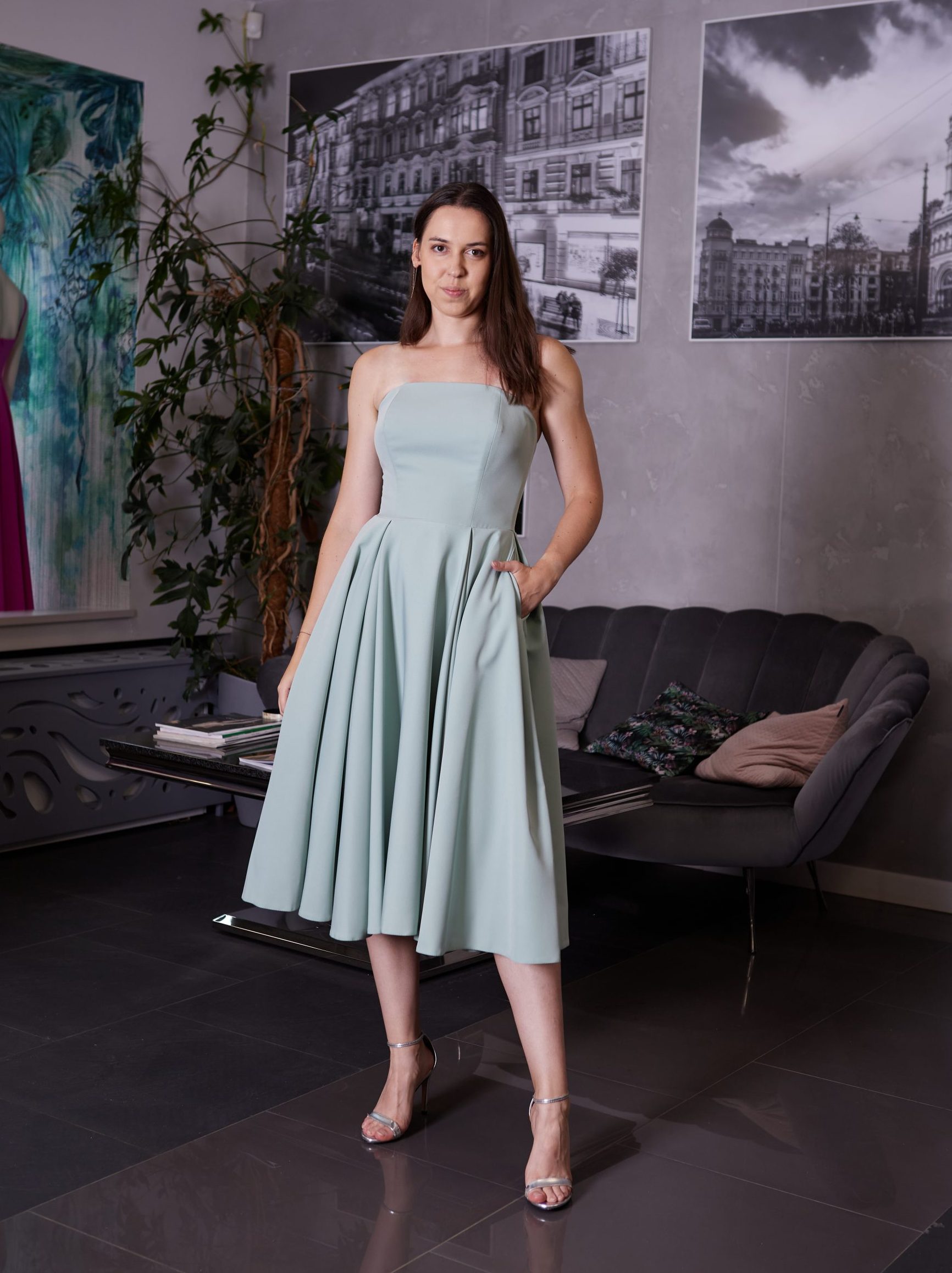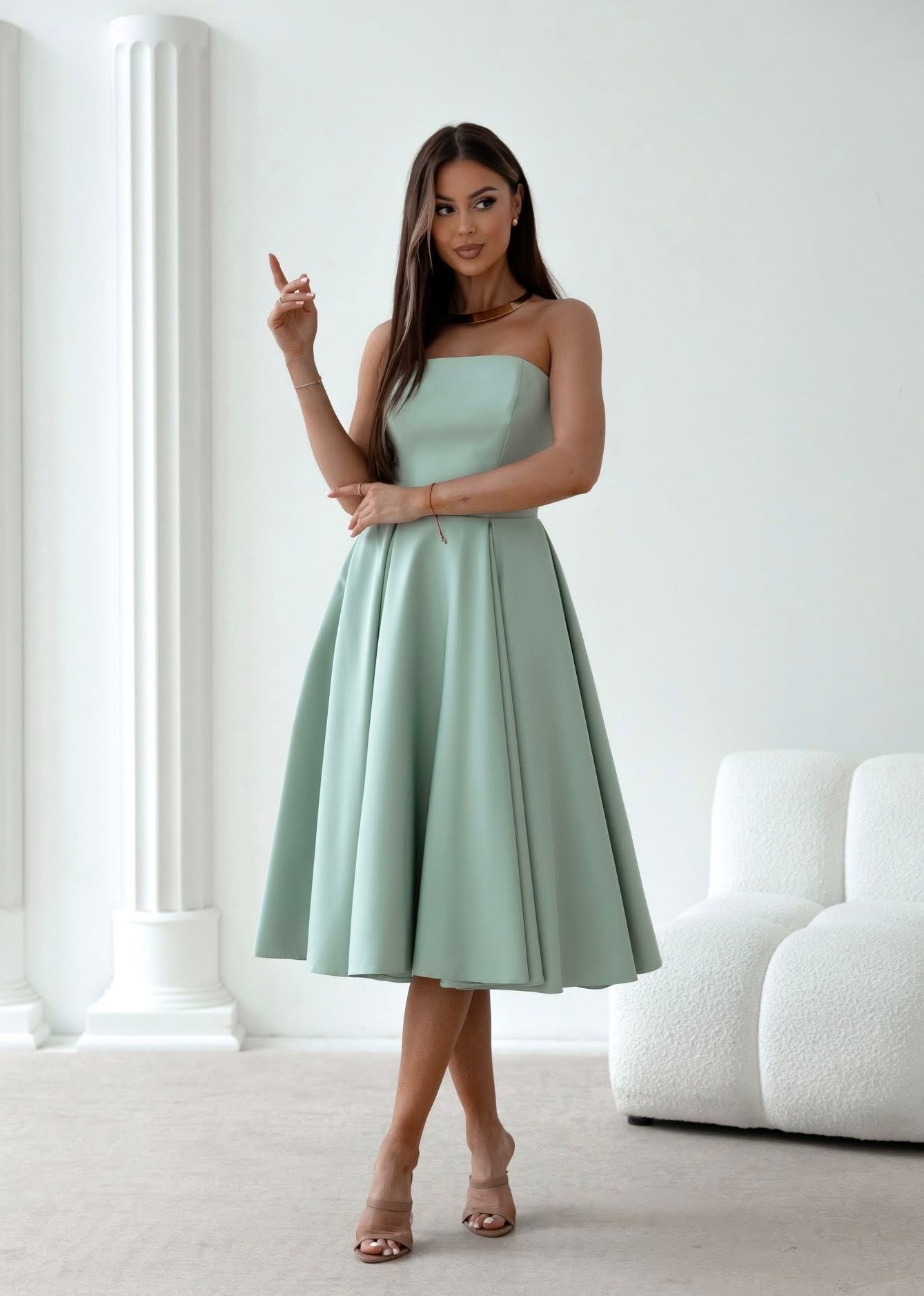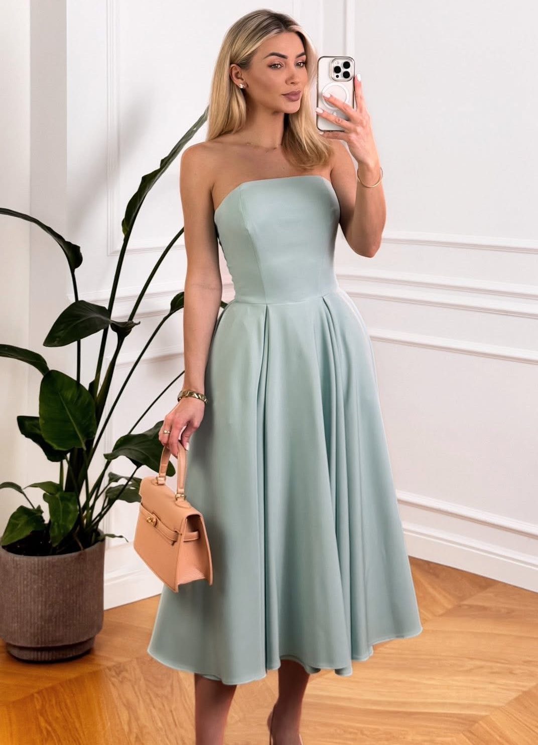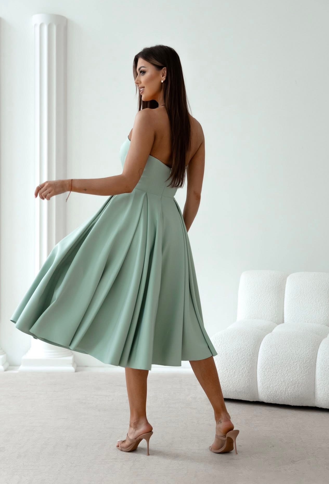 Elegancka sukienka gorsetowa midi w modnym szałwiowym kolorze. Modna i wygodna długość midi – do połowy łydki. Sukienka bez ramiączek z gorsetem usztywnionym pionowymi fiszbinami. Odcięcie w talii. Dół rozkloszowany, z zaszewkami. Sukienka posiada praktyczne kieszenie. Model na podszewce, wykonany z przyjemnego w dotyku materiału. Zapinana z tyłu na kryty zamek.