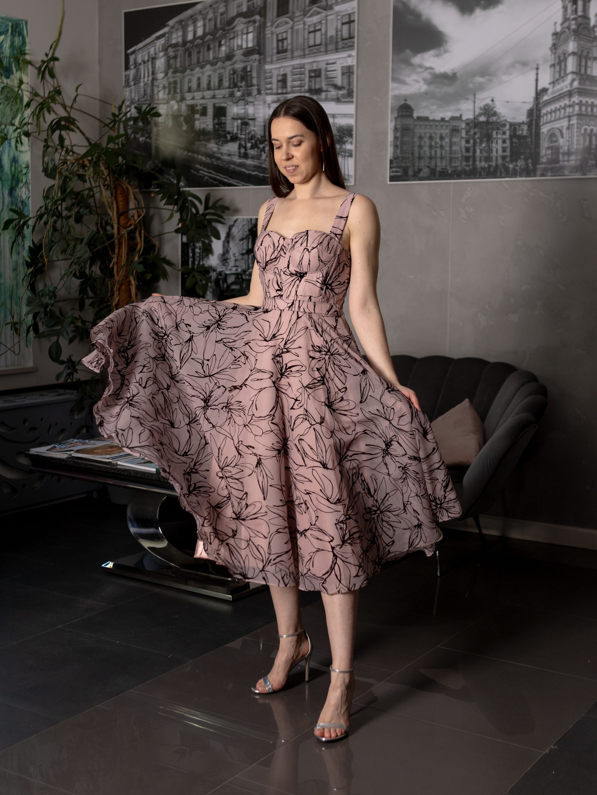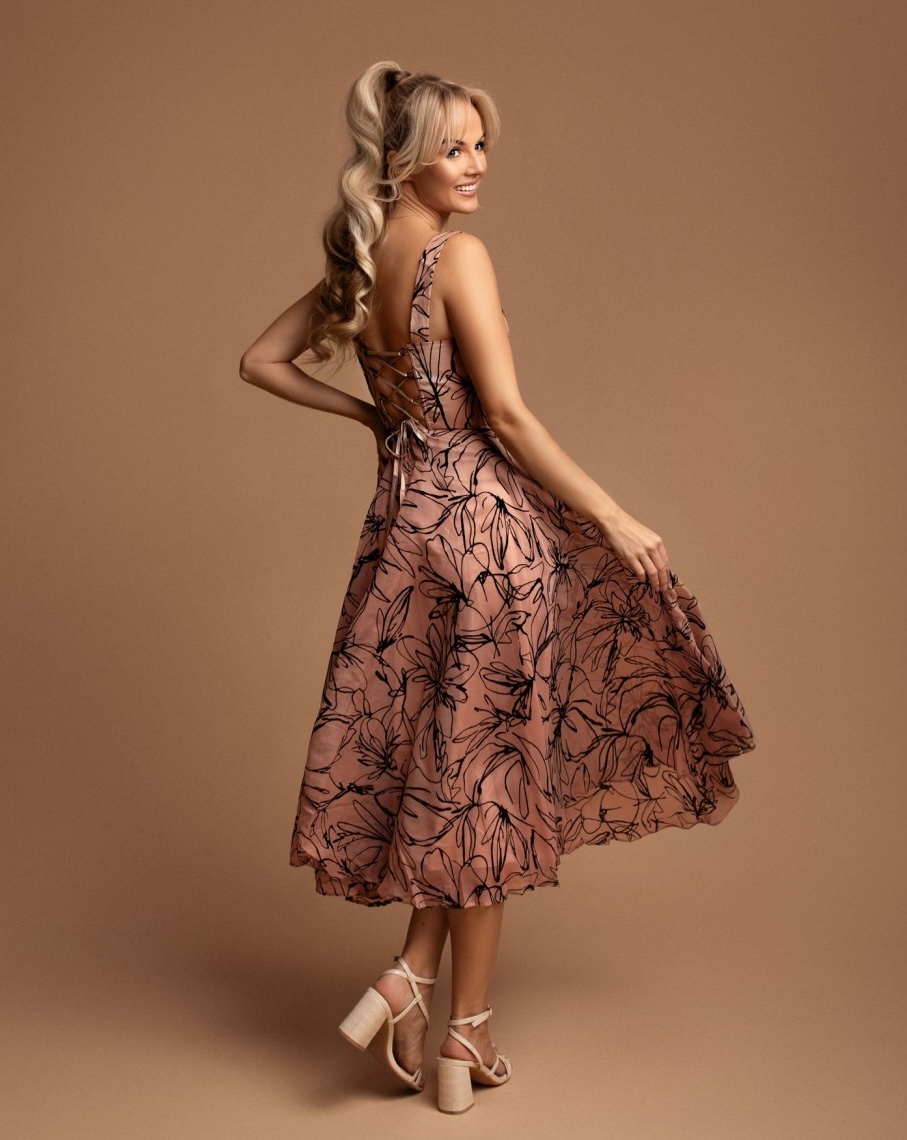 Elegancka sukienka midi z dopasowaną, gorsetową górą w ciepłym, różowym kolorze w czarne kwiatowe wzory. Sukienka na grubszych ramiączkach z górą usztywnioną fiszbinami z gorsetem. Idealnie dopasujesz ją da siebie dzięki wiązaniu na plecach. Talia podkreślona odcięciem z paskiem. Materiał w ciepłym różowym kolorze z drobnymi czarnymi kwiatkami. Modna i wygodna długość midi – do połowy łydki.