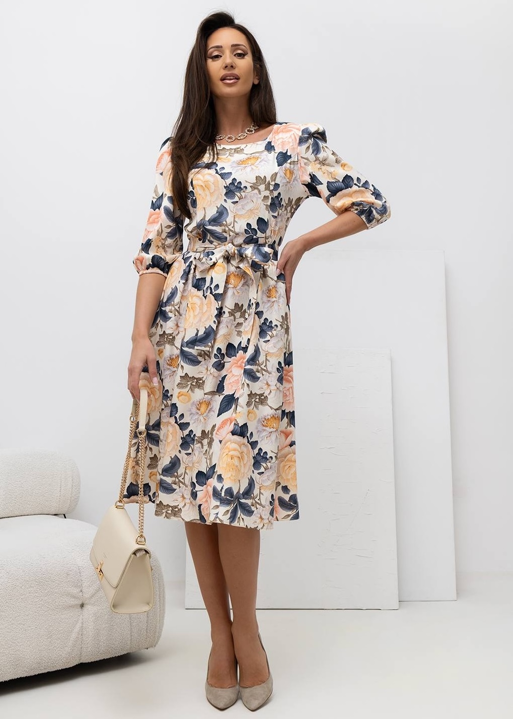 Elegancka, rozkloszowana sukienka za kolano z rękawkiem. Sukienka z rękawkiem o długości 3/4 z dekoltem w kształcie łódki. Rękawki wykończone gumką. Talia została podkreślona dzięki idealnie wyprofilowanym cieniom francuskim – zamiast typowego odcięcia w pasie mamy przeszycia które optycznie nadają sylwetce wcięcie i ukrywają brzuszek. W zestawie pasek, którym można stworzyć odciętą i podkreśloną talię. Sukienka posiada również praktyczne kieszenie. Klasyczny krój podkreślający kobiecą sylwetkę. Sukienka wykonana z wysokiej jakości materiału