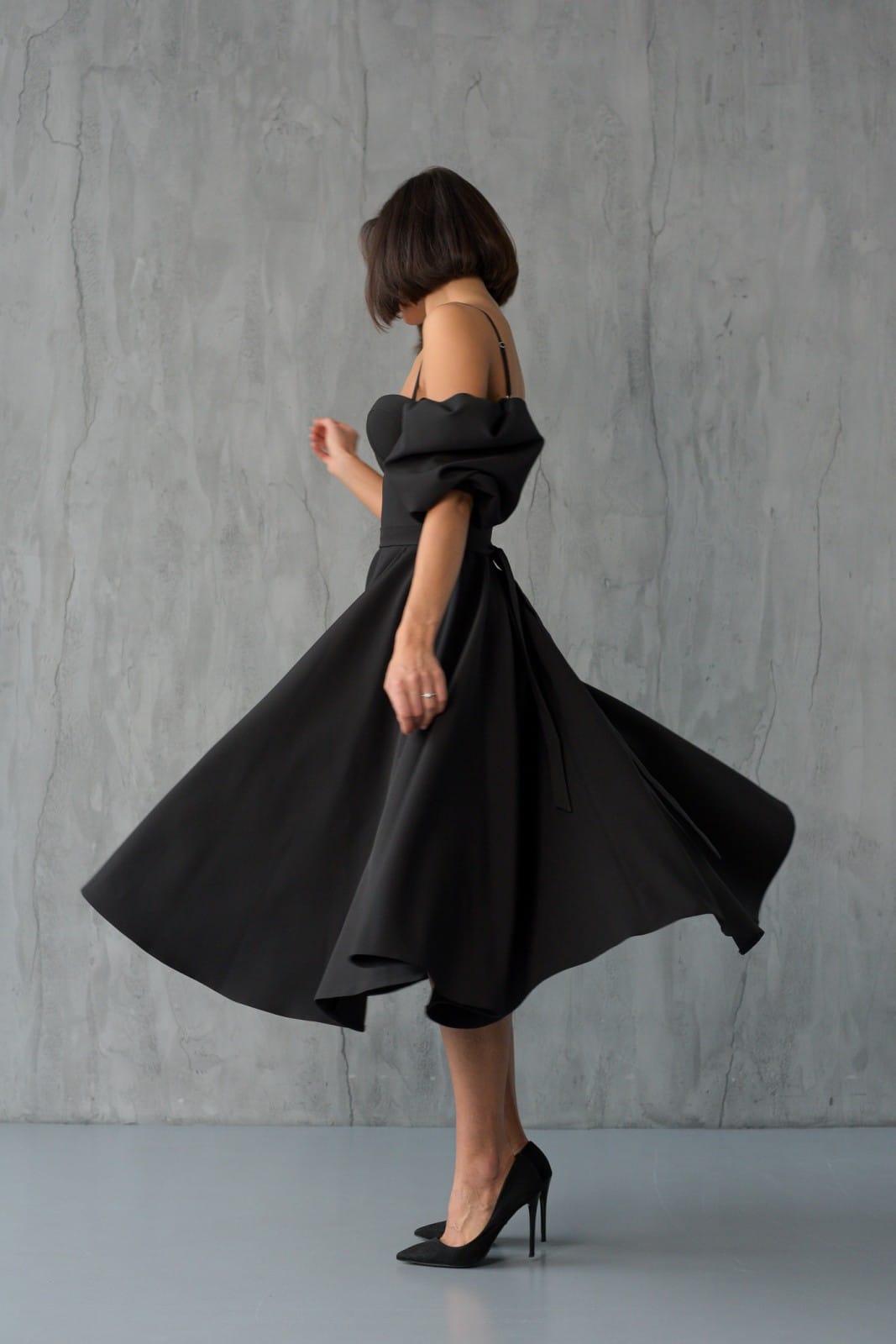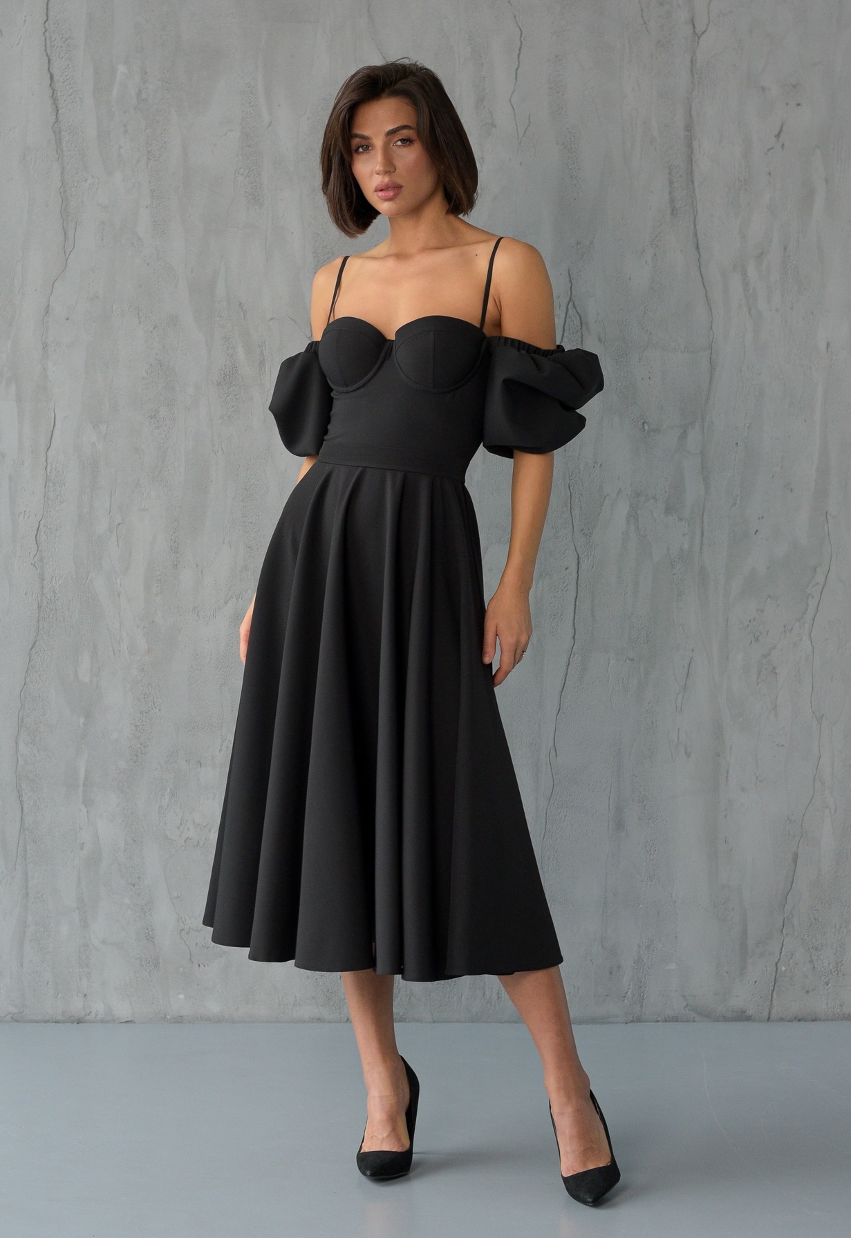 Efektowna gorsetowa sukienka midi z bufiastymi rękawami. Sukienka na ramiączkach, cienkich ramiączkach z dodatkowym, szerokim rękawkiem do łokcia, który można nosić na ramionach lub opuszczony. Góra gorsetowa, z usztywnioną miseczką. Dół sukienki jest rozkloszowany. Wykonana z wysokiej jakości materiału. Efekt księżniczki.