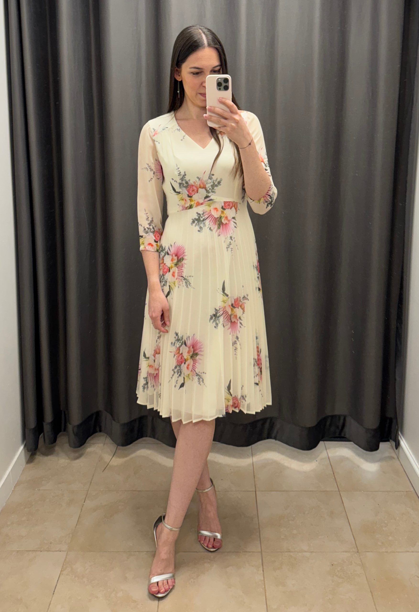 Elegancka sukienka o długości do kolana z wyjątkowego materiału. Delikatny kwiatowy motyw na jasnym, białym tle. Podkreślająca sylwetkę góra oraz rozkloszowany, delikatnie plisowany dół. Dekolt pięknie eksponuje biust. Rękaw jest luźny, długości 3/4 i wykończony gumeczką. Model zapinany z tyłu na kryty zamek. Posiada elastyczną, oddychającą podszewkę, dzięki temu sukienka jest bardzo wygodna.