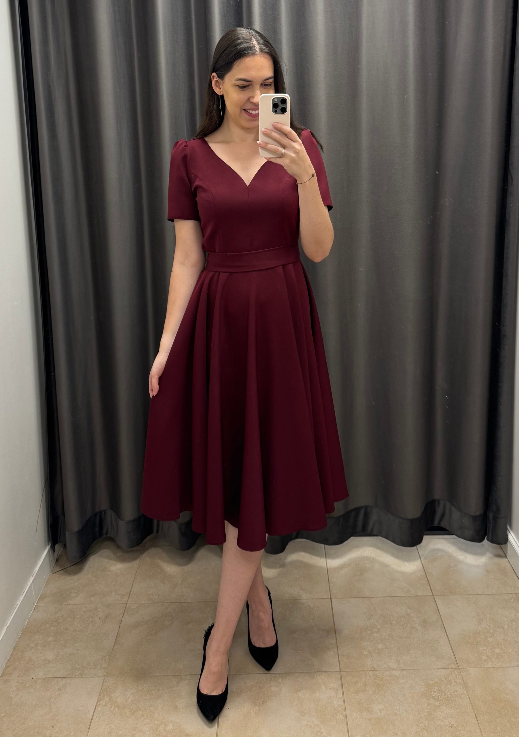 Elegancki i najmodniejszy fason tego sezonu – rozkloszowana sukienka w długości midi w kolorze bordowym. Dekolt w serduszko, wyprofilowany w literę V, plecy zabudowane. Podwójna róża na odpinanej broszce została przypięta przy dekolcie dla asymetrycznego efektu, można wykorzystać ją do przypięcia w innym miejscu, lub zupełnie odpiąć. Krótki rękawek. Talia podkreślona z dodatkowym paskiem w kolorze sukienki, który można wiązać na dowolne sposoby. Dół z koła, rozkloszowany, cudownie wiruje w ruchu. Modna i wygodna długość midi.
