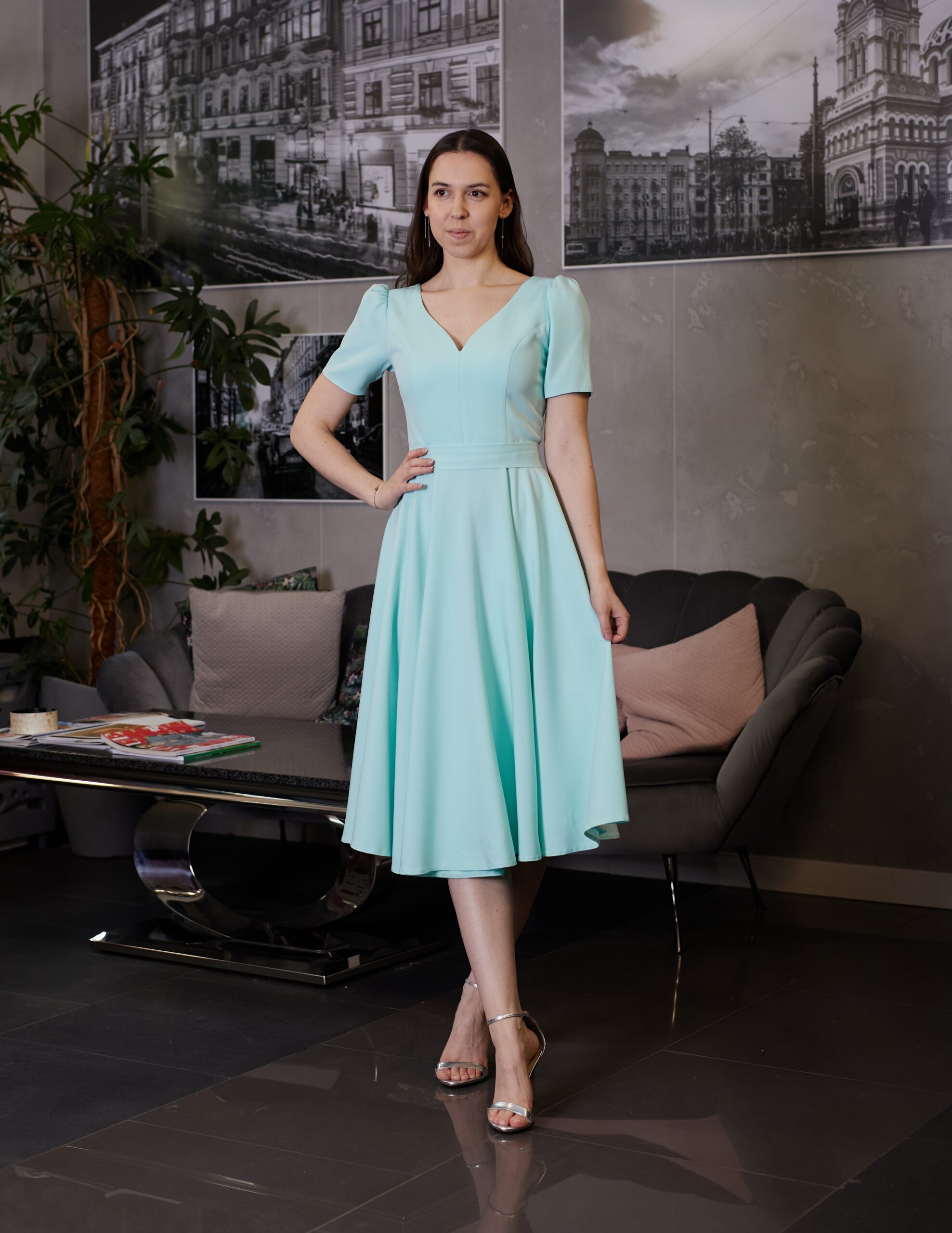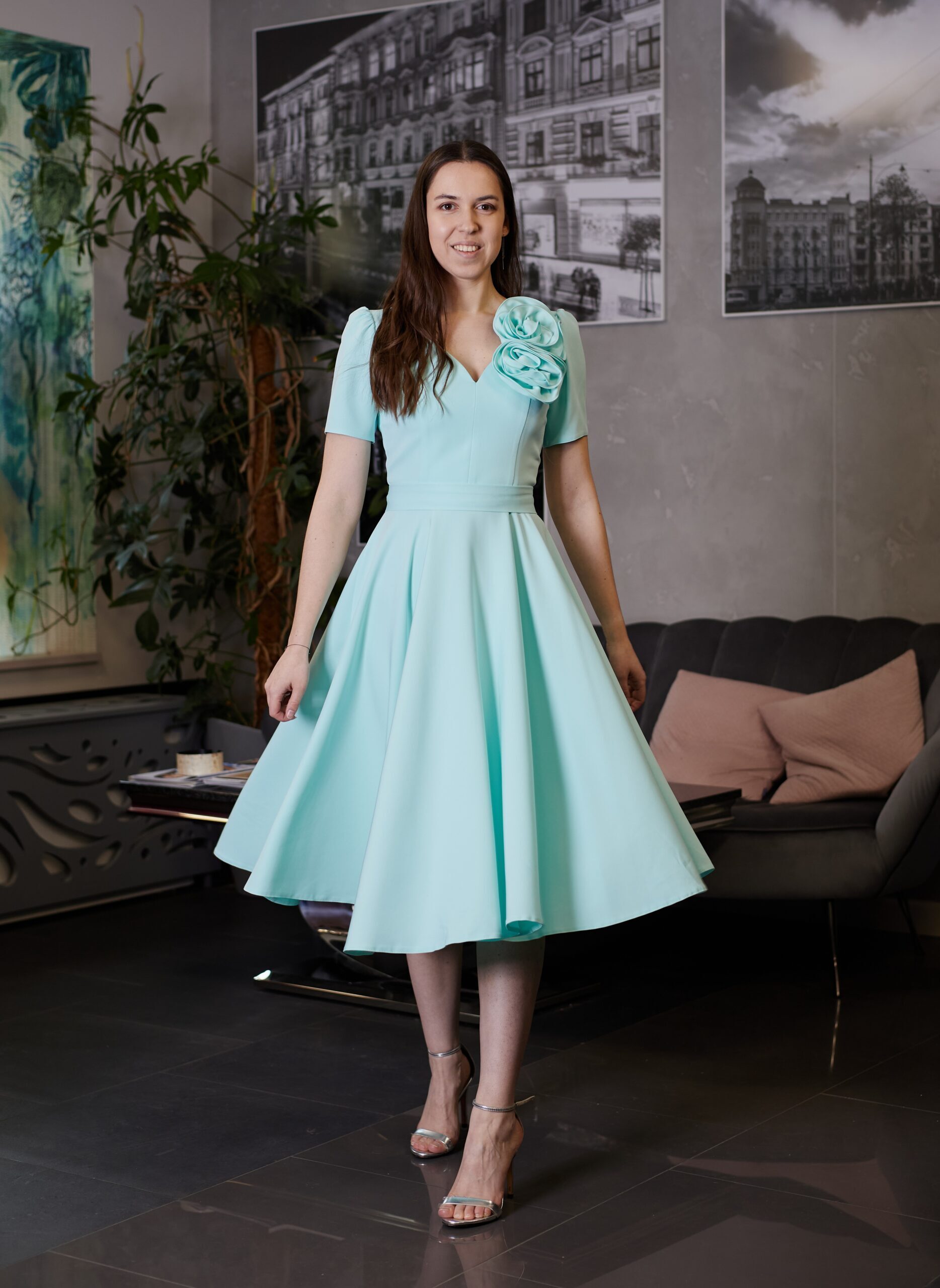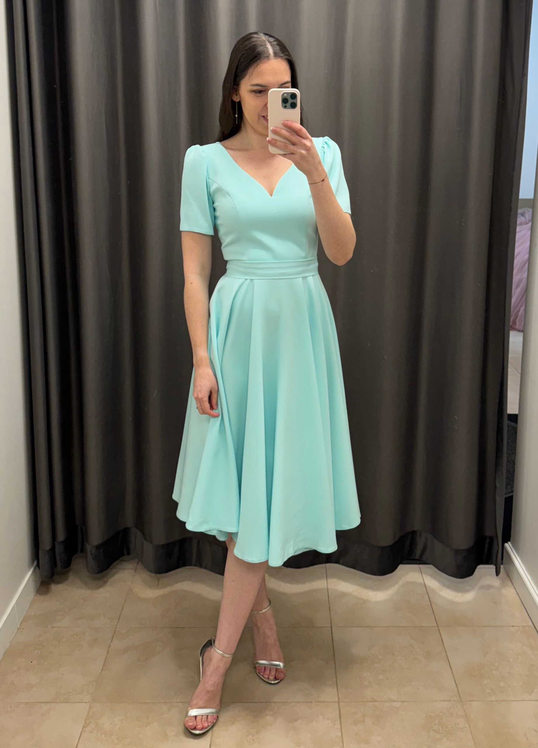 Elegancki i najmodniejszy fason tego sezonu – rozkloszowana sukienka w długości midi w modnym kolorze mięty. Dekolt w serduszko, wyprofilowany w literę V, plecy zabudowane. Podwójna róża na odpinanej broszce została przypięta przy dekolcie dla asymetrycznego efektu, można wykorzystać ją do przypięcia w innym miejscu, lub zupełnie odpiąć. Krótki rękawek. Talia podkreślona z dodatkowym paskiem w kolorze sukienki, który można wiązać na dowolne sposoby. Dół z koła, rozkloszowany, cudownie wiruje w ruchu. Modna i wygodna długość midi.