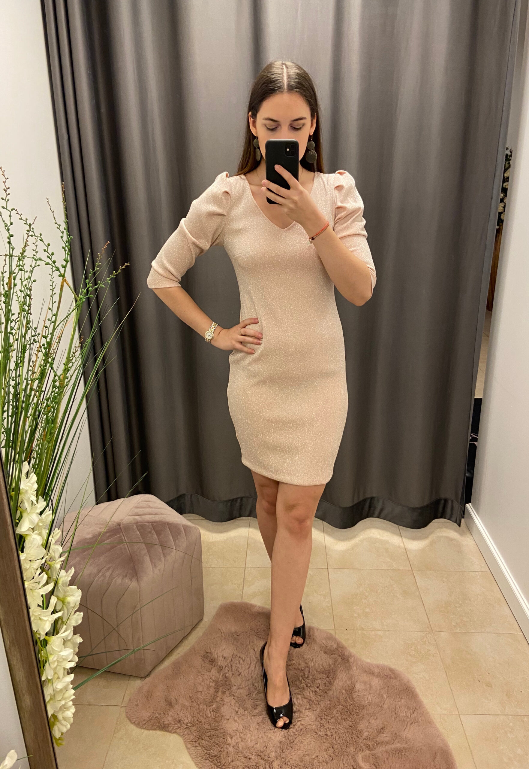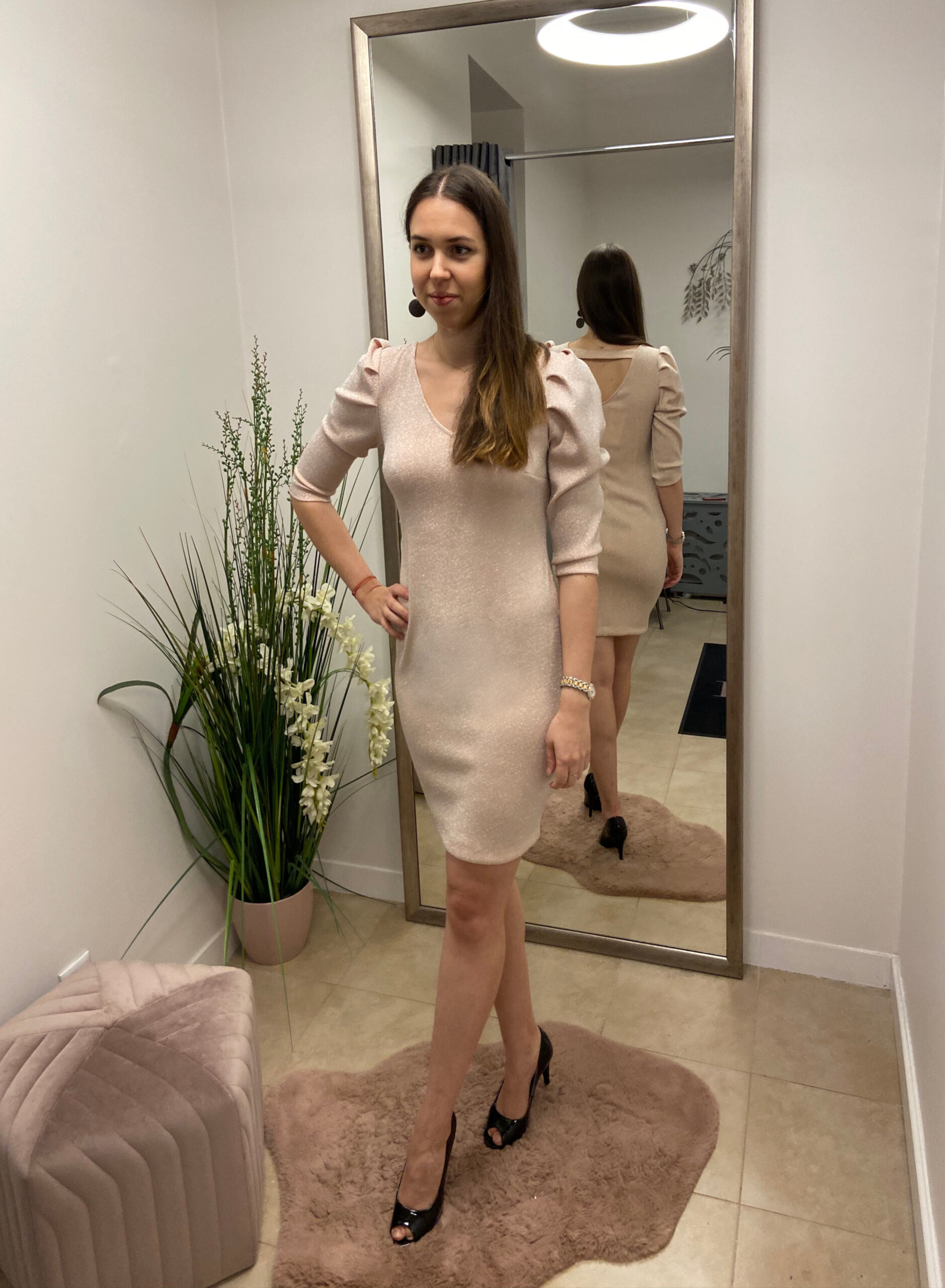 Dopasowana sukienka mini w kolorze pudrowym z błyszczącą srebrną nitką. Dekolt w kształcie litery V oraz wycięcie na plecach. 3/4 rękaw lekko bufiasty z marszczeniami. Bez zapięcia i podszewki.
