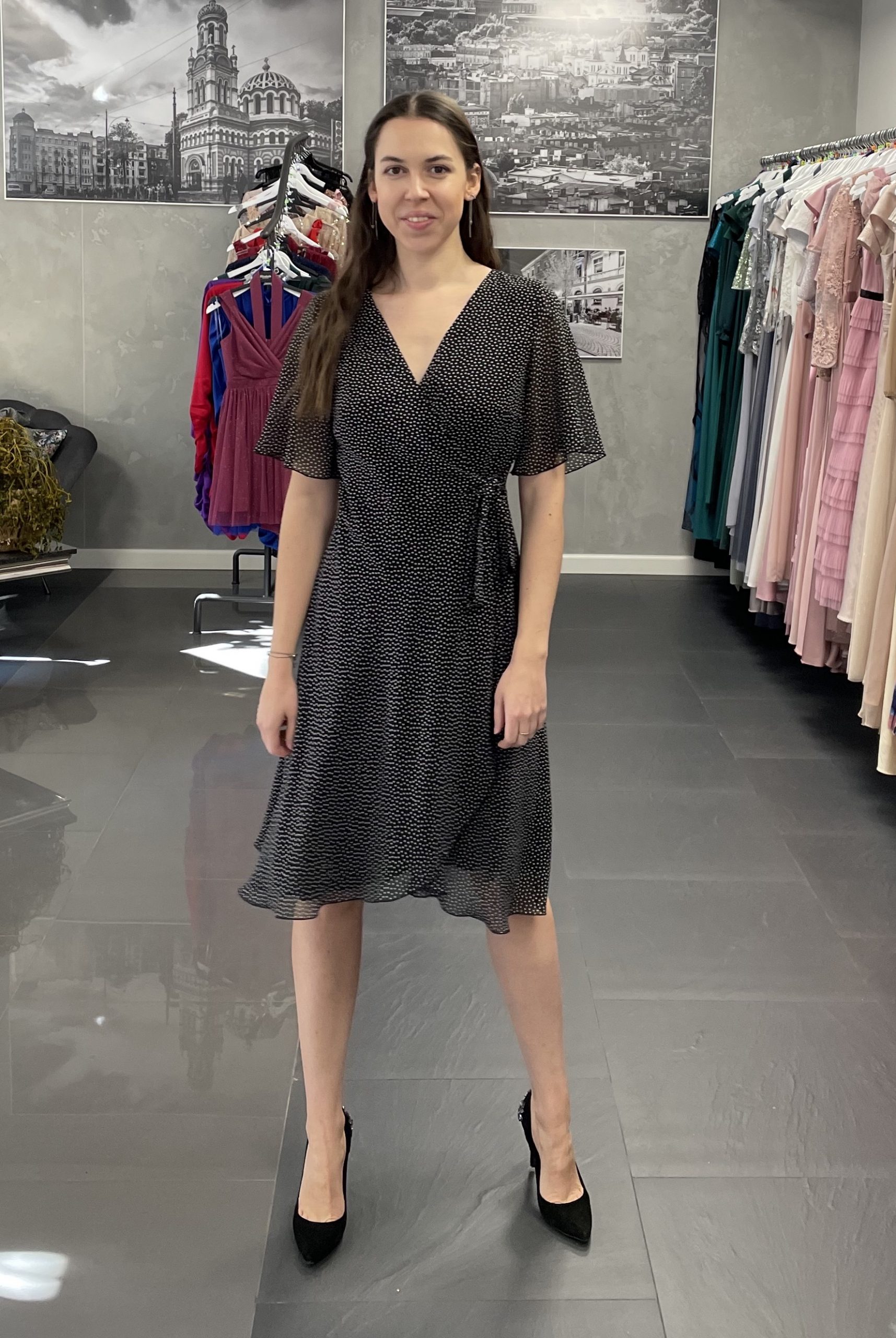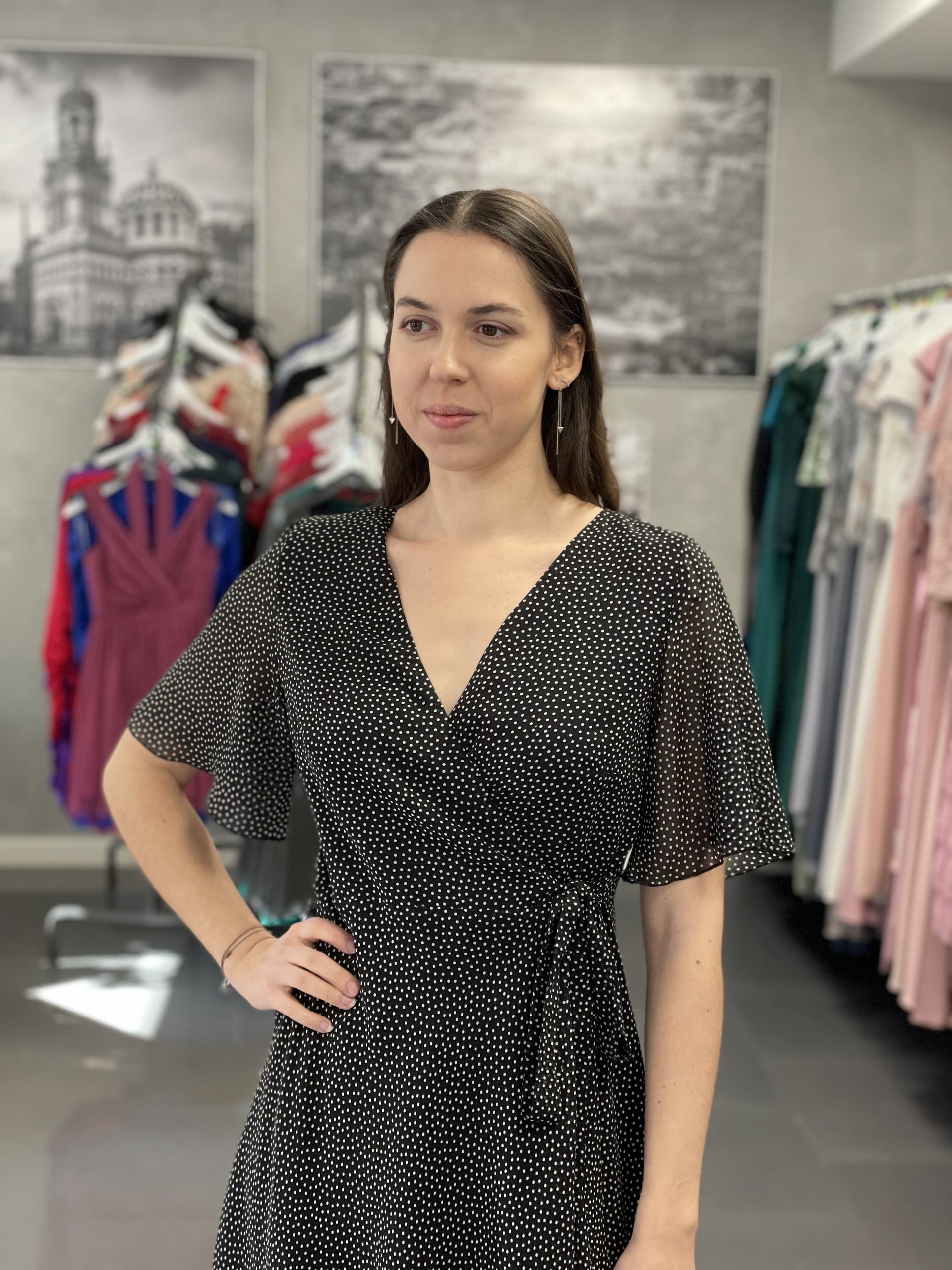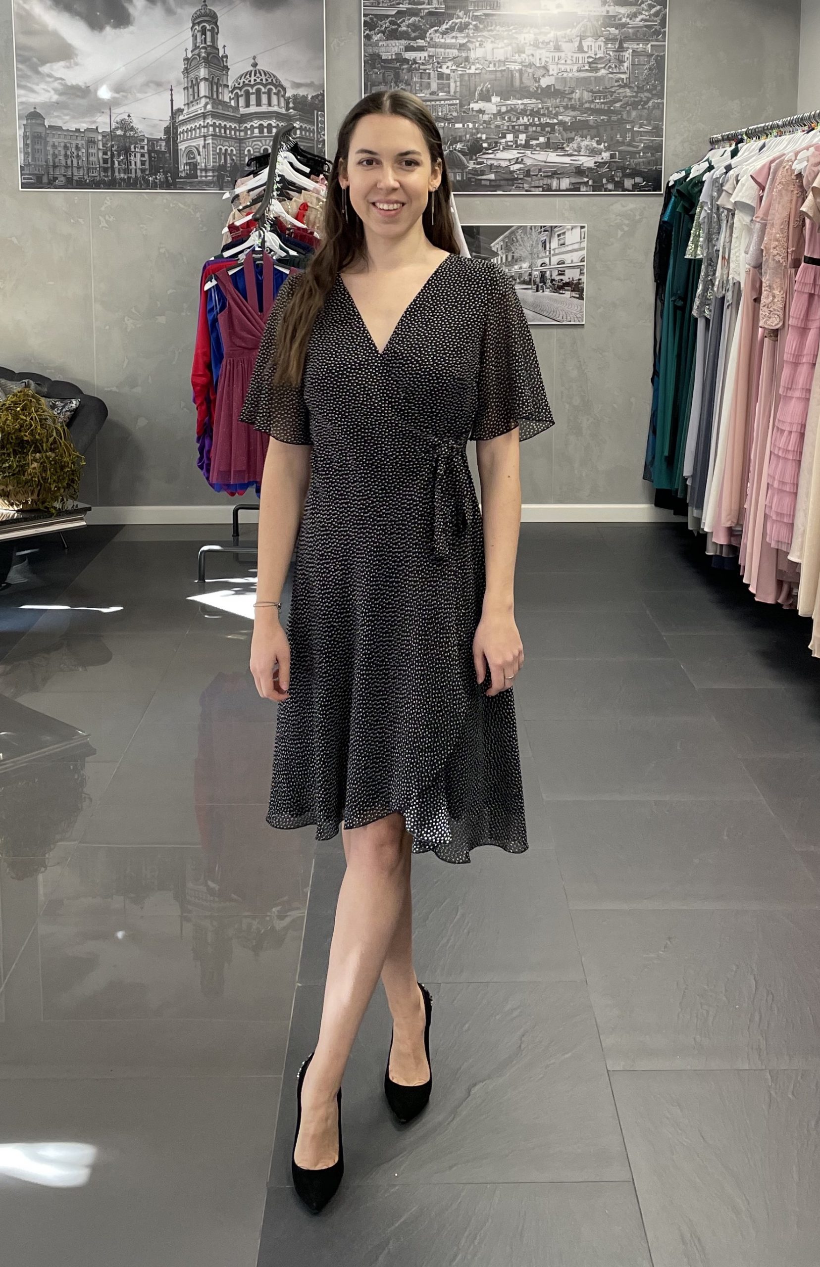 Czarna kopertowa sukienka w groszki. Sukienka modnej i wygodnej długości do kolana, wiązana kopertowo. Jedno wiązanie znajduje się po wewnętrznej stronie i pozwala na dopasowane sukienki w talii, drugie, zewnętrzne twarzy piękny, kopertowy krój. Delikatne, zwiewne rękawki. Lekko asymetryczne wykończenie optycznie wydłużające sylwetkę. Sukienka posiada wiskozową podszewkę, wykonana jest z wysokiej jakości szyfonu czarnego w drobne, jasne groszki.
