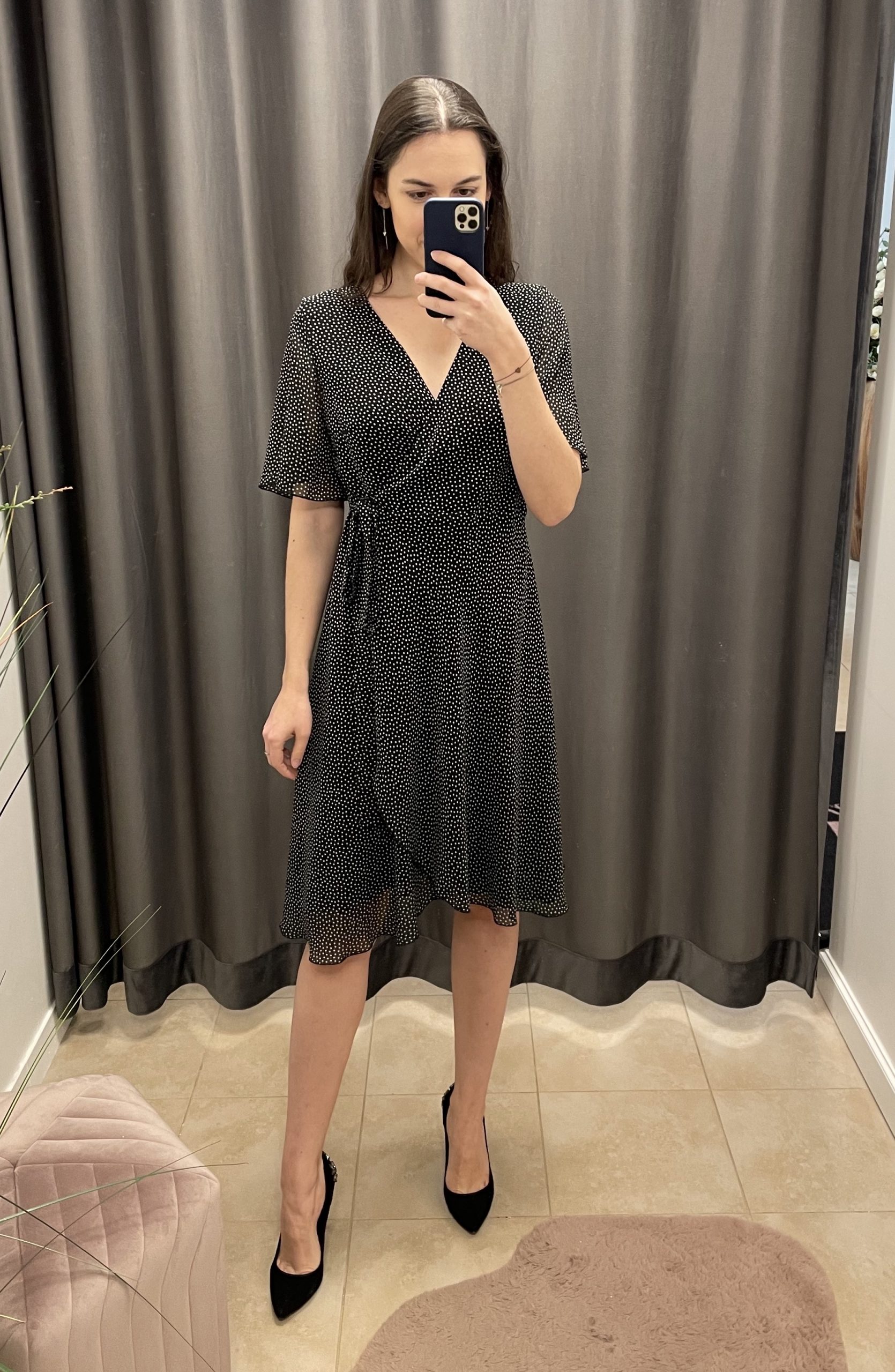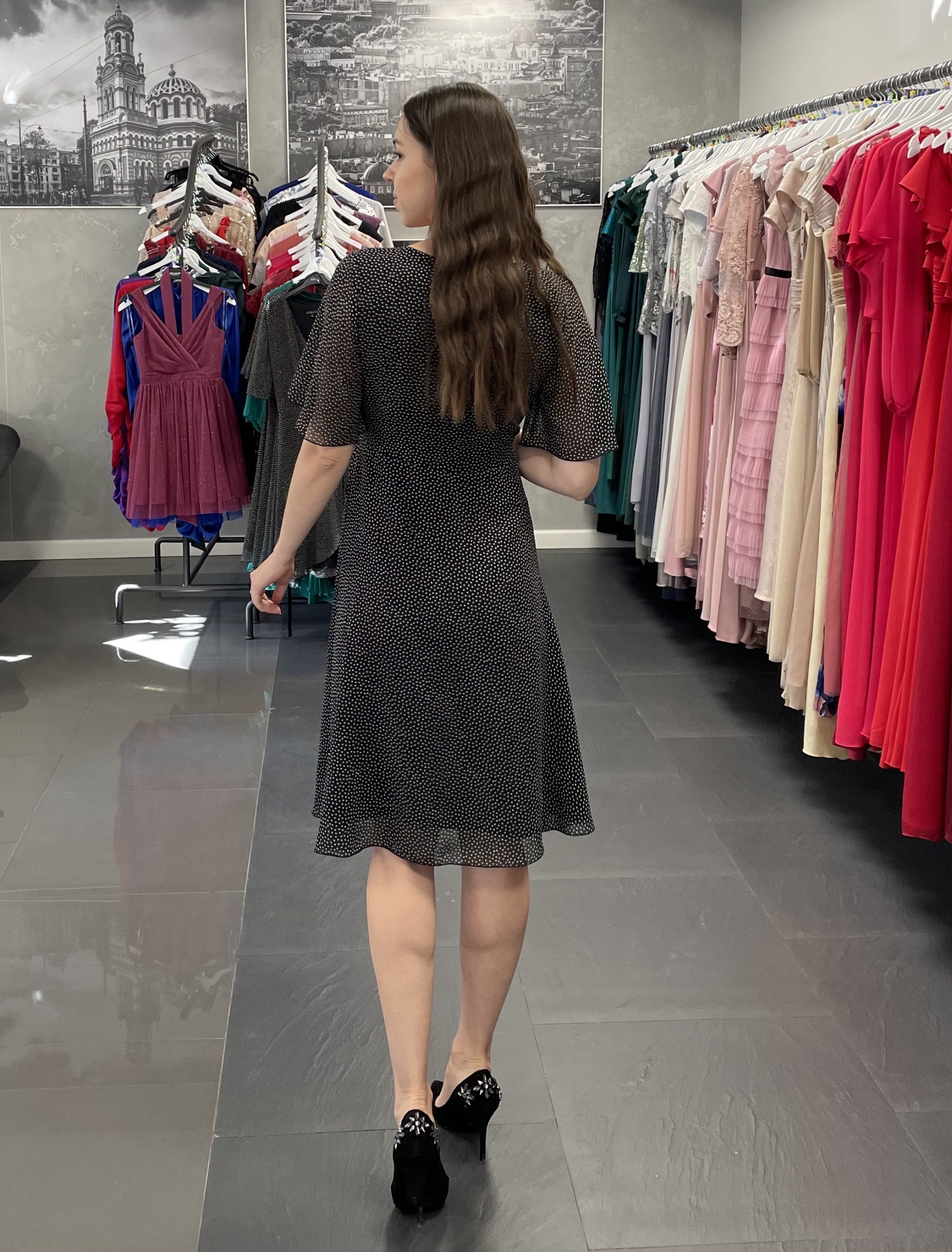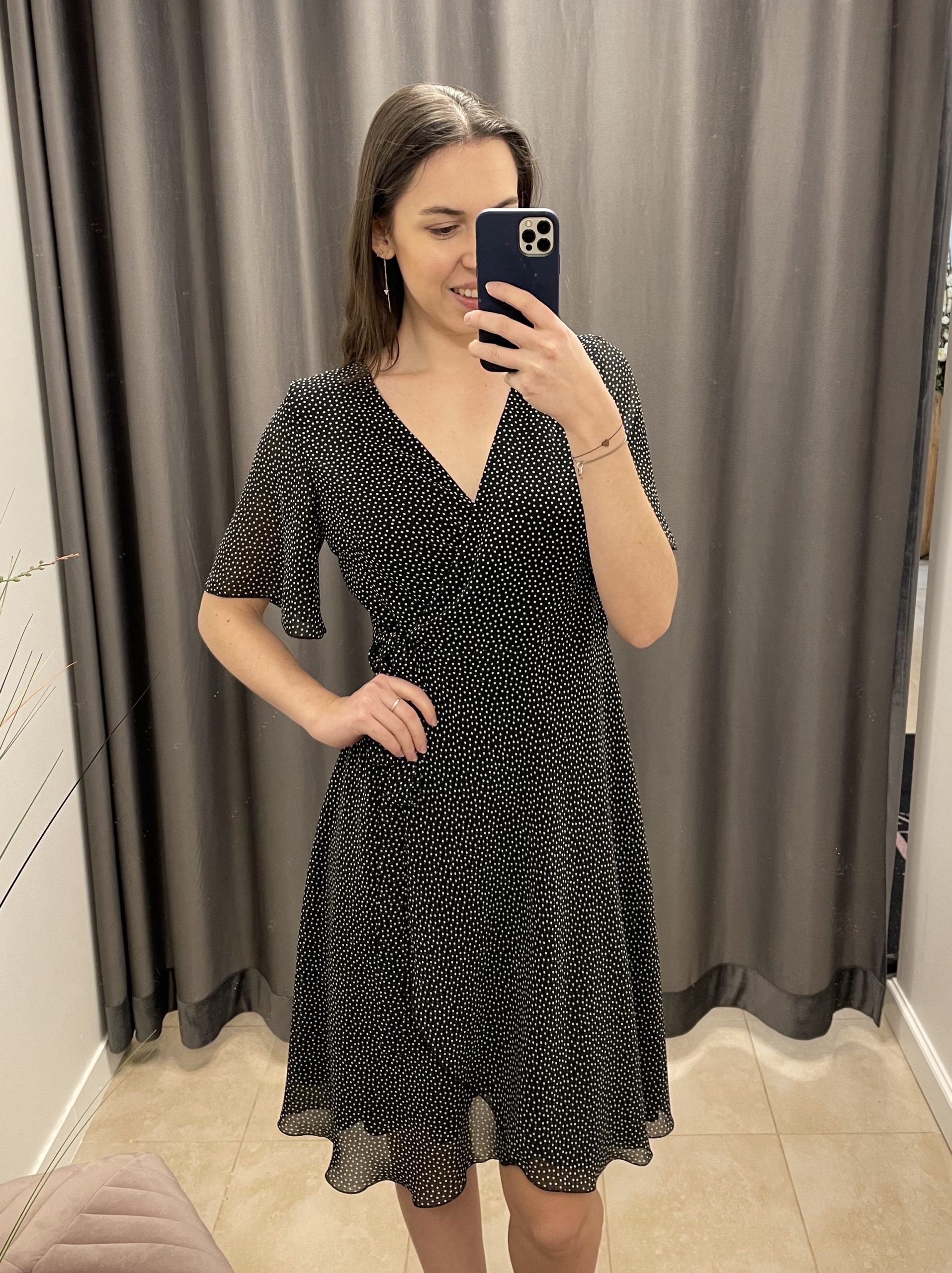 Czarna kopertowa sukienka w groszki. Sukienka modnej i wygodnej długości do kolana, wiązana kopertowo. Jedno wiązanie znajduje się po wewnętrznej stronie i pozwala na dopasowane sukienki w talii, drugie, zewnętrzne twarzy piękny, kopertowy krój. Delikatne, zwiewne rękawki. Lekko asymetryczne wykończenie optycznie wydłużające sylwetkę. Sukienka posiada wiskozową podszewkę, wykonana jest z wysokiej jakości szyfonu czarnego w drobne, jasne groszki.
