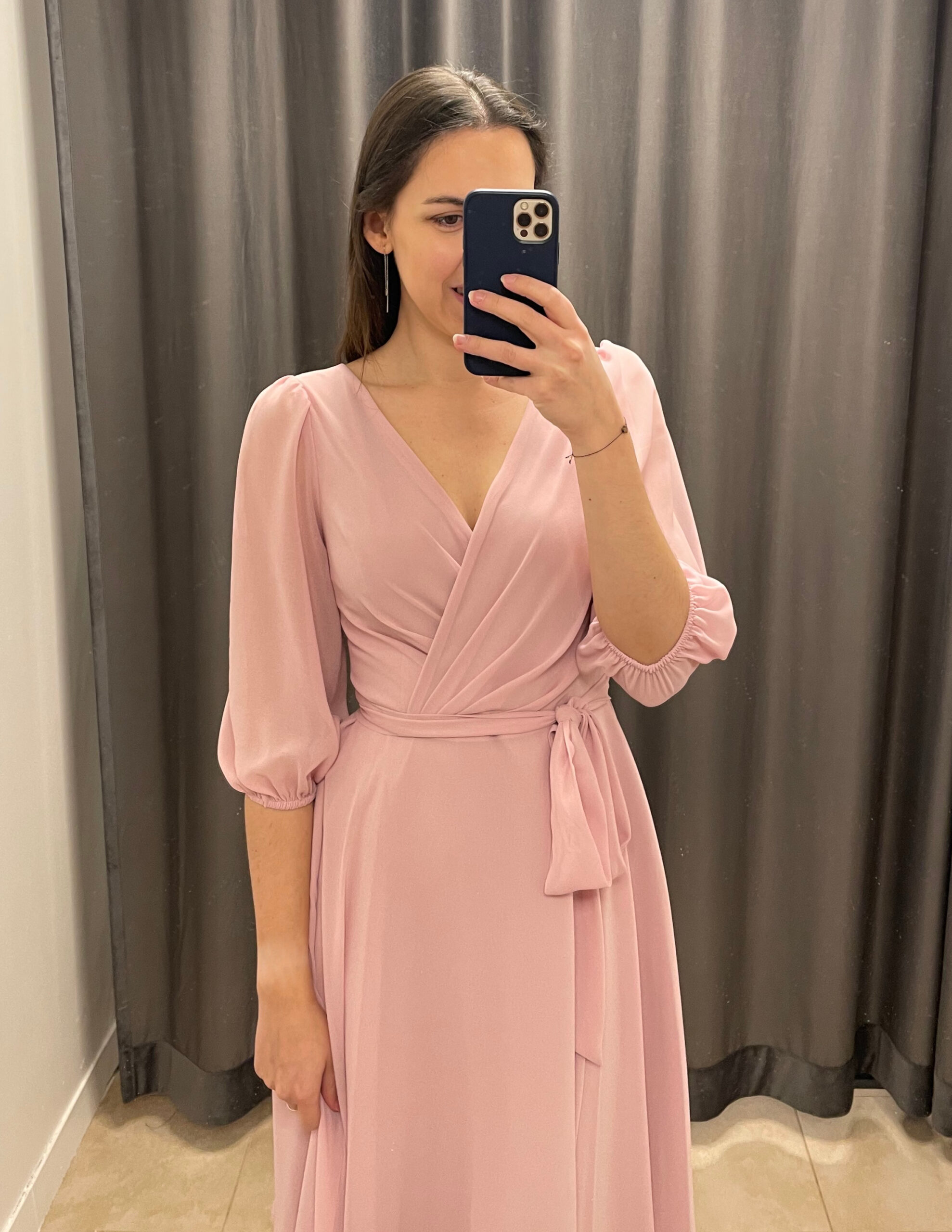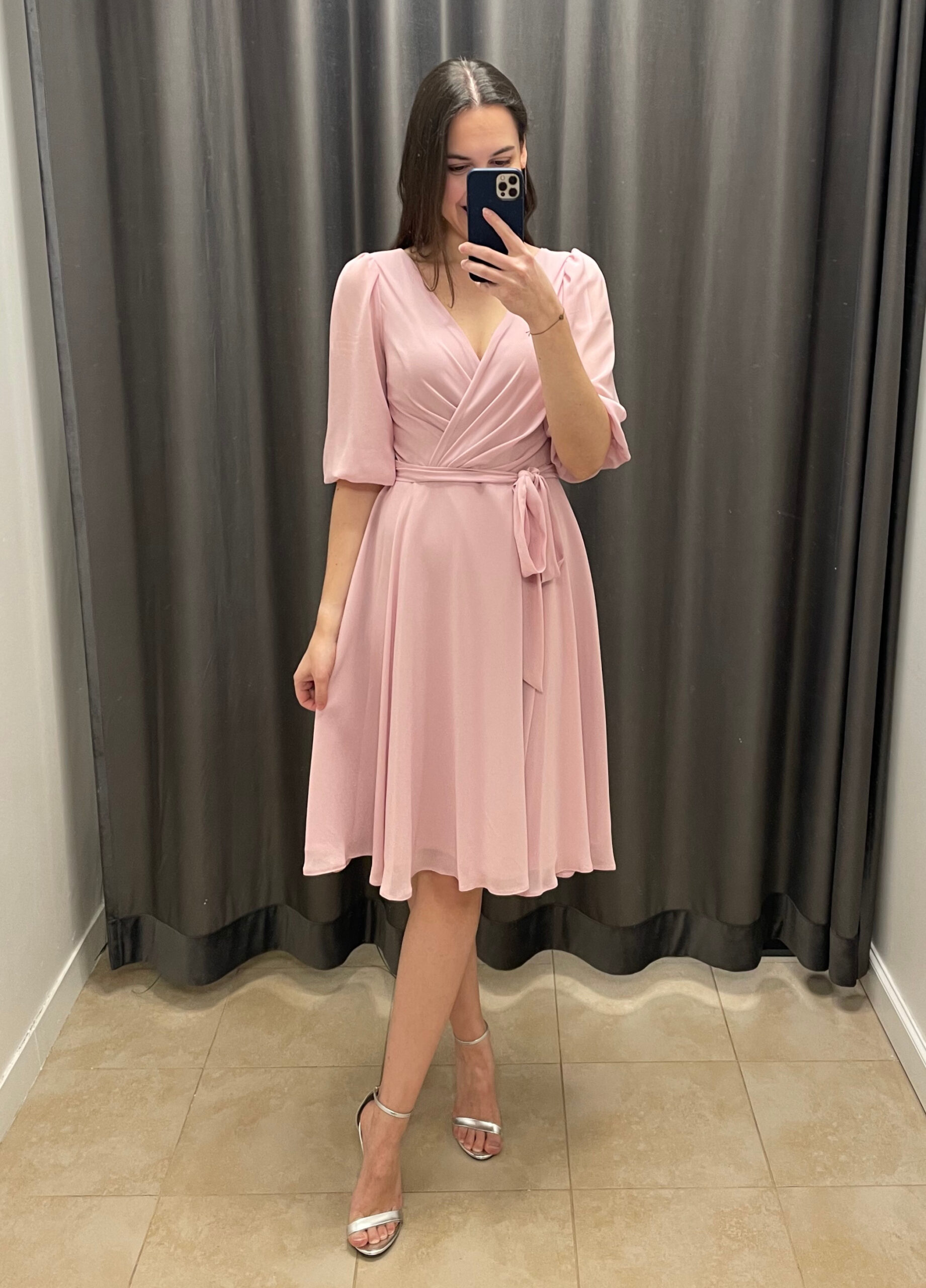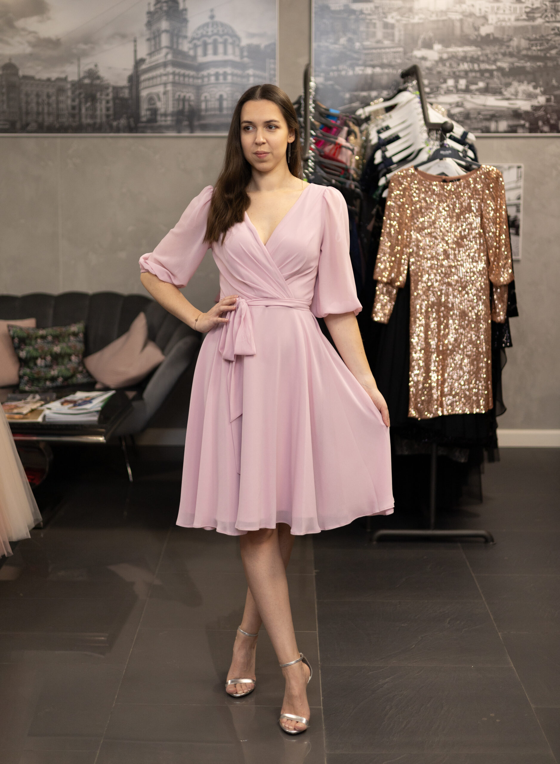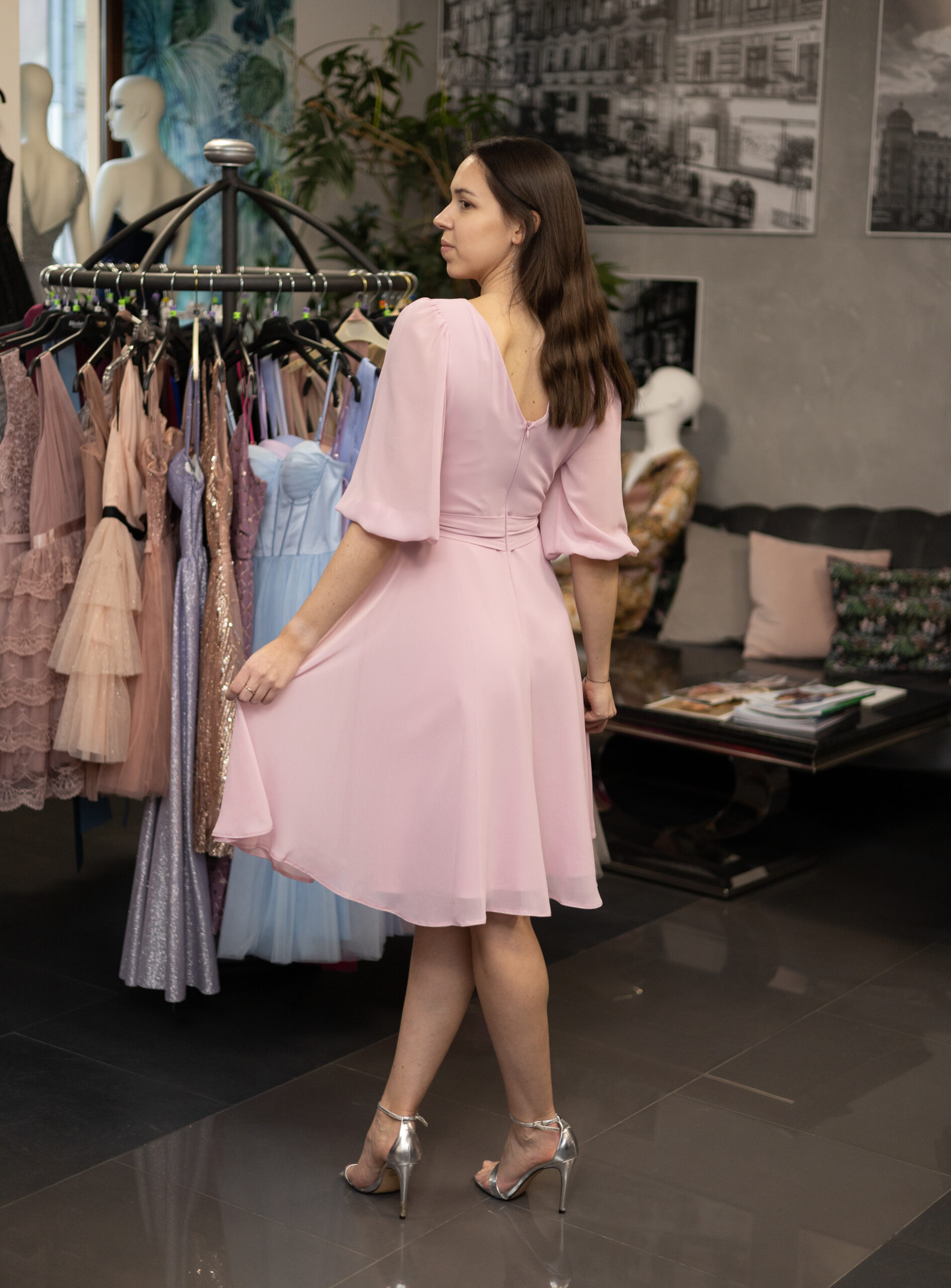 Krótka, zwiewna szyfonowa sukienka z rękawkiem. Sukienka posiada dekolt w literę V zarówno z przodu, jak i na plecach. Rękawek długości do łokcia jest wykończony gumką. Sukienka jest odcinana w talii i posiada cienki materiałowy paseczek wszyty z tyłu przy zamku. Zapinana z tyłu na kryty zamek. Została uszyta z wysokiej jakości szyfonowego materiału, jest zwiewna, na cięższej podszewce, dzięki czemu pięknie wiruje i układa się w ruchu