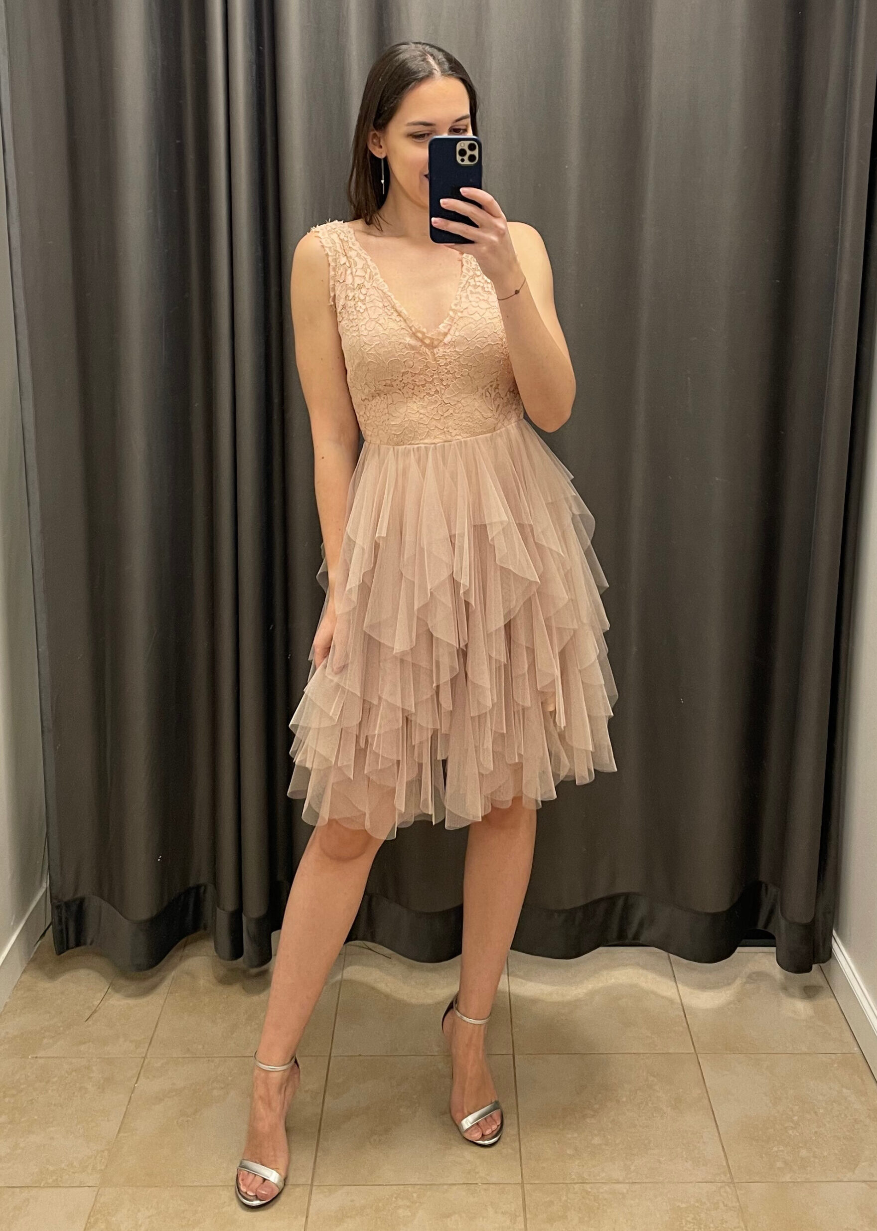Beżowa tiulowa sukienka z koronką na grubszych ramiączkach. Góra dopasowana, koronkowa. Wszyte miseczki i dekolt w literę V pięknie eksponują biust. Sukienka posiada szerokie ramiączka. Odcięcie w pasie. Modna i wygodna długość do kolana. Dół tiulowy, rozkloszowany, z efektownymi falbankami. Całość została wykonana z przyjemnego w dotyku, lekkiego materiału.