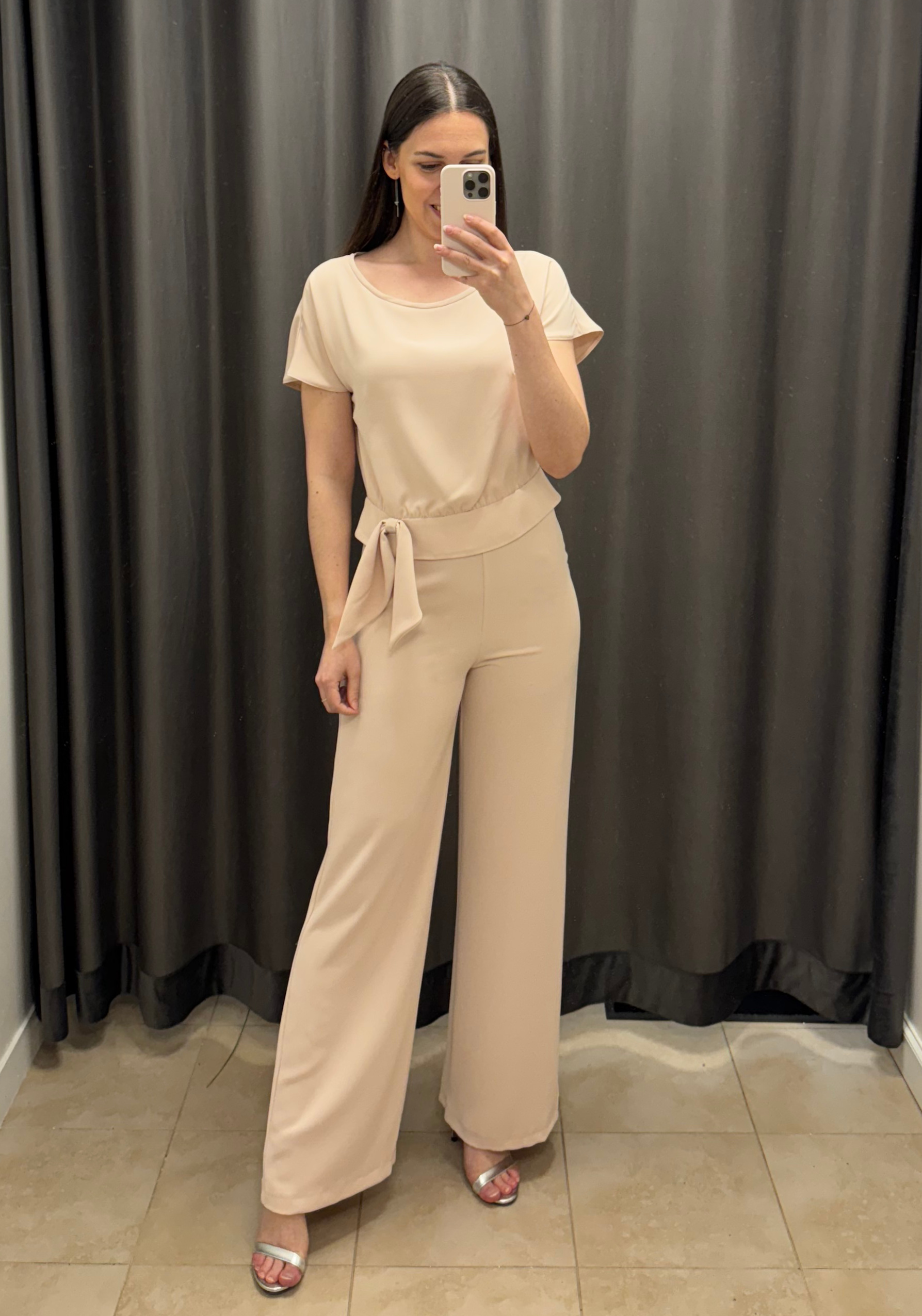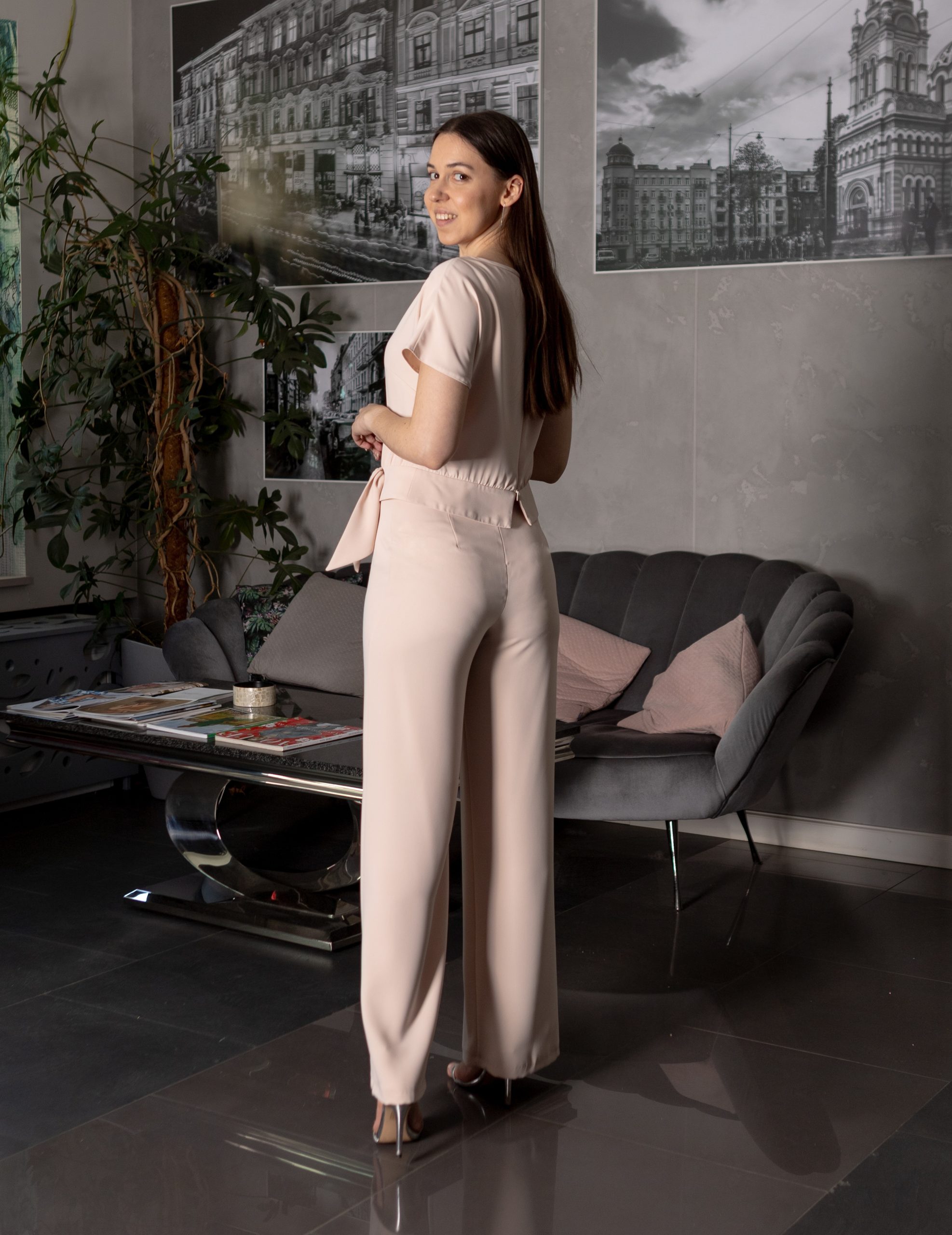Komplet Silo to połączenie sportowego stylu i elegancji. Zestaw daje efekt kombinezonu, ale jego elementy spokojnie można nosić osobno w codziennych stylizacjach. Bluzkę wykorzystasz do jeansów, eleganckich spodni. Spodnie idealnie sprawdzą się zarówno do pracy jak i na letnie wyjścia. W ciepłym, delikatnym beżu idealnie sprawdzi się na imprezy okolicznościowe takie jak chrzciny czy komunia. Wręcz idealna dla mamy komunijnej.