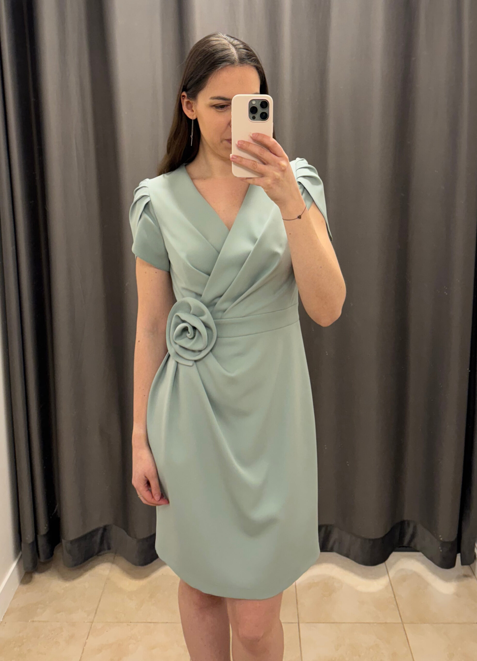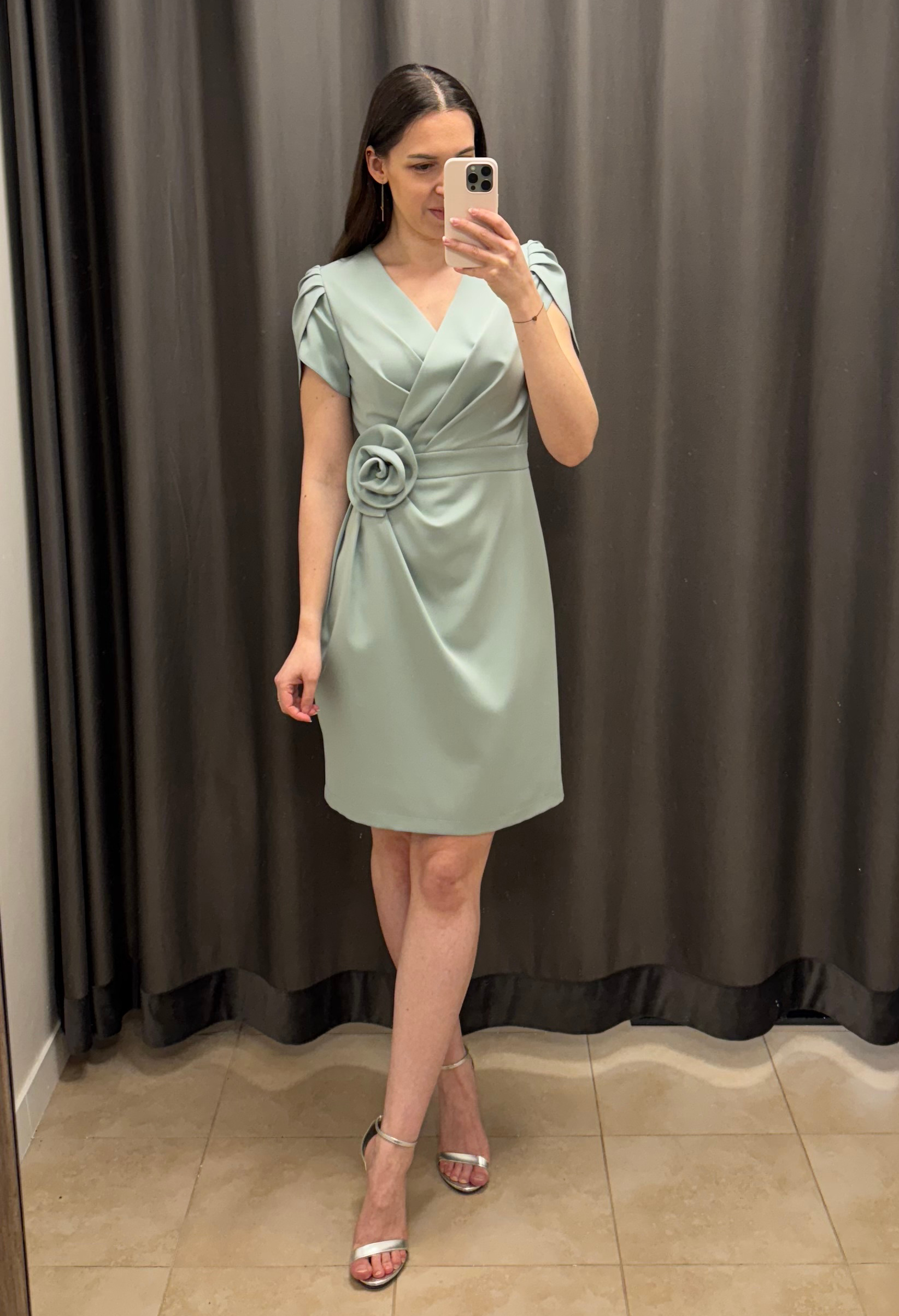 Ponadczasowa ołówkowa sukienka z krótkim rękawkiem w przepięknym, szałwiowym, pistacjowym kolorze. Nie za duży dekolt na zakładkę, w literę V z eleganckim drapowaniem. Sukienka posiada krótki rękawek z zakładką lekko otulający ramiona. Ozdobne drapowanie w talii, które wyszczupla i optycznie ją zwęża zostało dodatkowo podkreślone przy pomocy ozdobnej, odpinanej broszki w kształcie róży. Dół ołówkowy, dopasowany, z marszczeniami ukrywającymi niedoskonałości figury. Z tyłu zapinana na zamek.